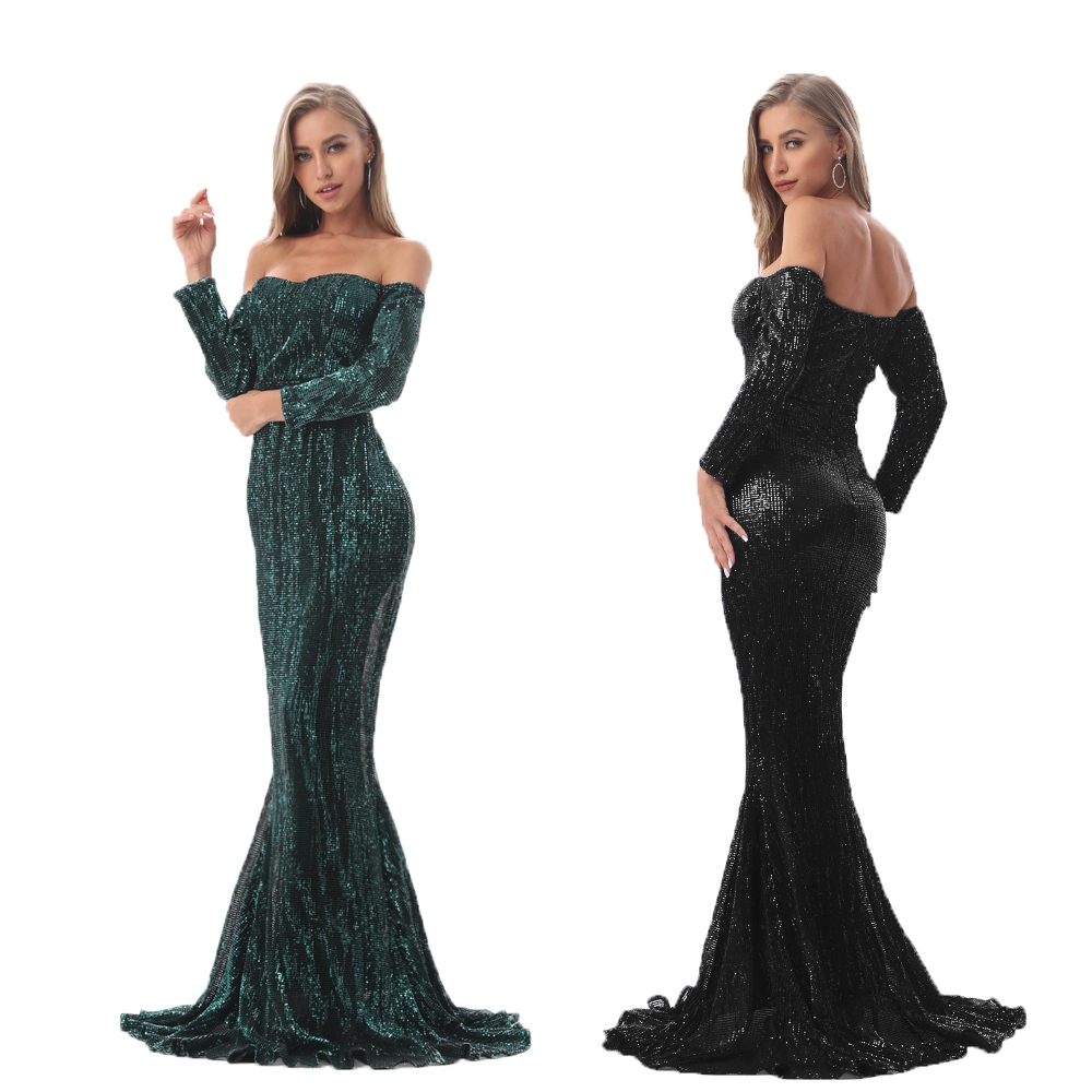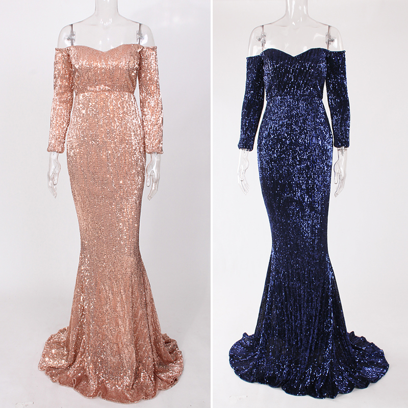 Fleepmart Sequined Off The Shoulder Maxi Dresses Floor Length Party Dresses Champagne Gold Navy Blue