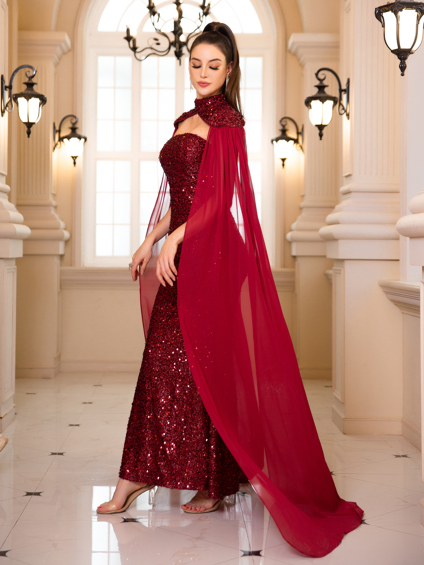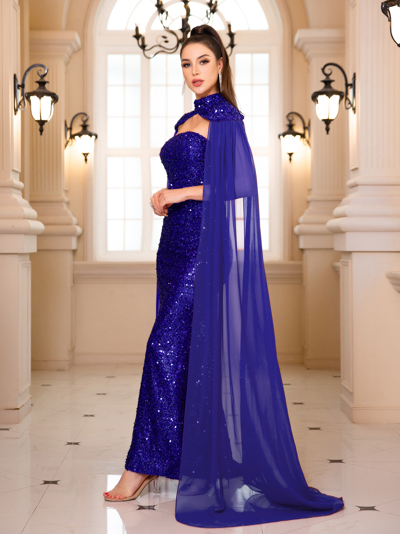 fleepmart Sequined Strapless Evening Maxi Dress Chiffon Flying Sleeve Luxury Halter Backless Prom Gown for WomenThere are no reviews yet
