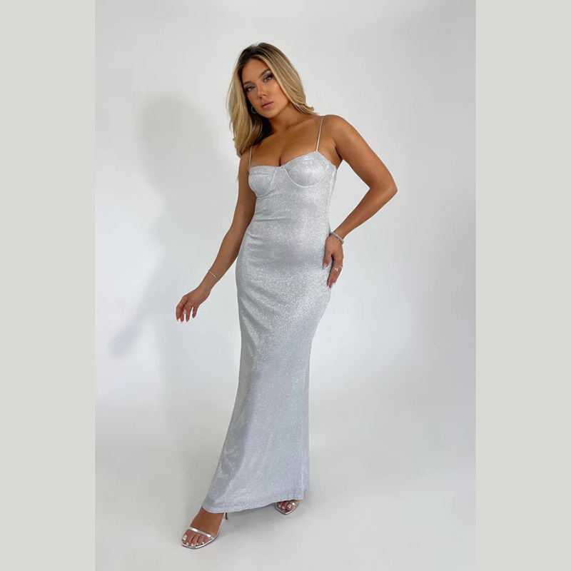 Fleepmart Sequins Wrap Bust Sleeveless Bodycon Slip Dress Women Sexy Backless Bright silk Spaghetti Strap Slim Long Dress