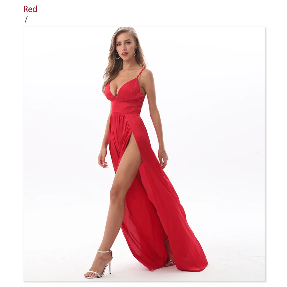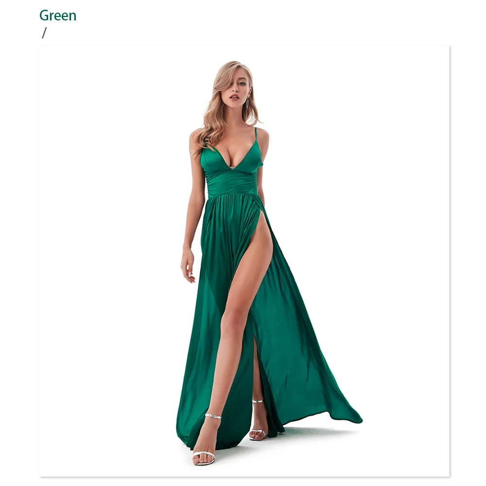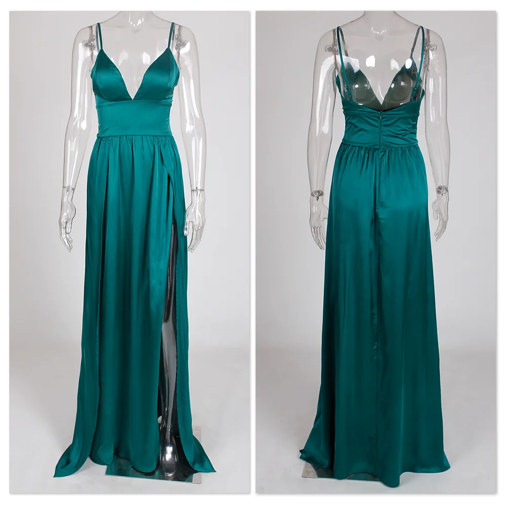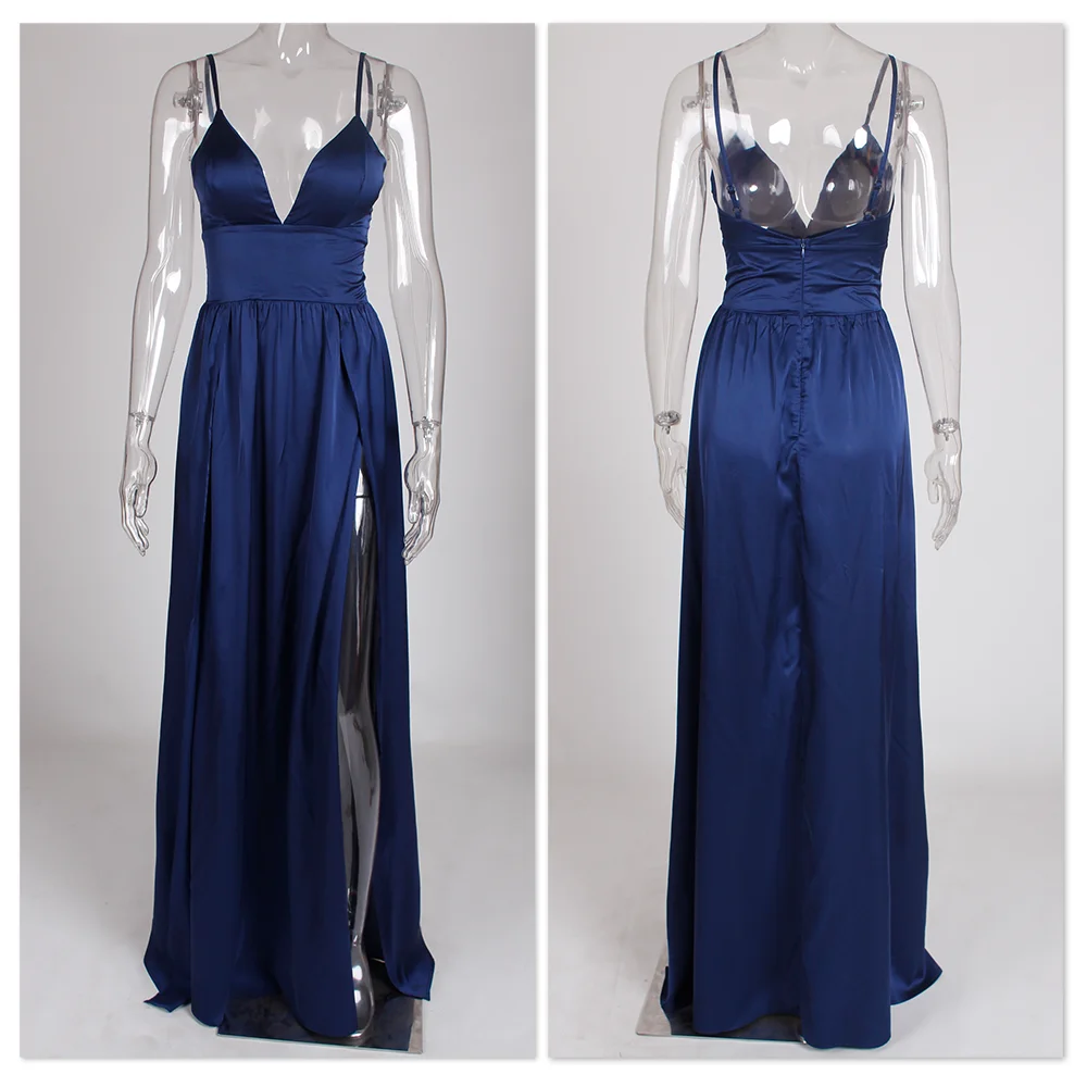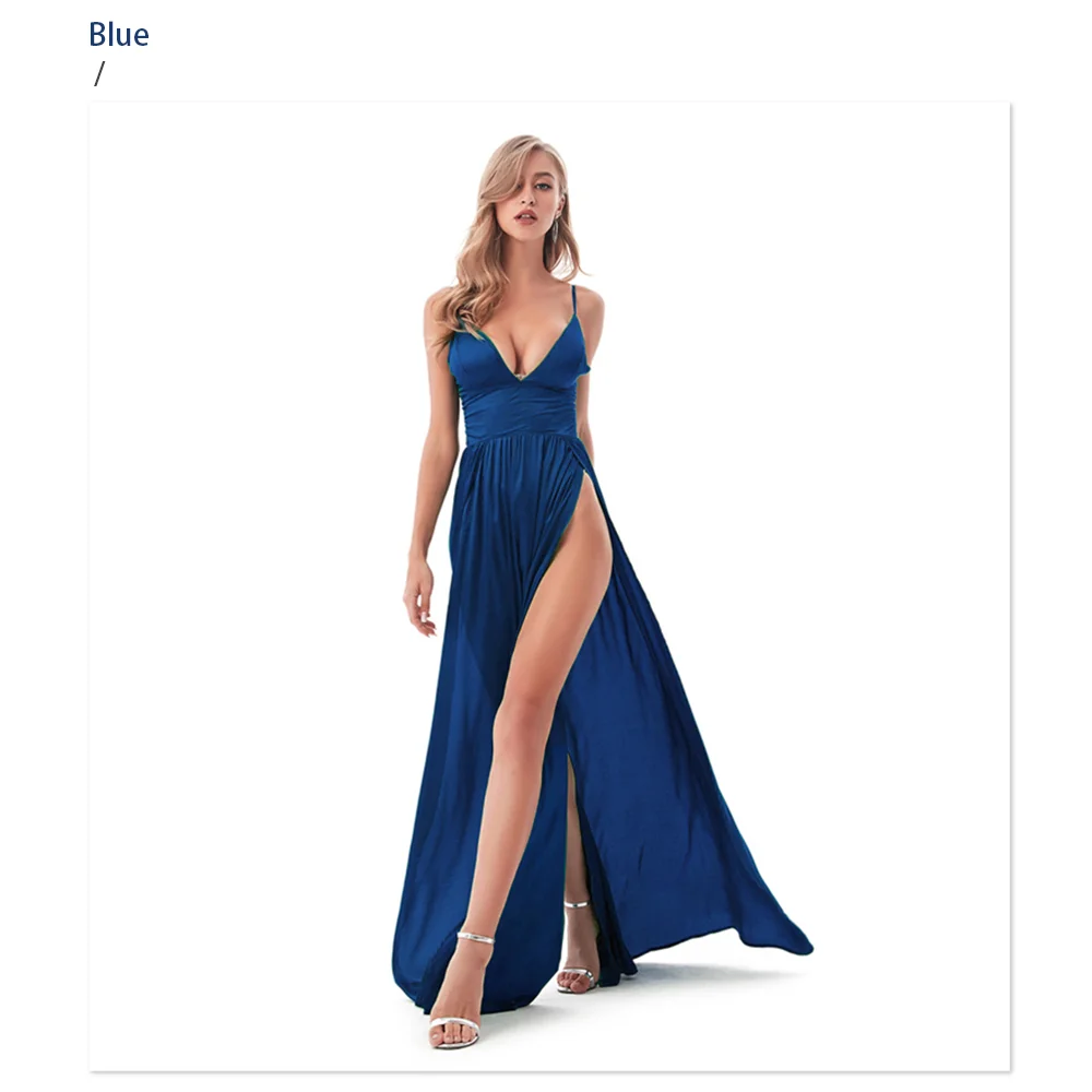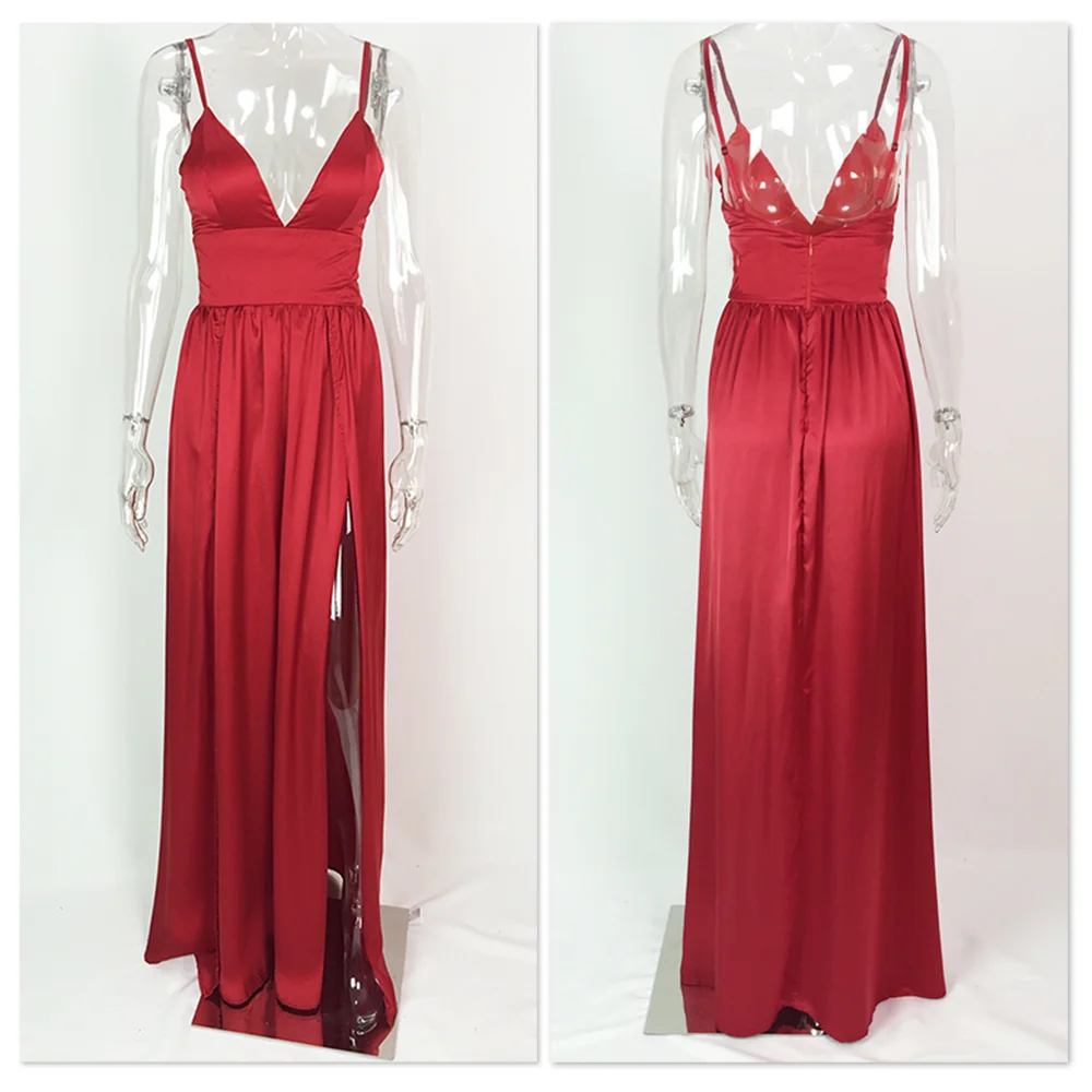 Fleepmart Sexy 2 Legs Split Women’s Dress Satin Evening Party Sleeveless V Neck Padded Straps Backless Red Green Navy Blue Summer