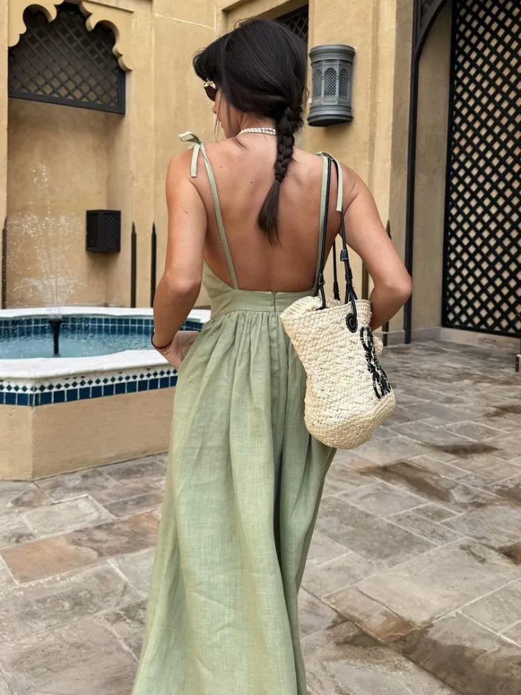 Fleepmart Sexy Backless Beach Dress For Women V Neck Splice Folds Long Dresses Womens Party Elegant Bandage Maxi Sundress Female