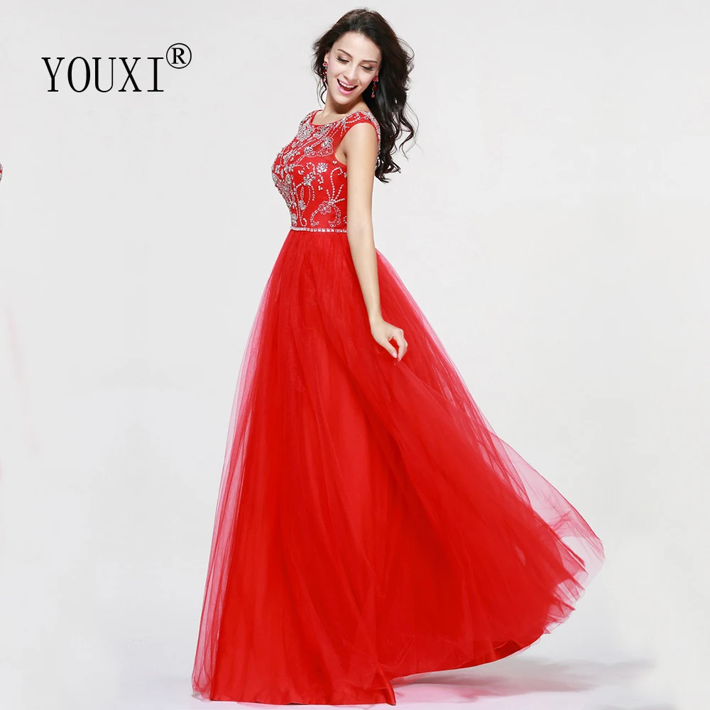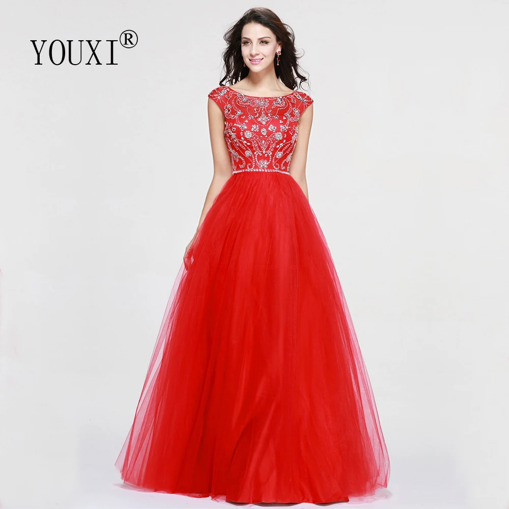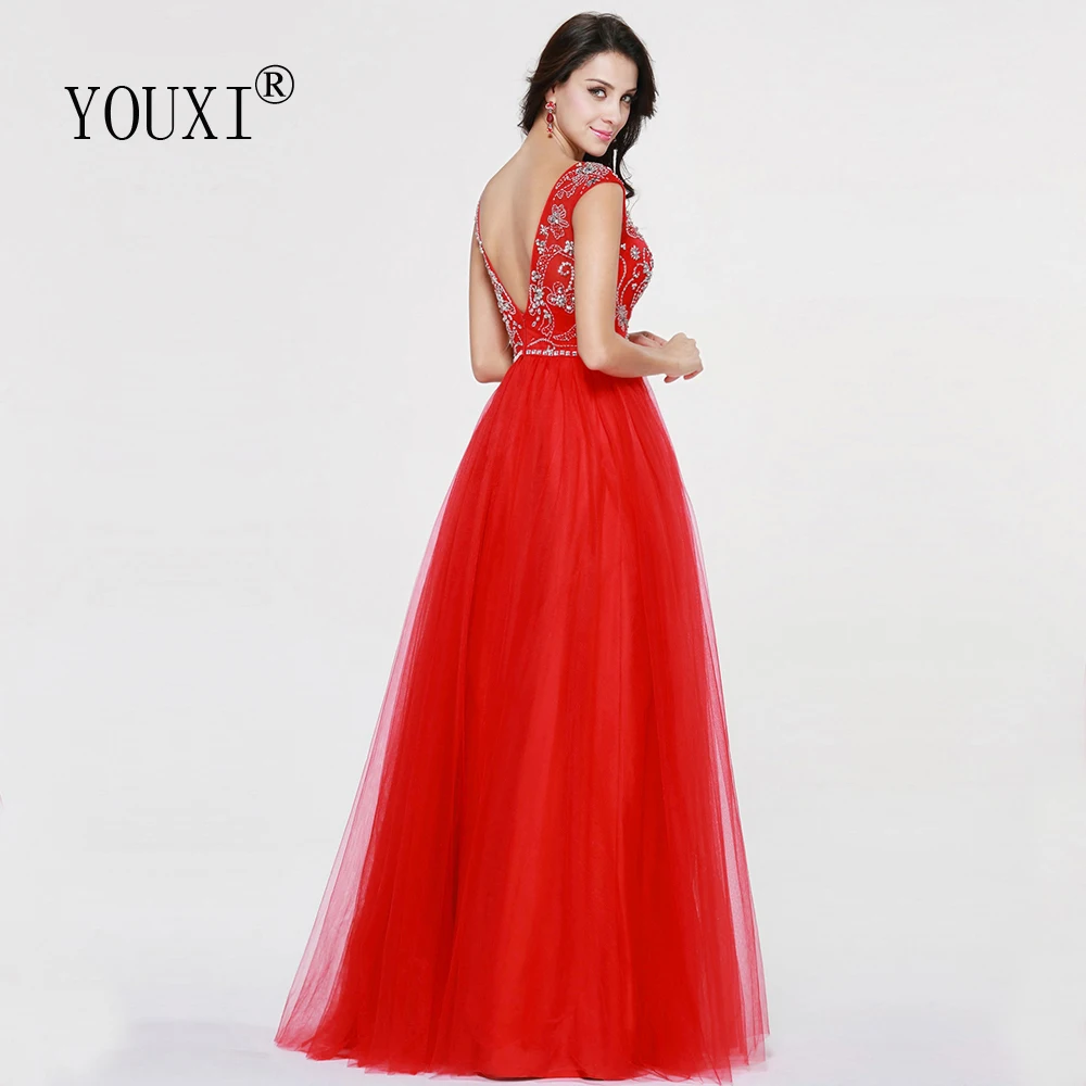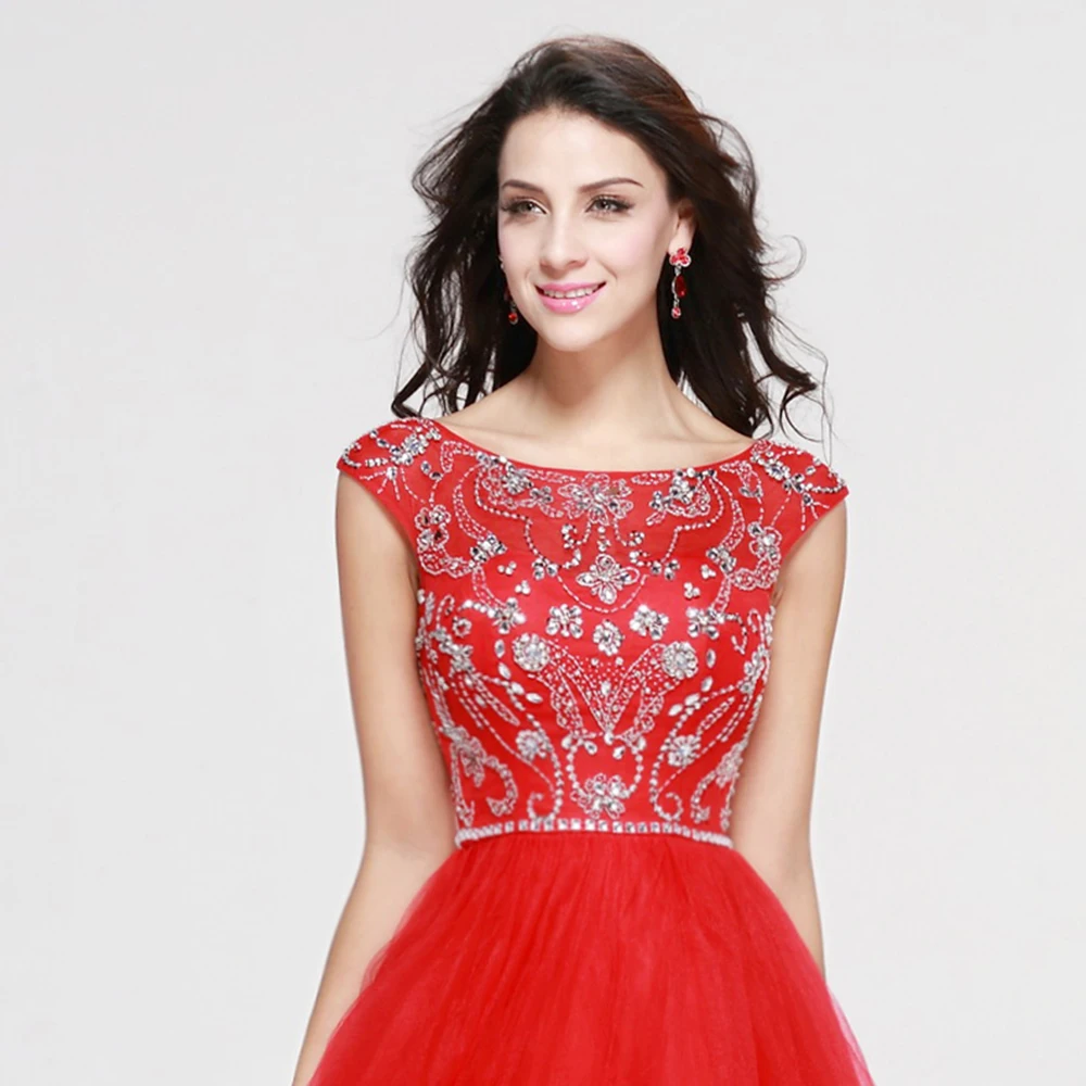 Sexy Backless Prom Dresses Long 2019 Red Tulle Beaded Silver Crystal A-Line Cap Sleeves Vestidos de Gala