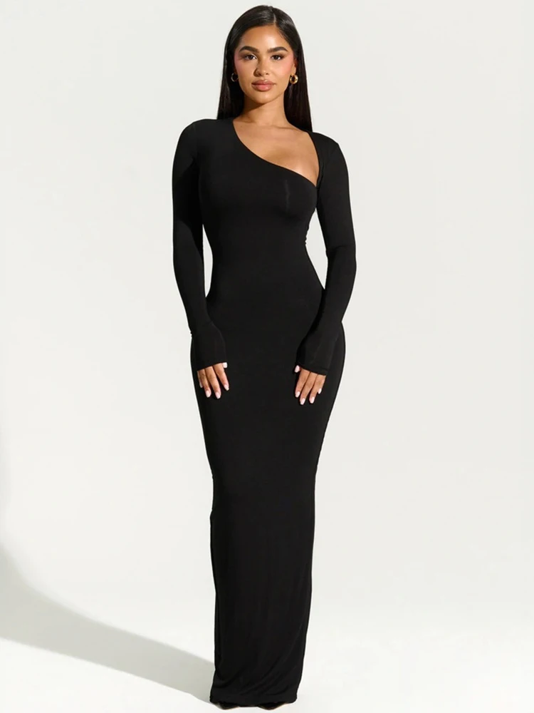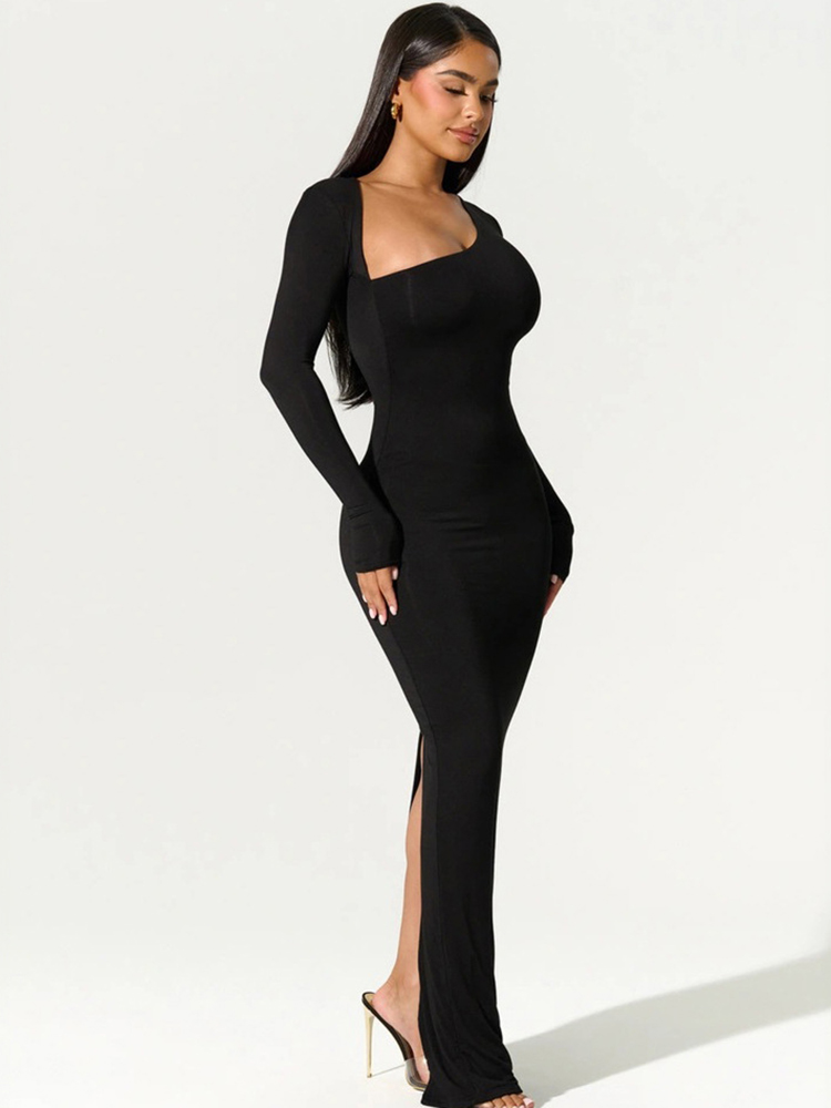 Fleepmart Sexy Black Evening Party Dress Women Elegant Fall Winter Outfits Asymmetrical Long Sleeve Night Club Party Split Maxi Dresses