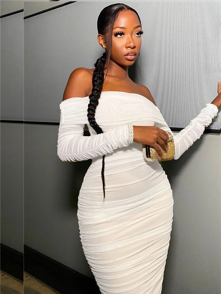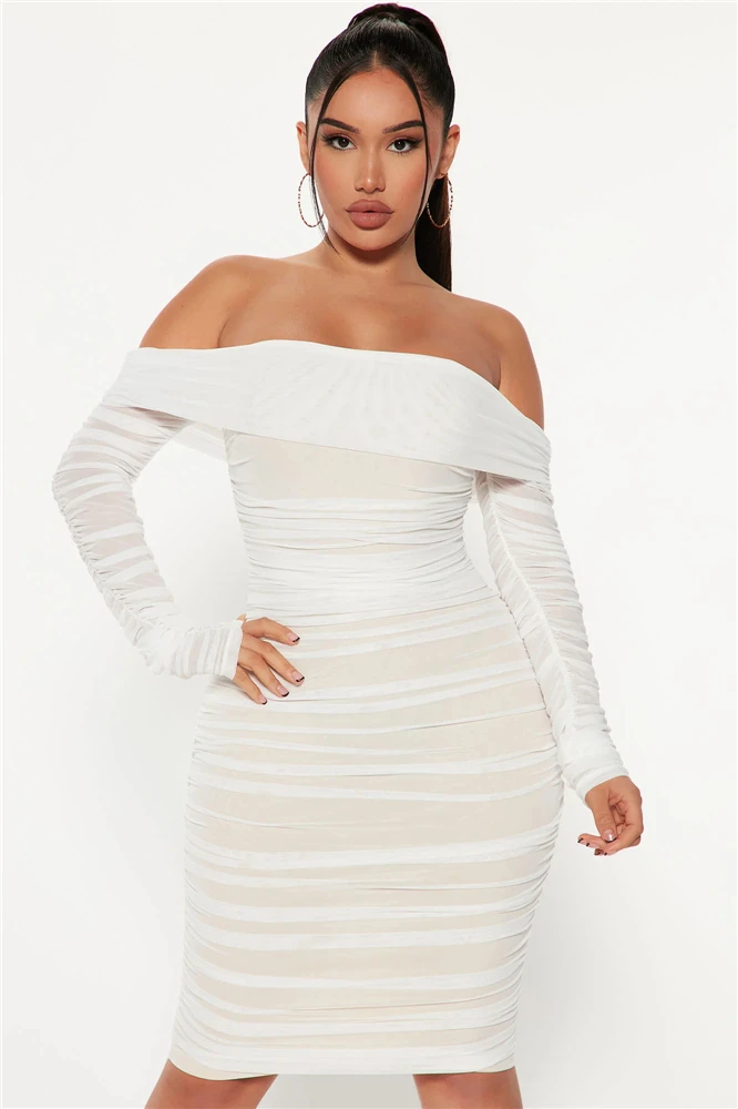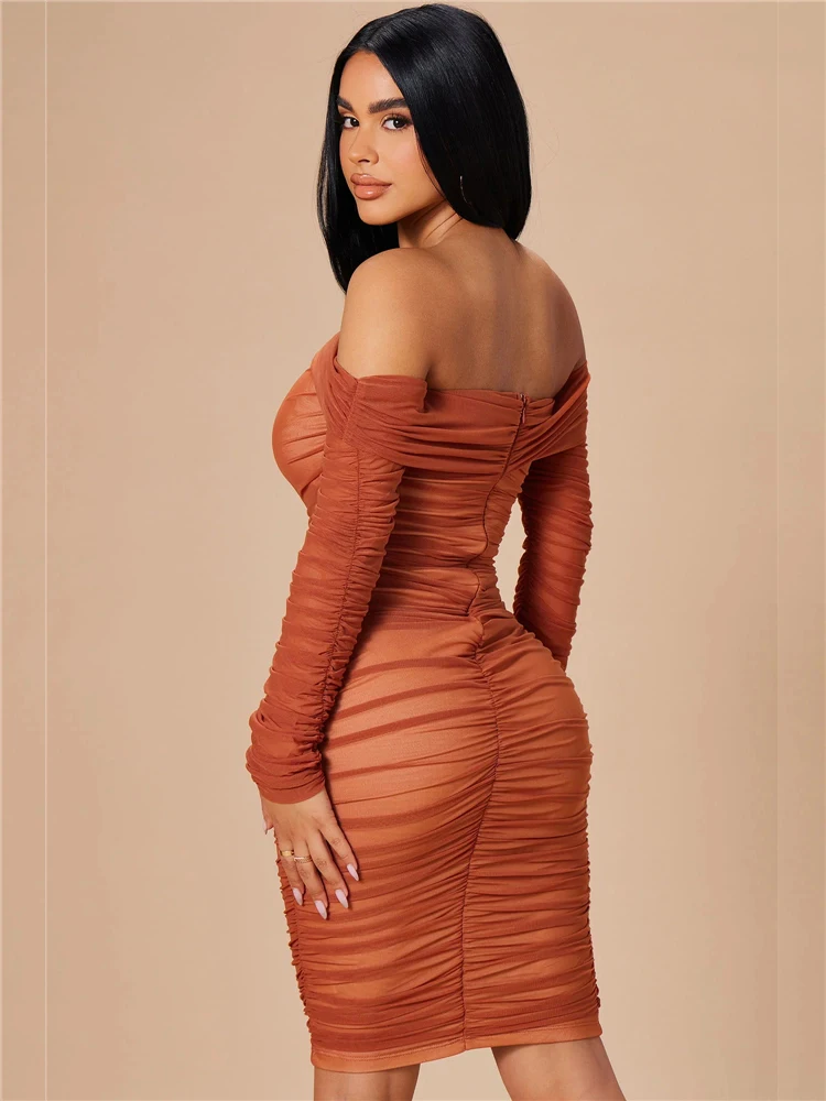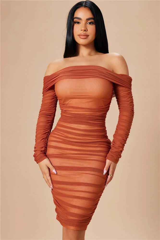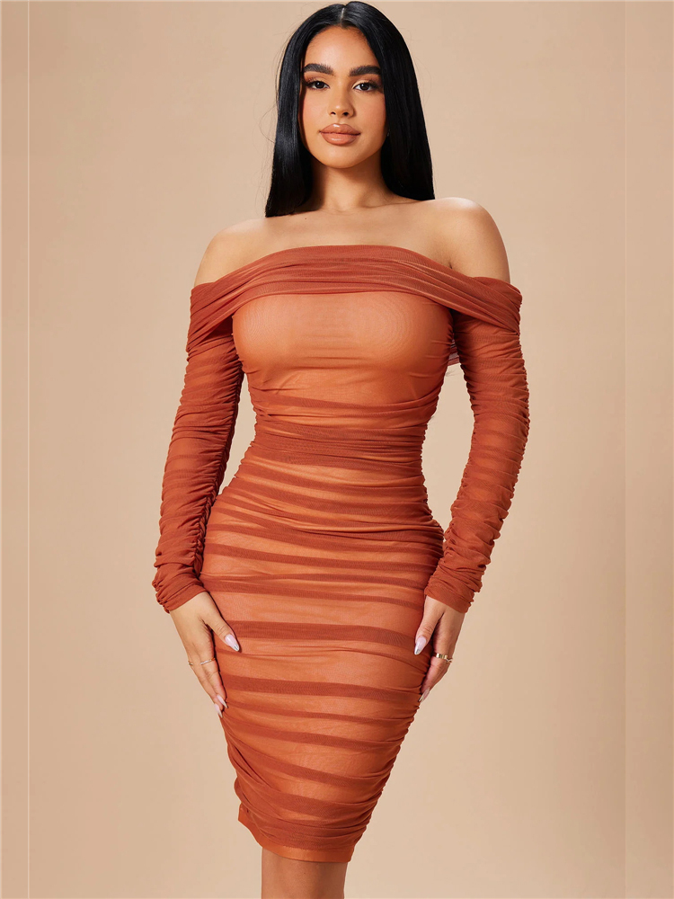 Fleepmart Elegant Beautiful Womens Sexy Off Shoulder Sheer Mesh Long Sleeve Party Midi Christmas Dress