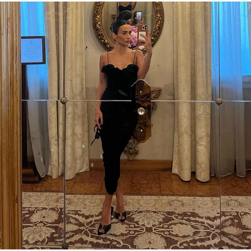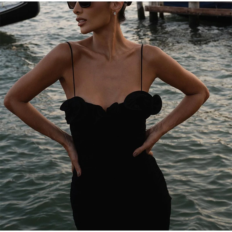 Fleepmart Sexy Black Ruffle Edge Bodycon Long Women High Waist Sling Dress Beach Club Party Robes