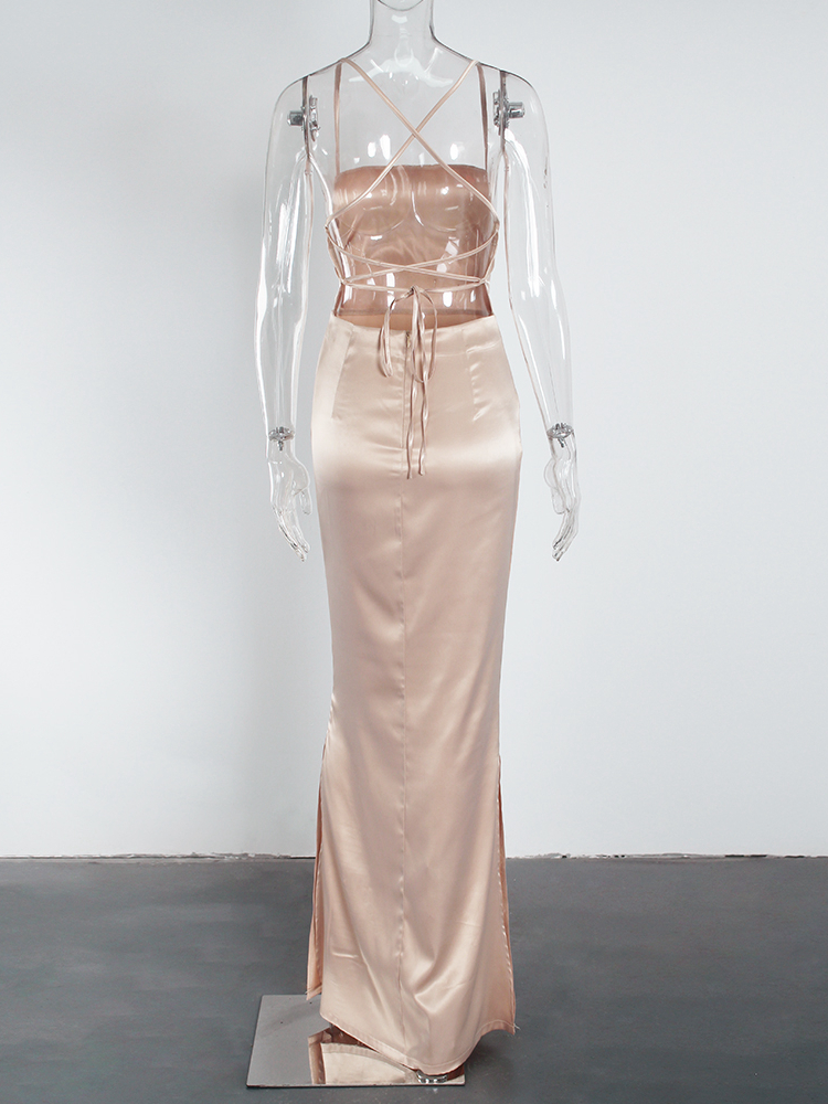Fleepmart Sexy Champagne Summer Long Satin Maxi Dress Side Slits Backless Lace Up Square Neck SleevelessThere are no reviews yet