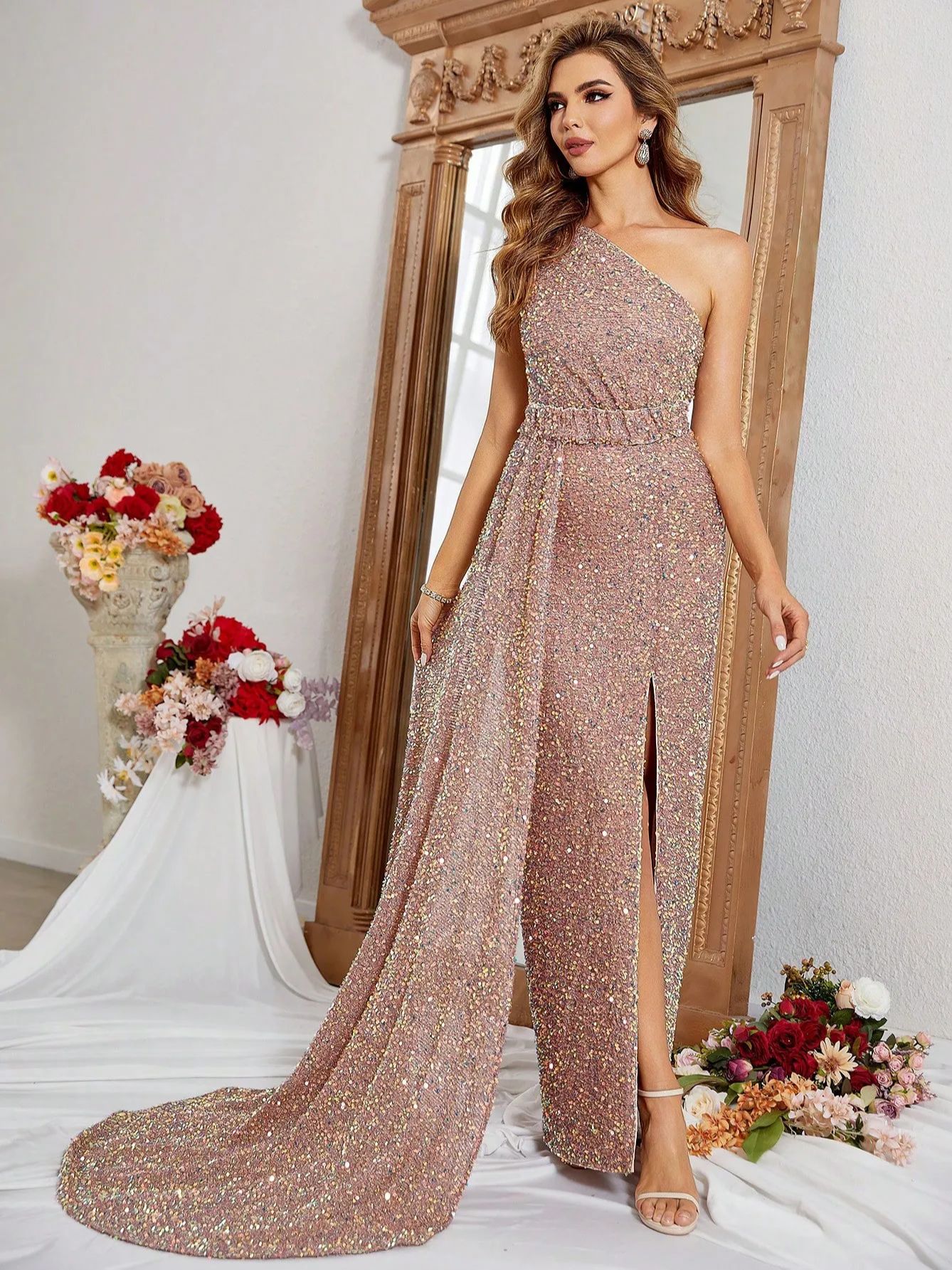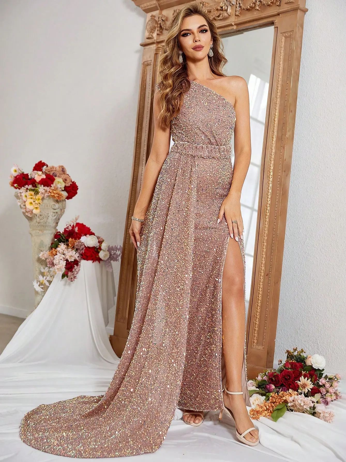 Fleepmart Sexy Diagonal Neck Sleeveless Slim Fit Sequin Slit Evening Maxi DressFleepmart Sexy Diagonal Neck Sleeveless Slim Fit Sequin Slit Evening Maxi Dress