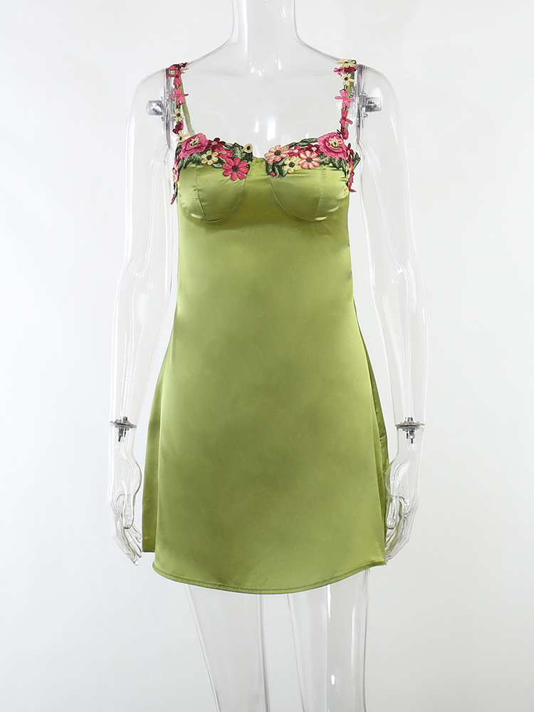 Fleepmart Sexy Embroidered Lace Satin Hip Bodycon Dress Women’s Summer Floral Satin Slip Dress Vacation Elegant Clubwear 2023