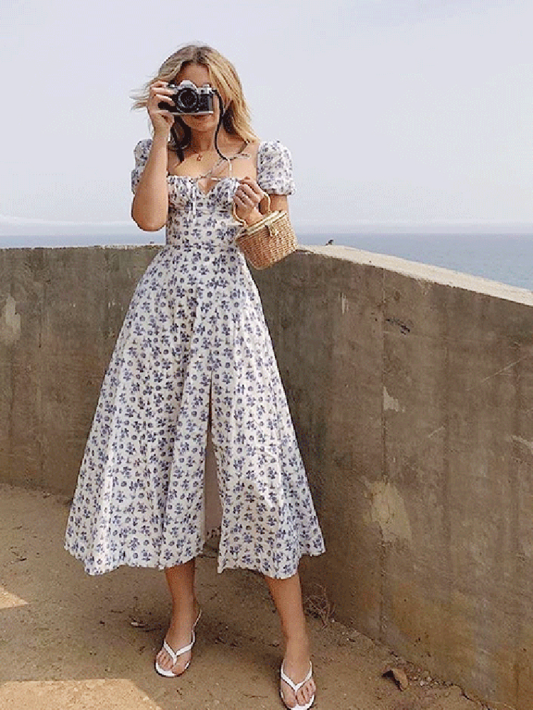 Fleepmart Sexy Floral Midi Dresses Summer Skims Women Folds Lace Up Square Collar Puff Sleeve Split Evening Elegant Party Robe