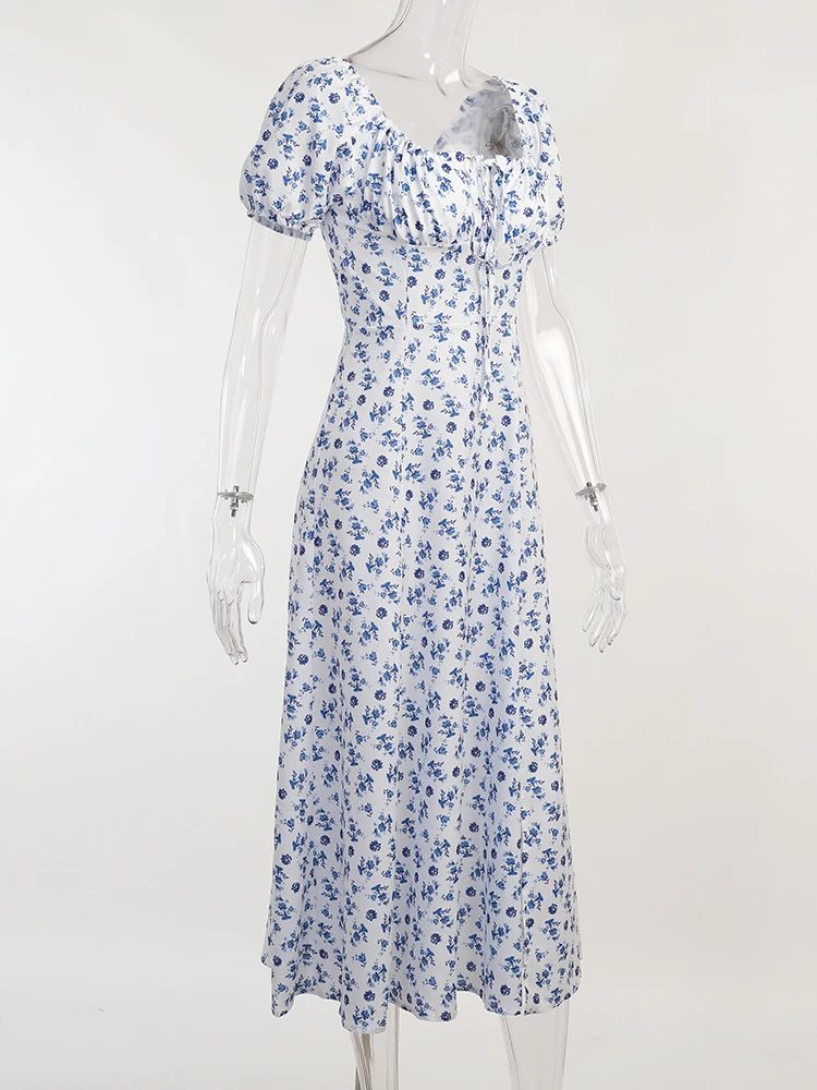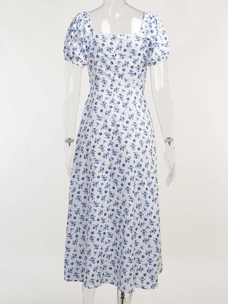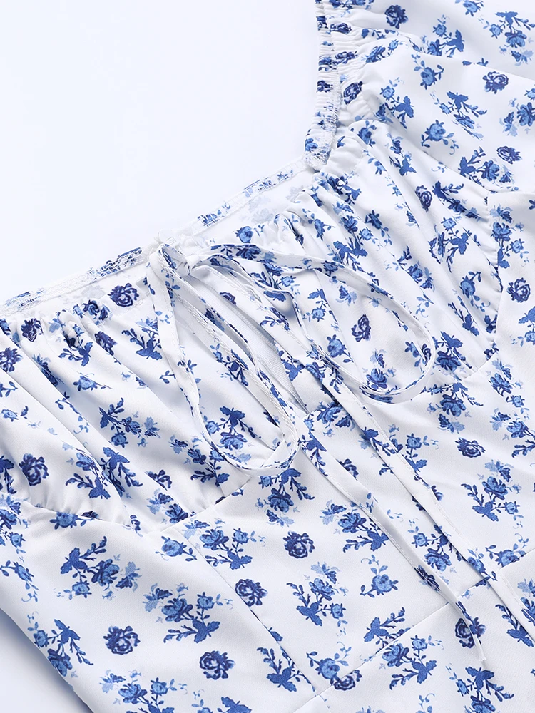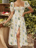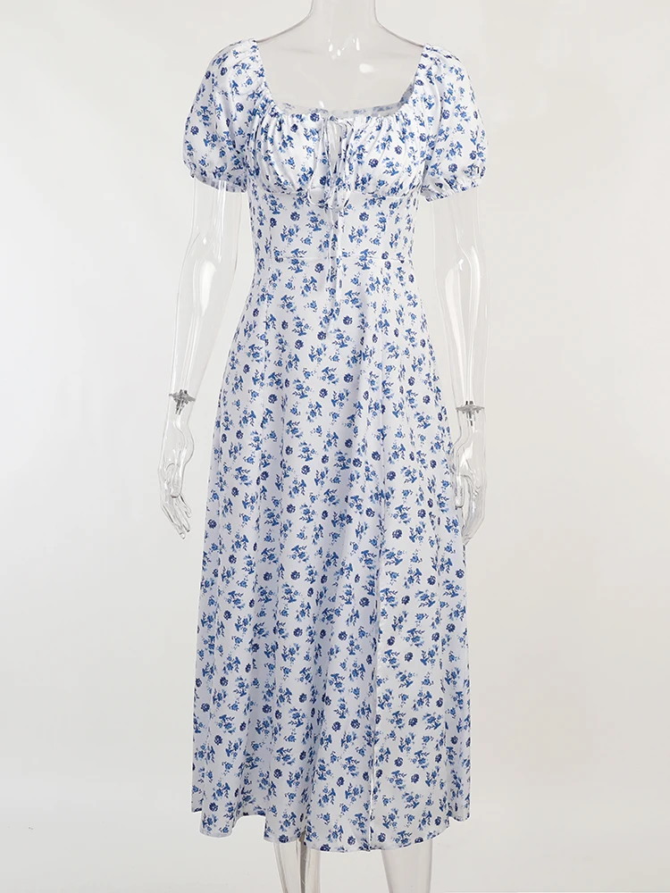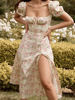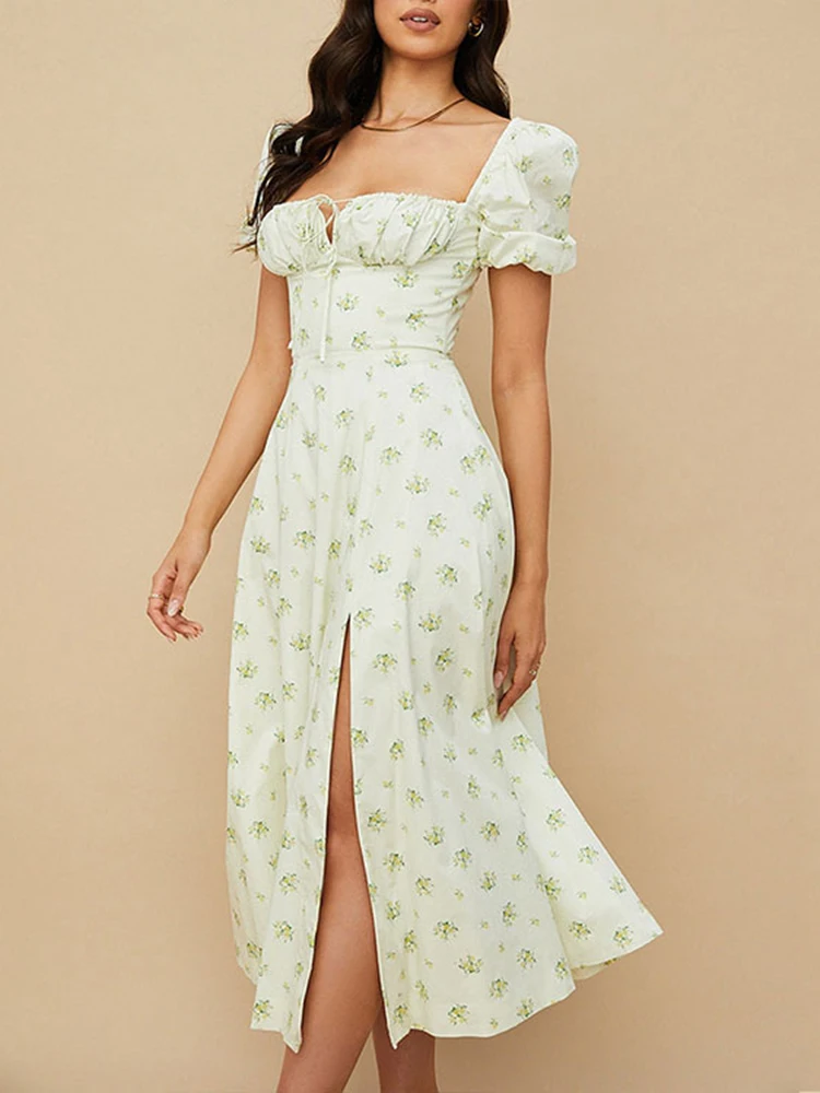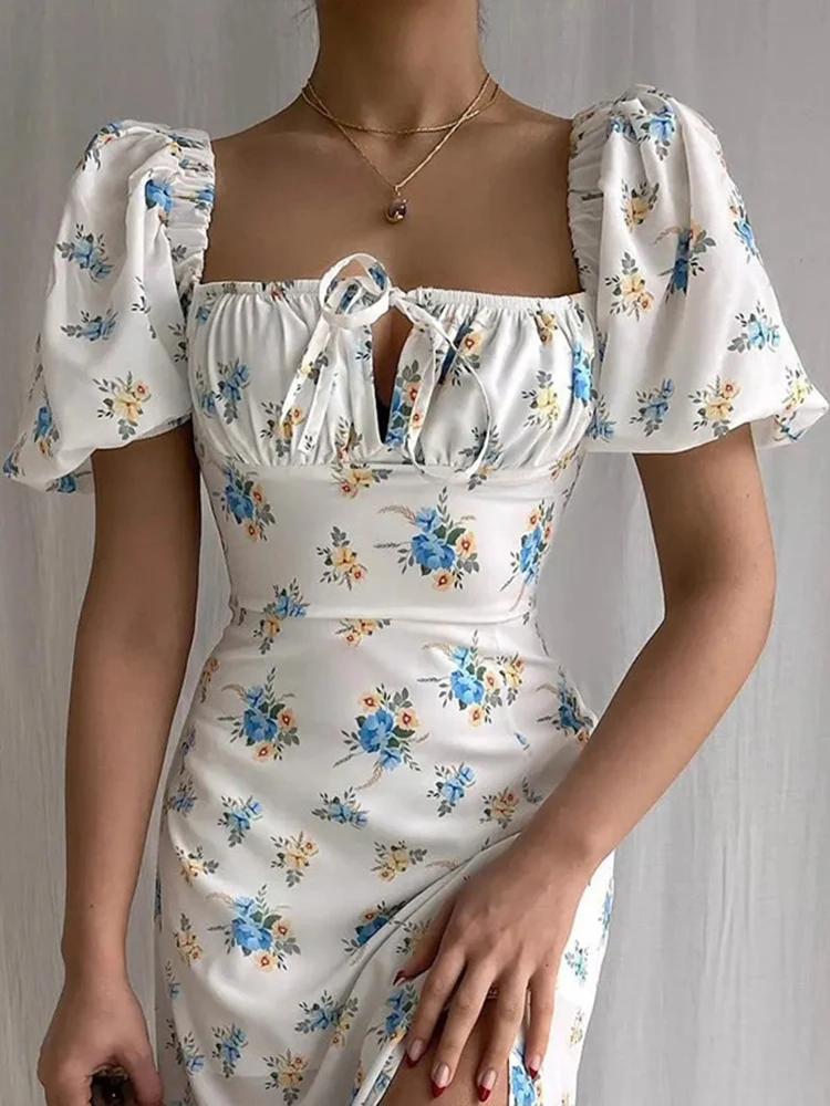 Fleepmart Sexy Floral Midi Dresses Summer Skims Women Folds Lace Up Square Collar Puff Sleeve Split Evening Elegant Party Robe