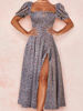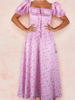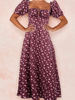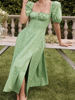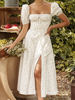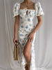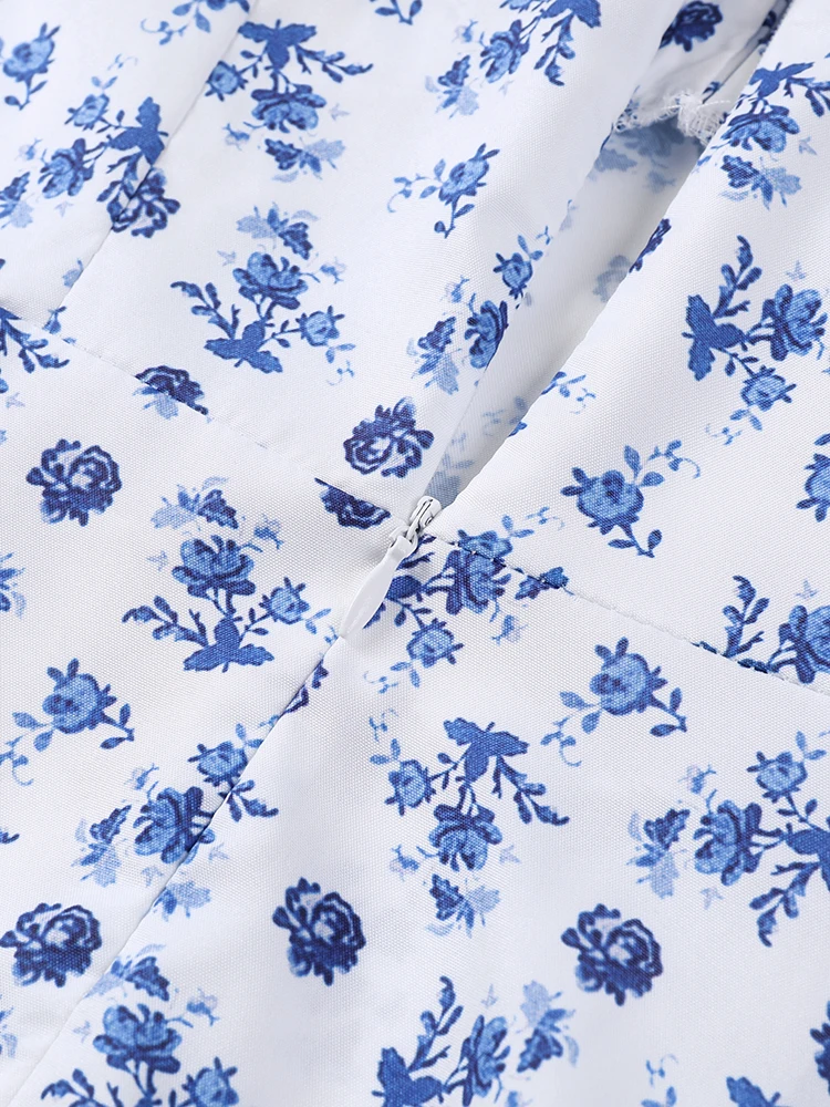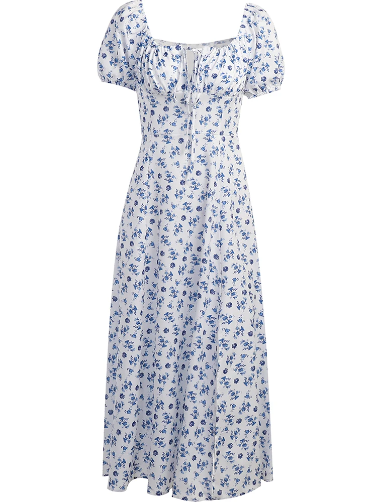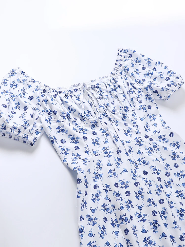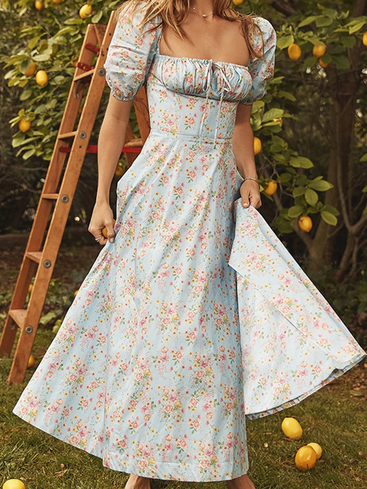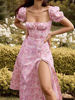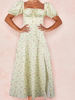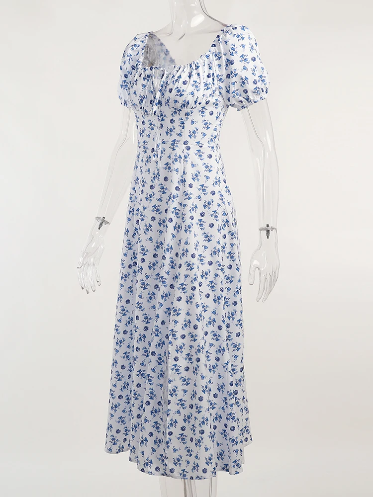 Fleepmart Sexy Floral Midi Dresses Summer Skims Women Folds Lace Up Square Collar Puff Sleeve Split Evening Elegant Party Robe