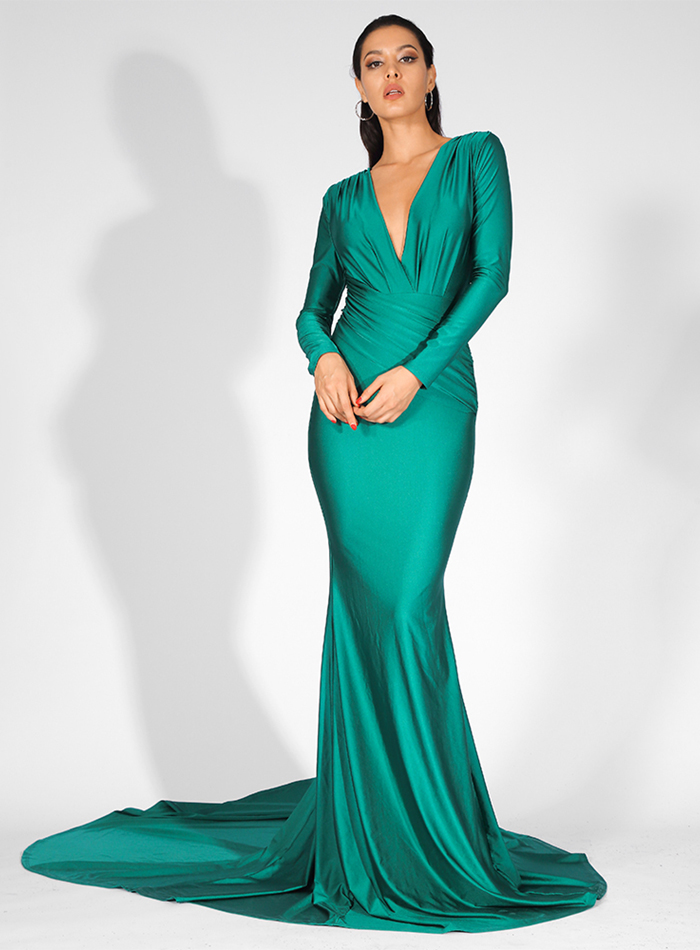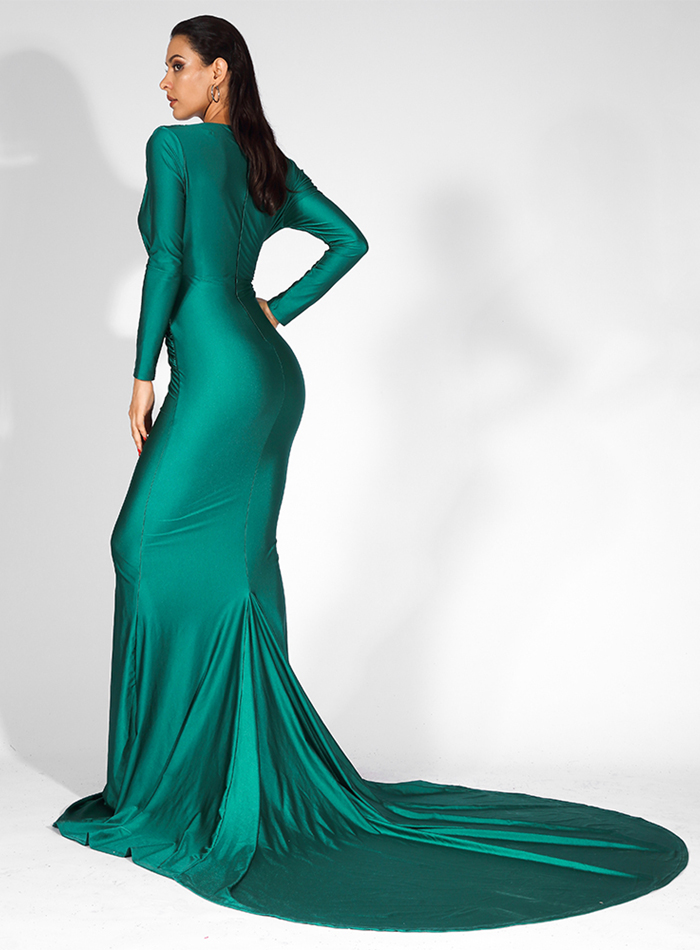 Fleepmart Sexy Green Deep V-Neck Slim Fit Elastic Fabric Trai Maxi Dress