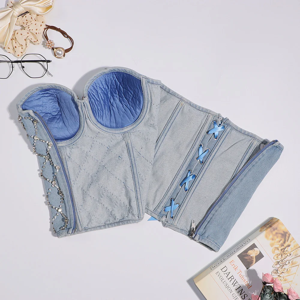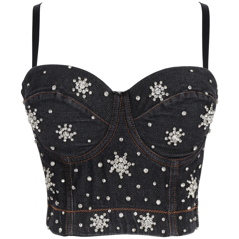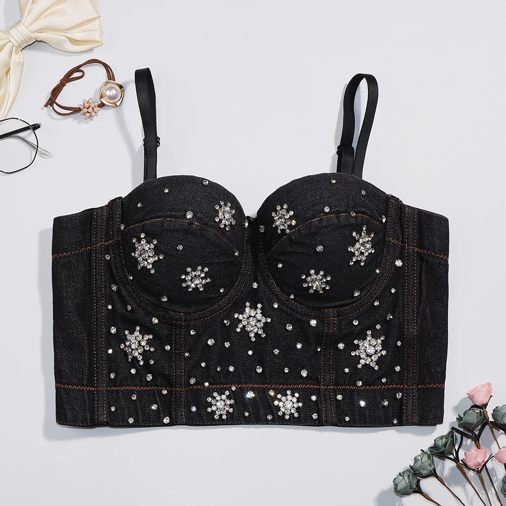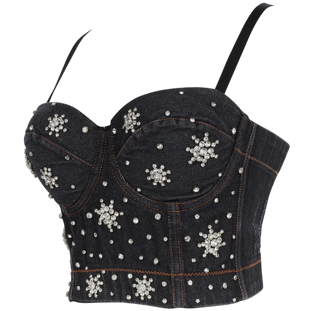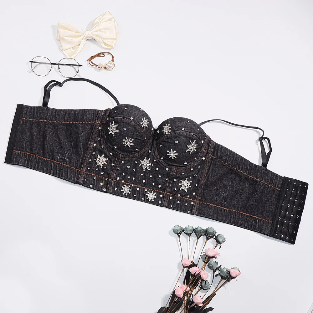Fleepmart Sexy halter black Denim Rhinestone corset crop top women summer glitter bustier y2k rave club Party tank top womens tube tops