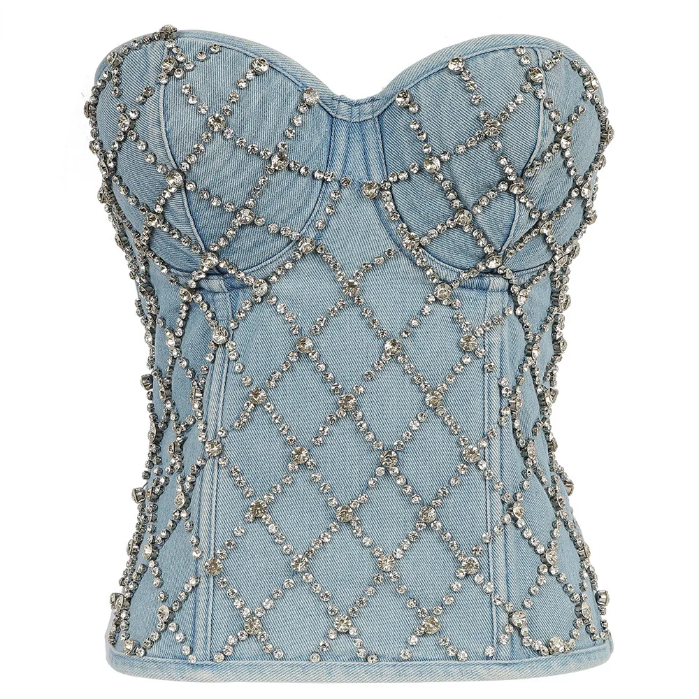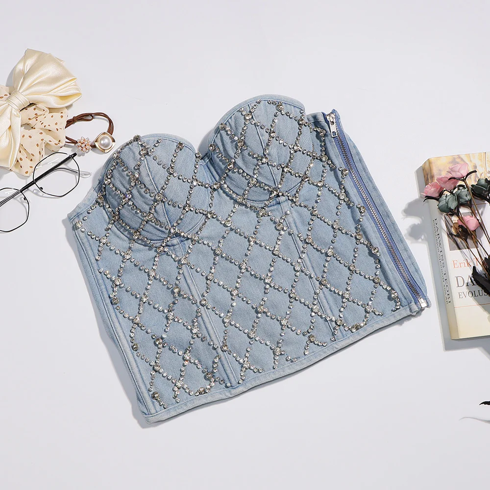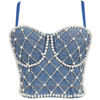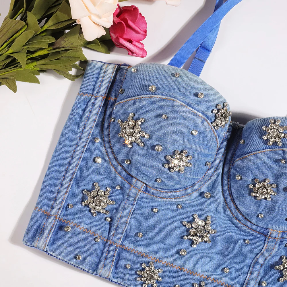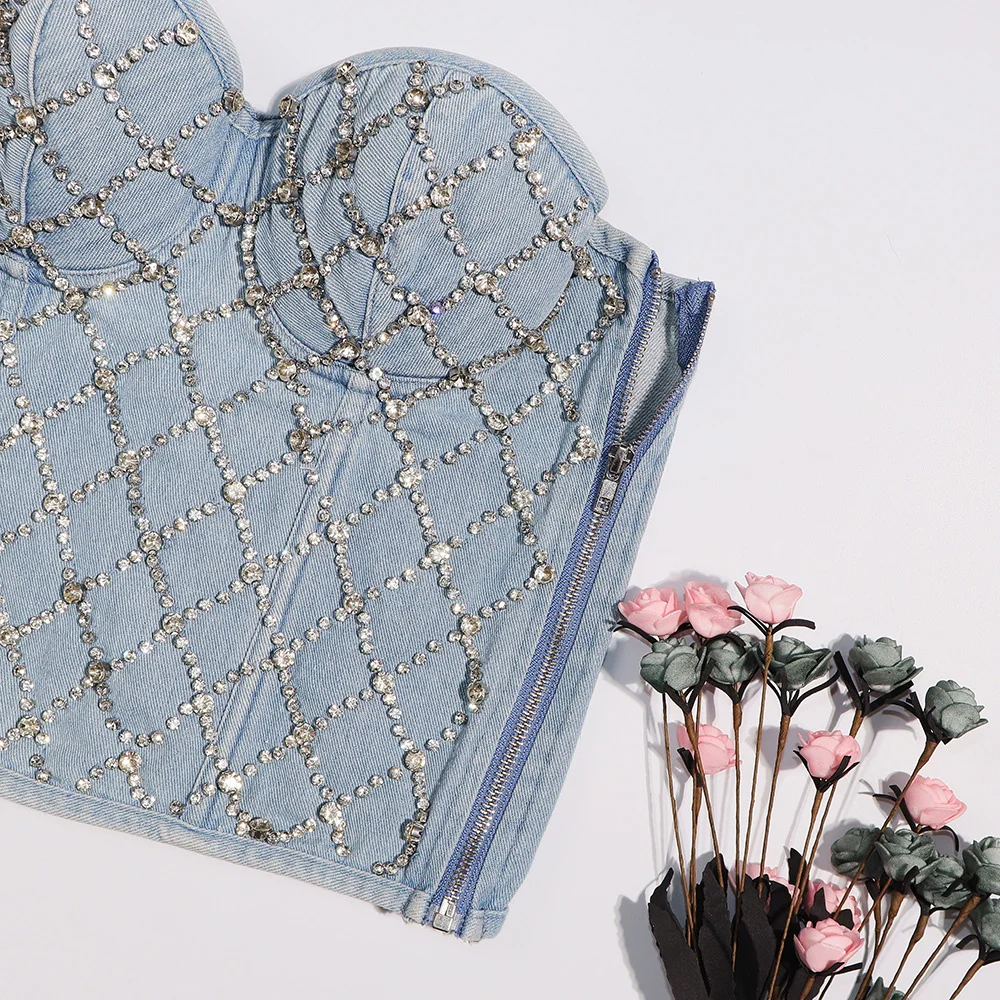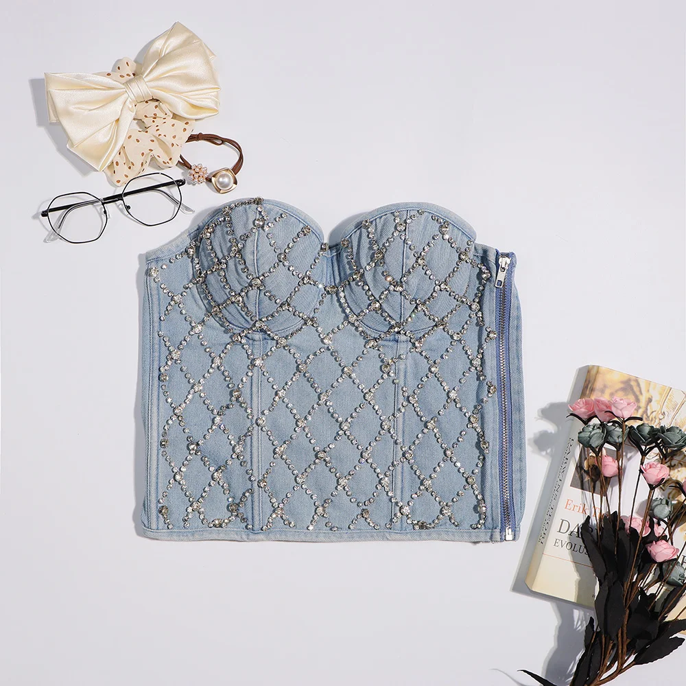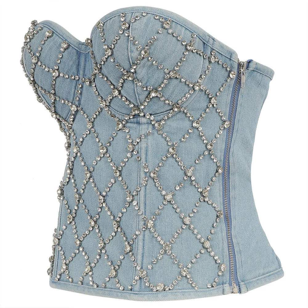 Fleepmart Sexy halter black Denim Rhinestone corset crop top women summer glitter bustier y2k rave club Party tank top womens tube tops