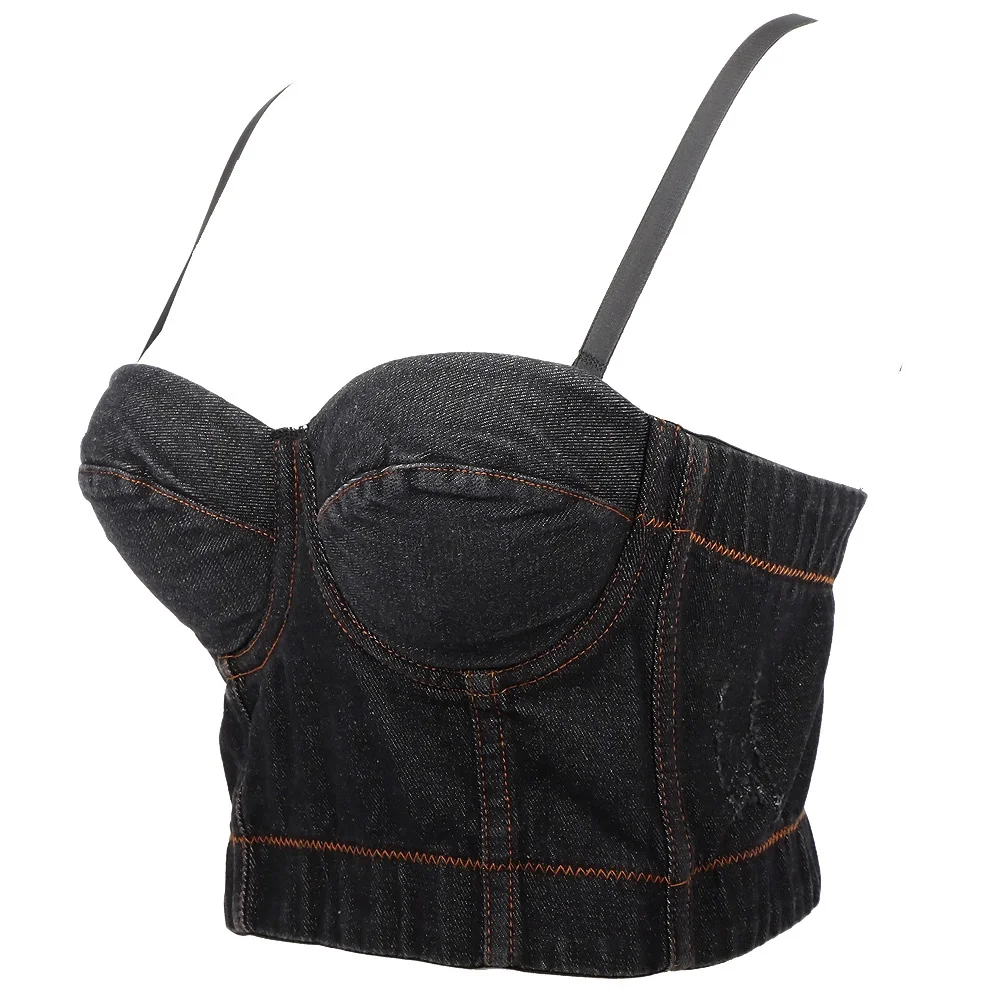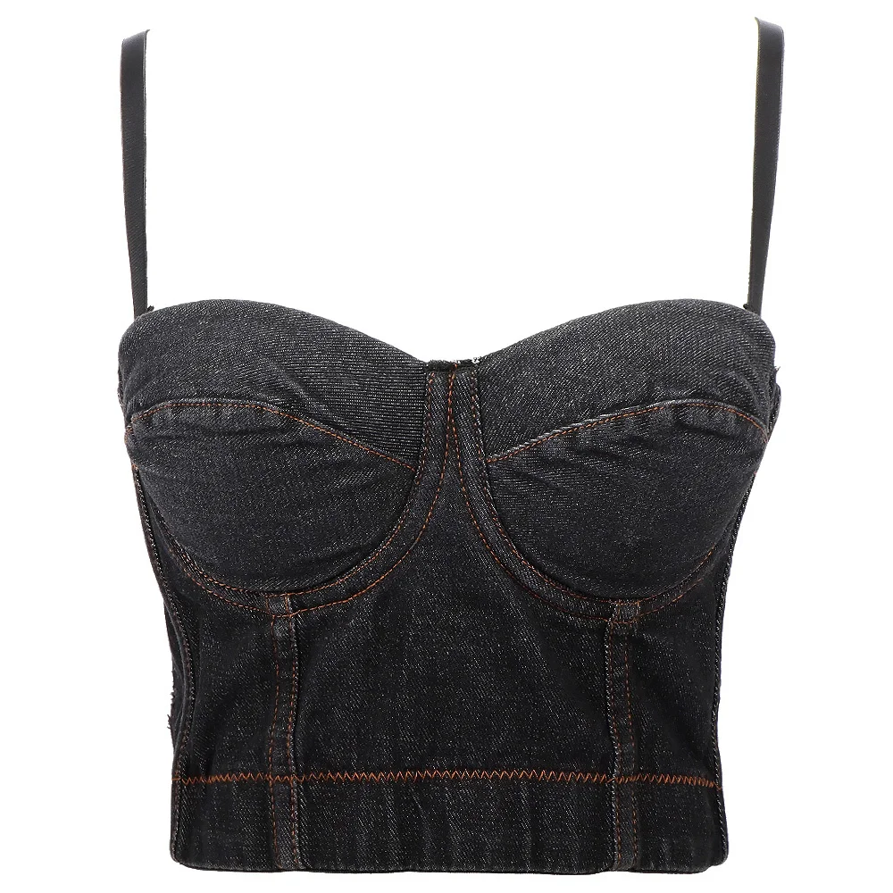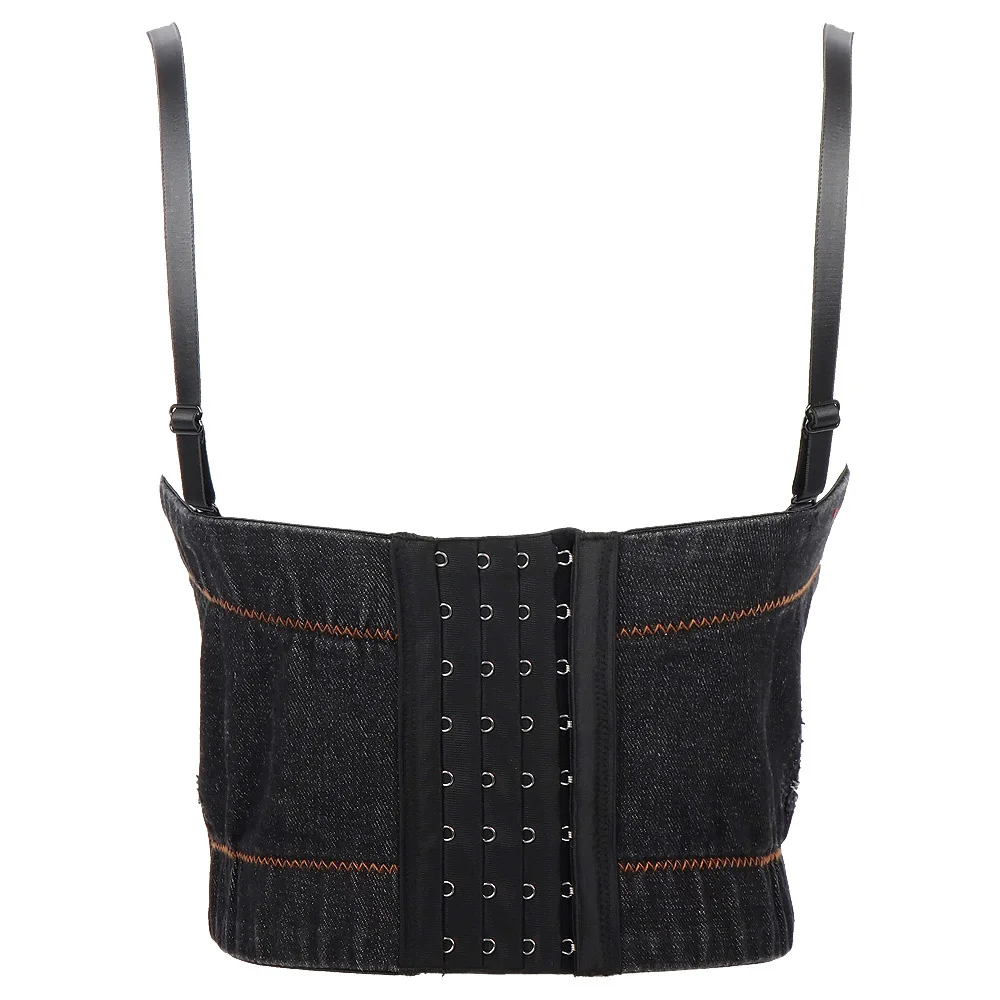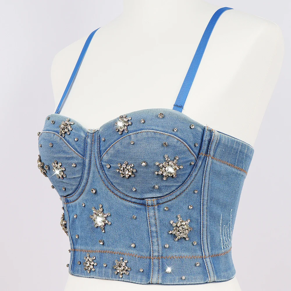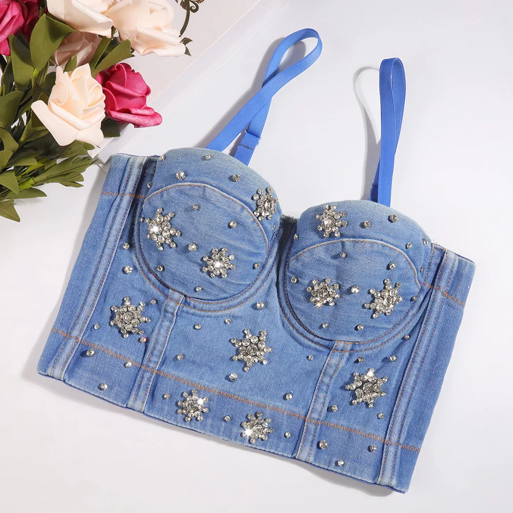 Fleepmart Sexy halter black Denim Rhinestone corset crop top women summer glitter bustier y2k rave club Party tank top womens tube tops