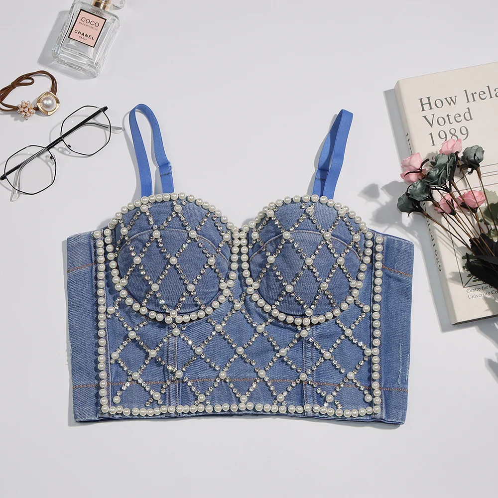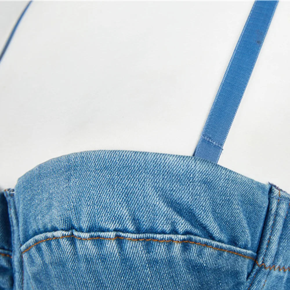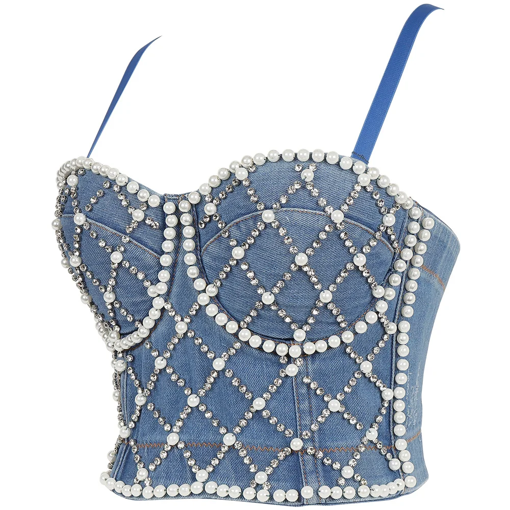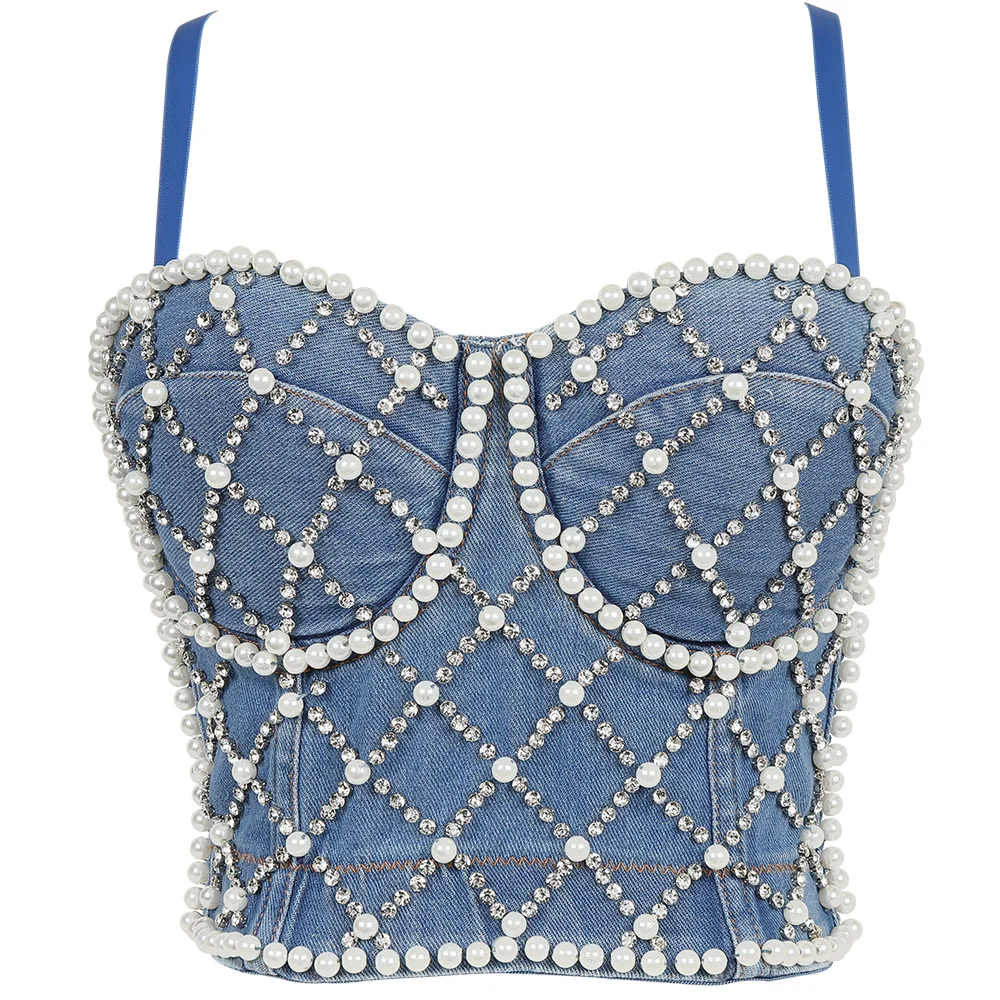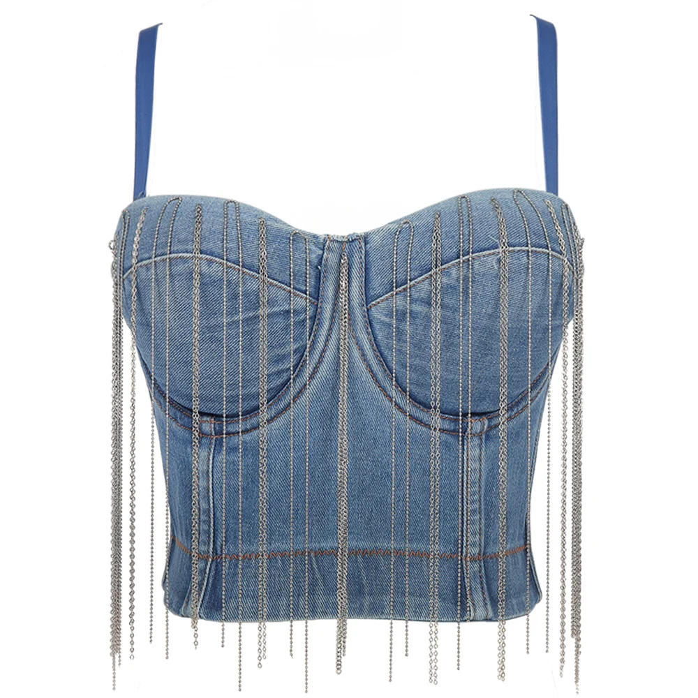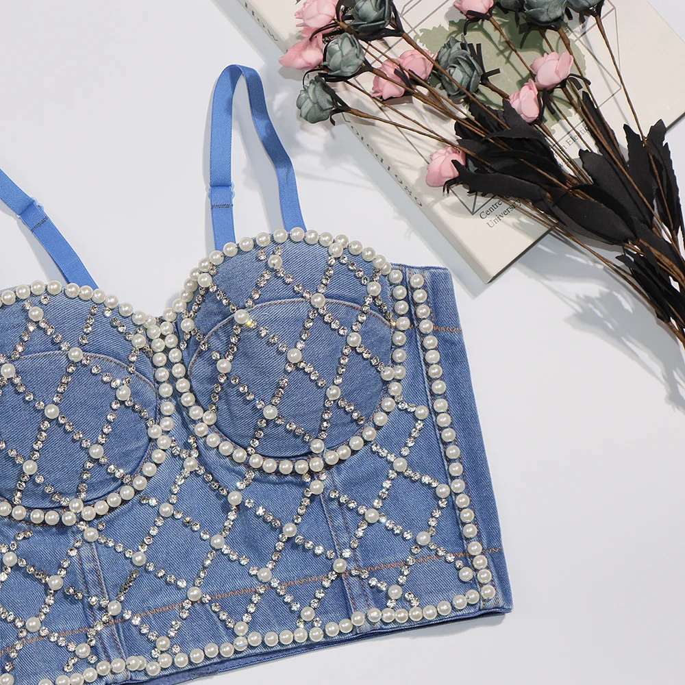 Fleepmart Sexy halter black Denim Rhinestone corset crop top women summer glitter bustier y2k rave club Party tank top womens tube tops