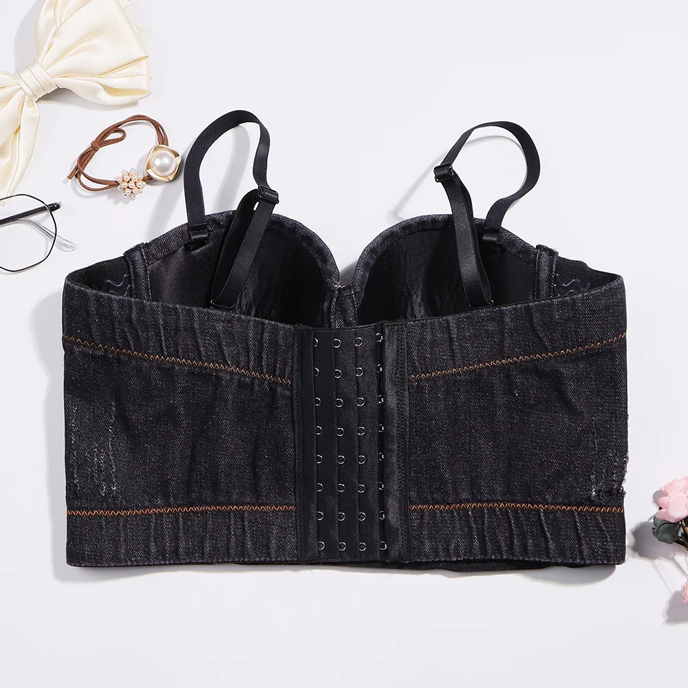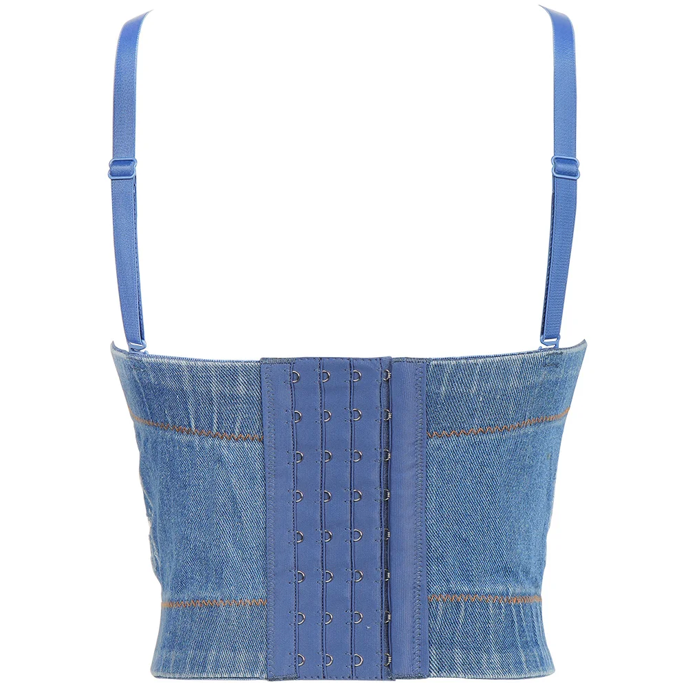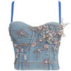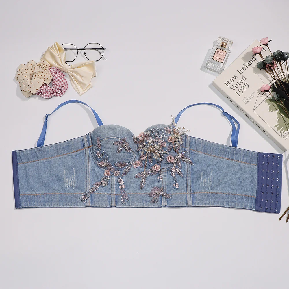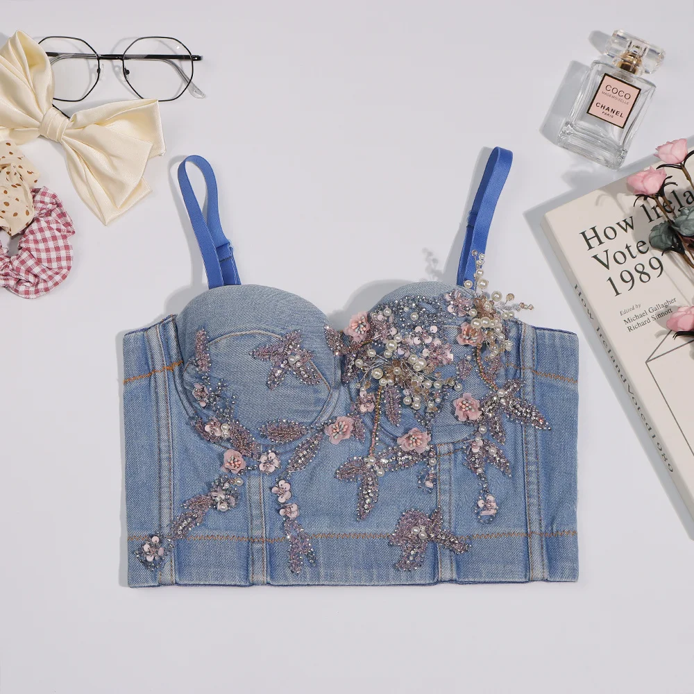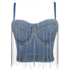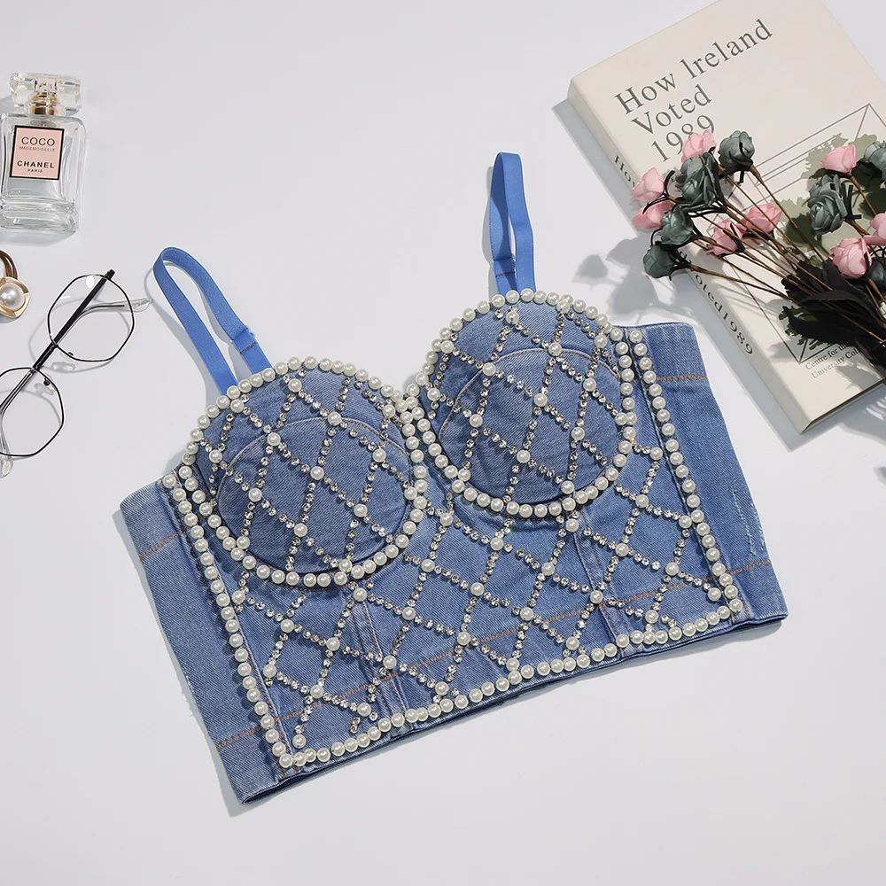 Fleepmart Sexy halter black Denim Rhinestone corset crop top women summer glitter bustier y2k rave club Party tank top womens tube tops