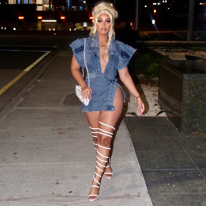 Fleepmart Sexy High Slit Mini Denim Dress Set Women Fashion Deep V Neck Button Skinny Evening Club Party Dresses Casual Streetwear Outfits