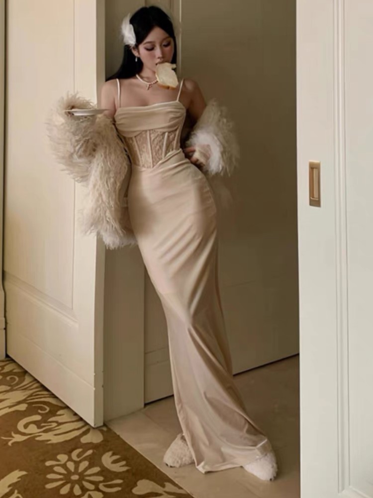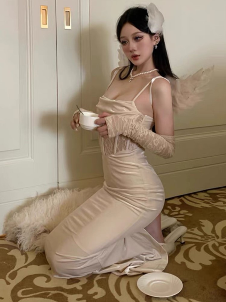 Fleepmart Sexy Bodycon Long Dress for Women Evening Party Prom Wedding Dress Velvet Lace Patchwork Spaghetti Strap Slim
