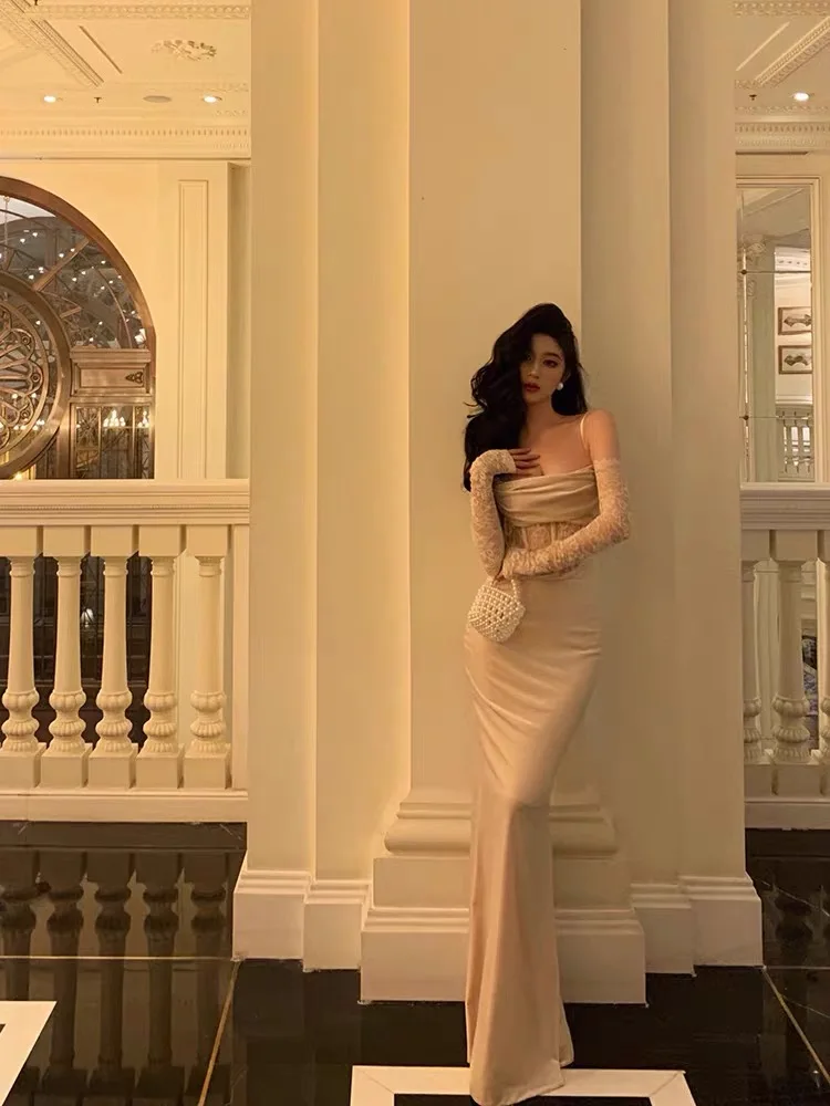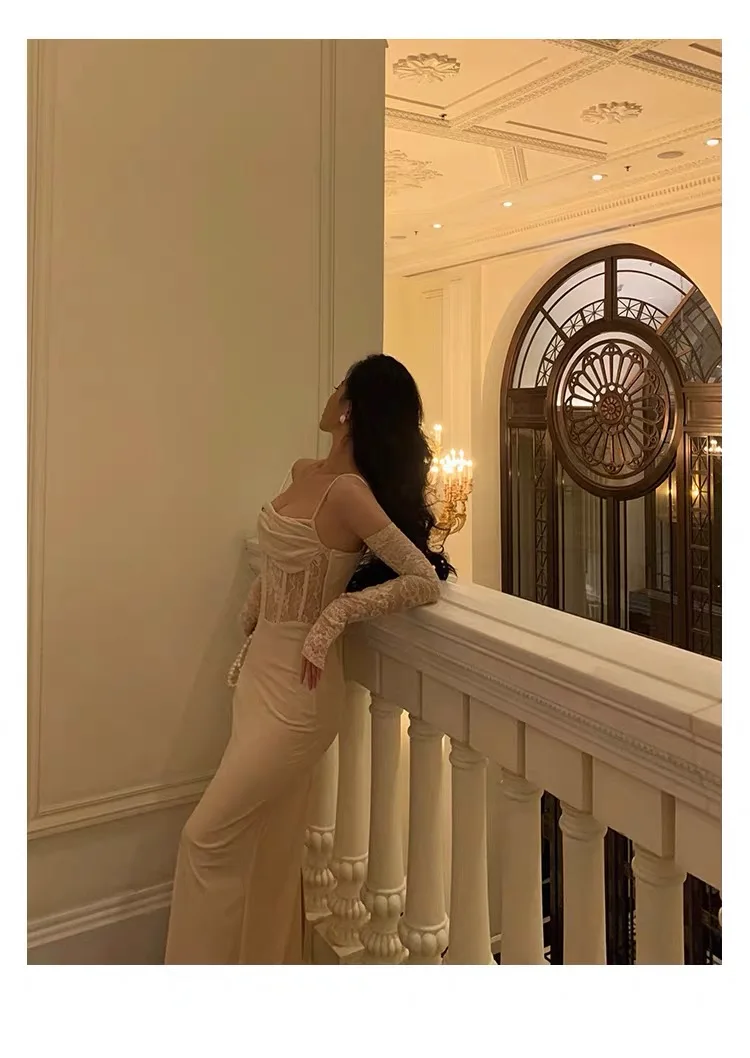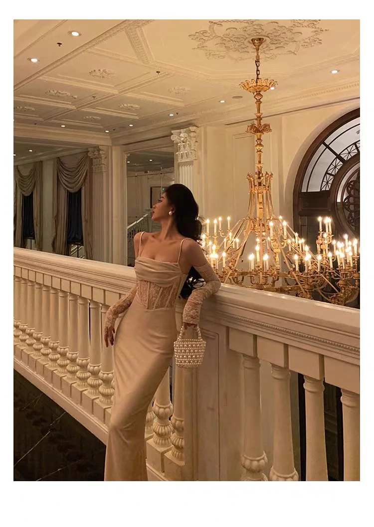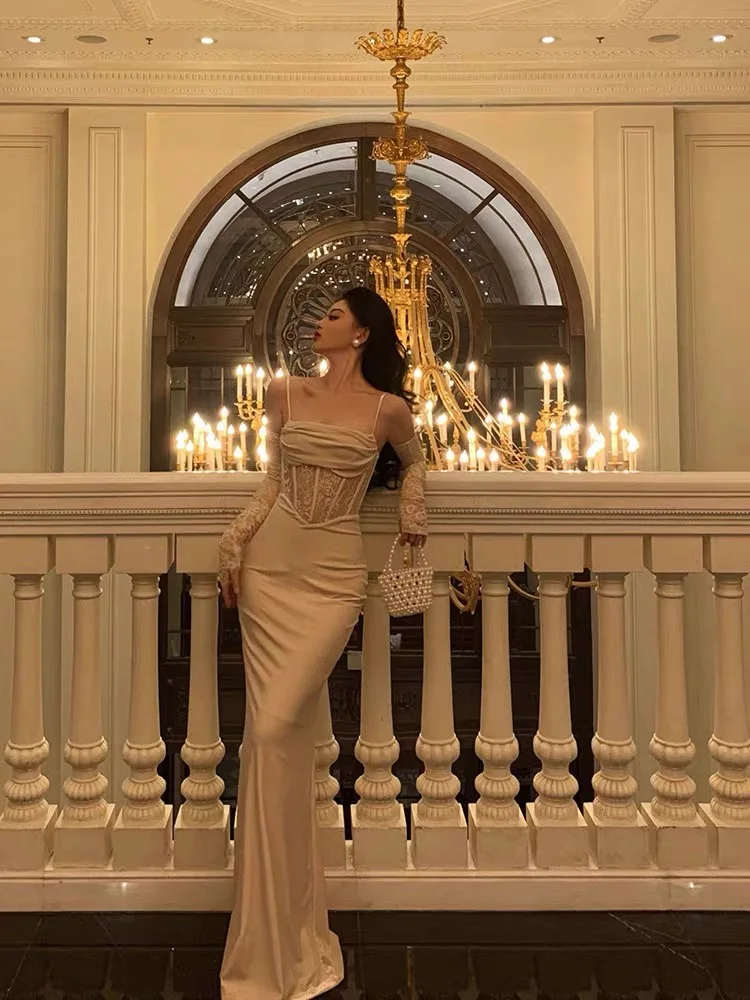 Fleepmart Sexy Bodycon Long Dress for Women Evening Party Prom Wedding Dress Velvet Lace Patchwork Spaghetti Strap Slim