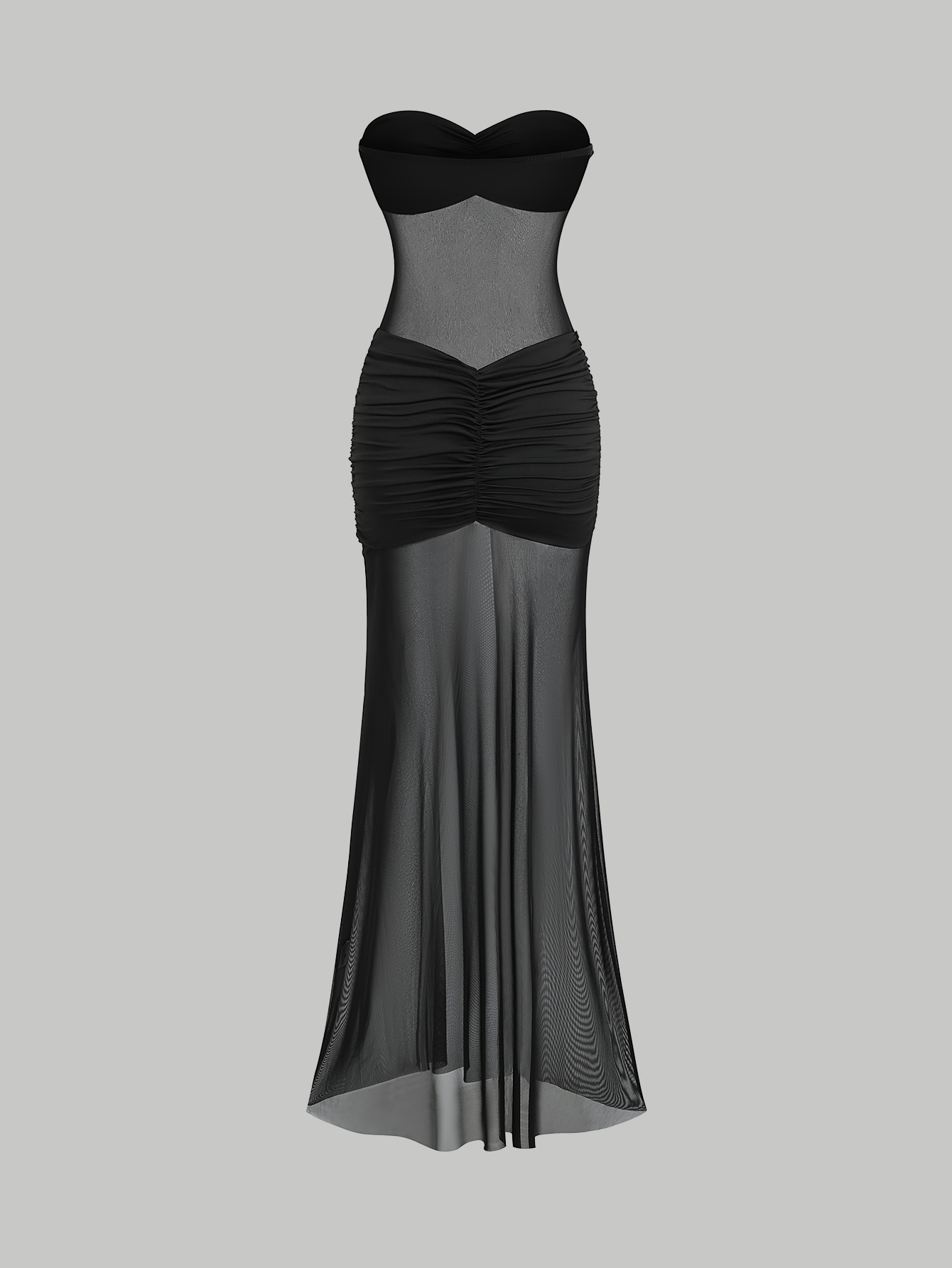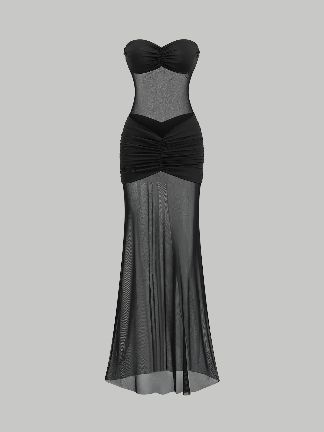 Fleepmart Sexy Mesh Women Long See Through Hollow Strapless Elastic Slim Fit Coquette Vacation Seaside Party Dress