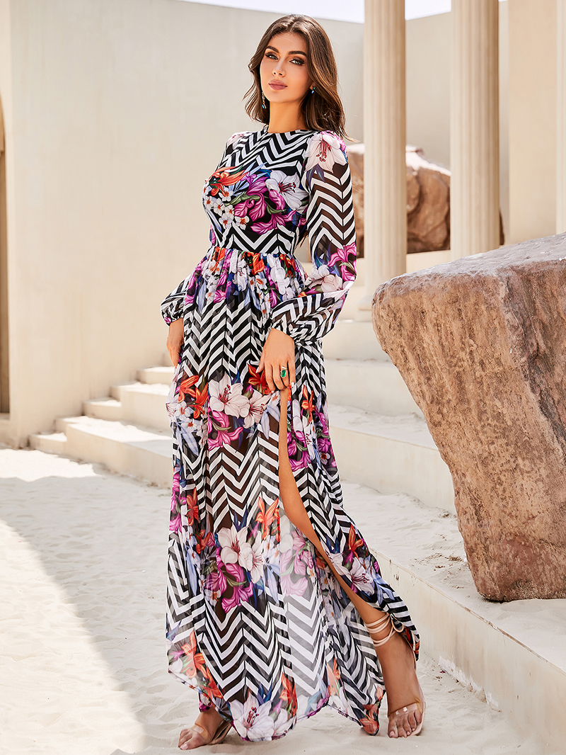 Fleepmart Sexy Pic Crew Neck Puff Sleeve Tunic Print Slit A-Line Beach Long Dress