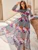 Fleepmart Sexy Pic Crew Neck Puff Sleeve Tunic Print Slit A-Line Beach Long Dress
