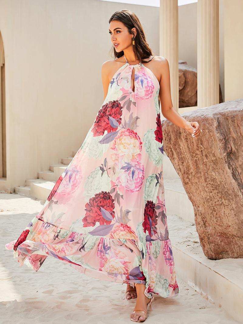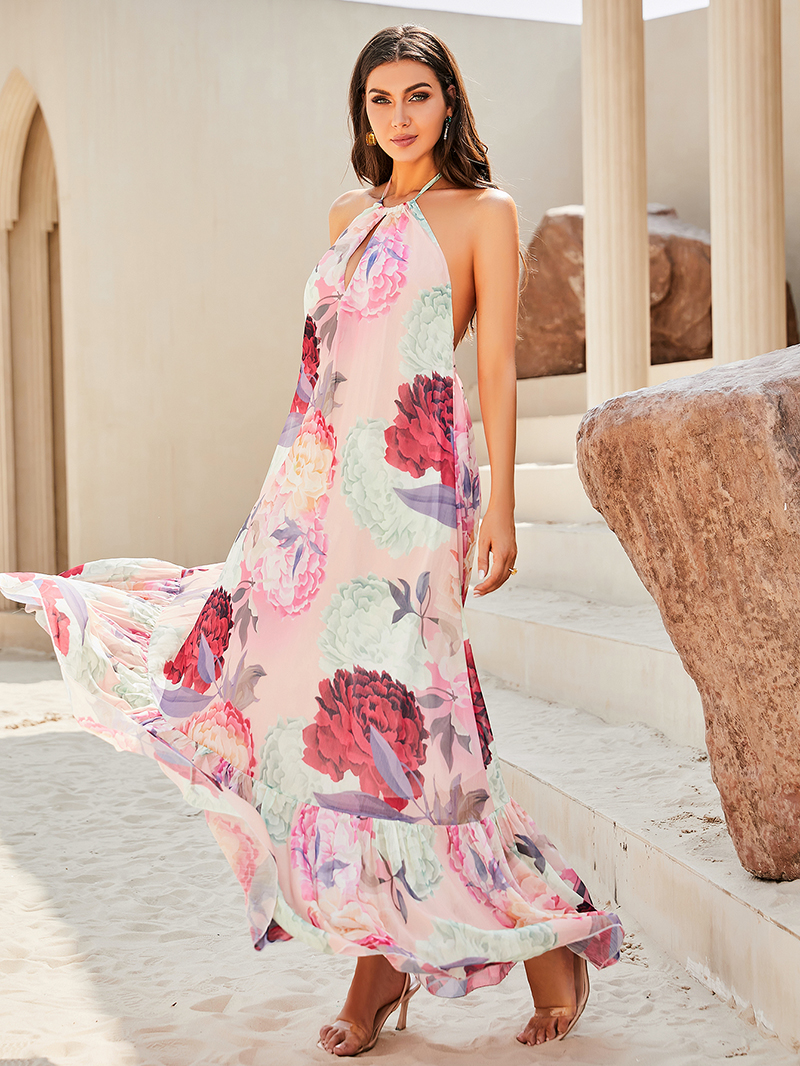 Fleepmart Sexy Pink Print Sleeveless Backless A-Line Halter Beach Long Dress