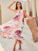 Fleepmart Sexy Pink Print Sleeveless Backless A-Line Halter Beach Long Dress