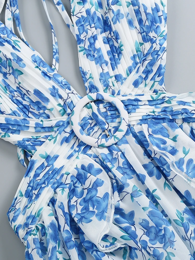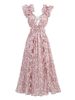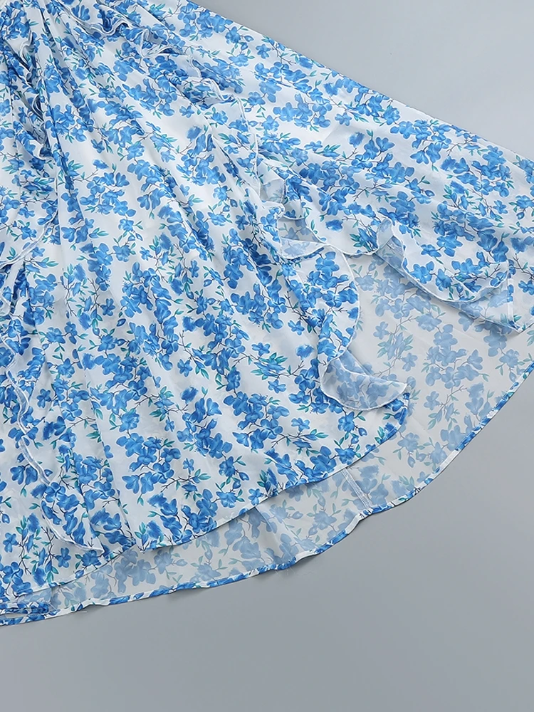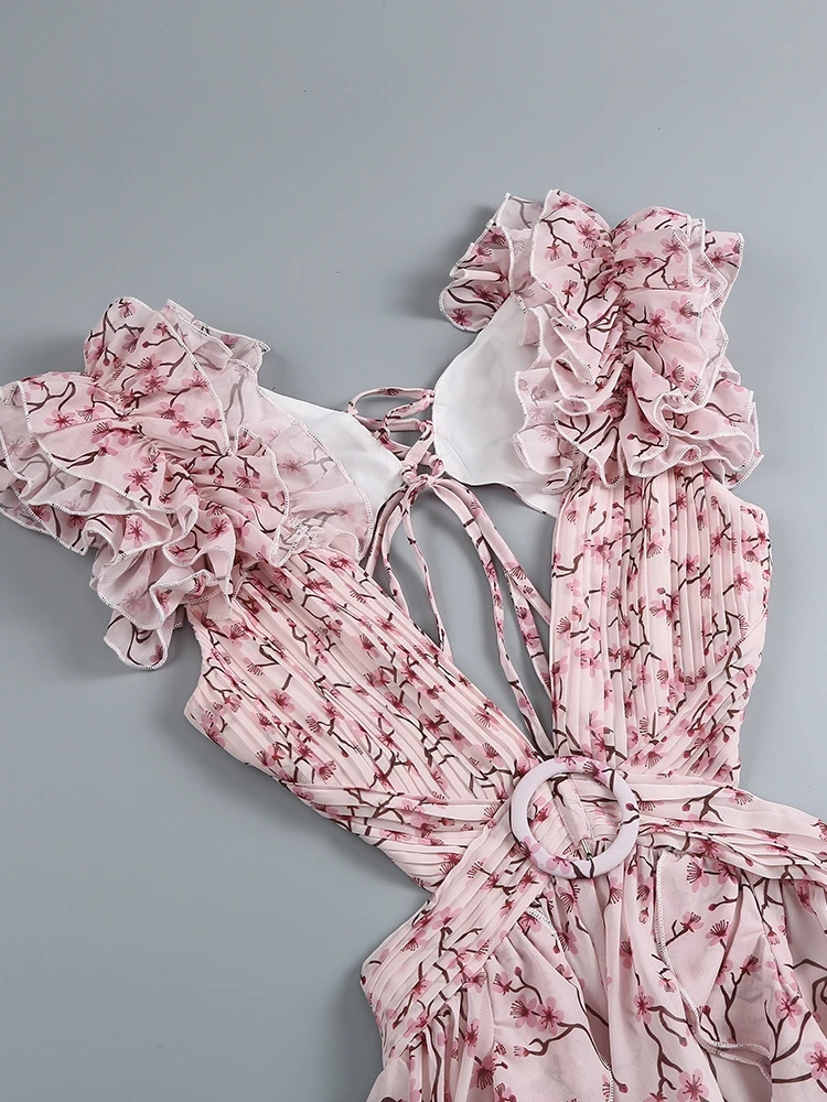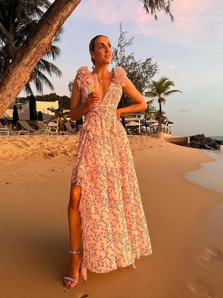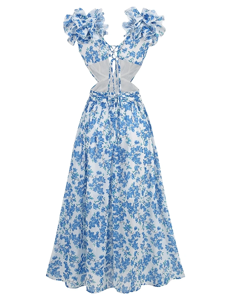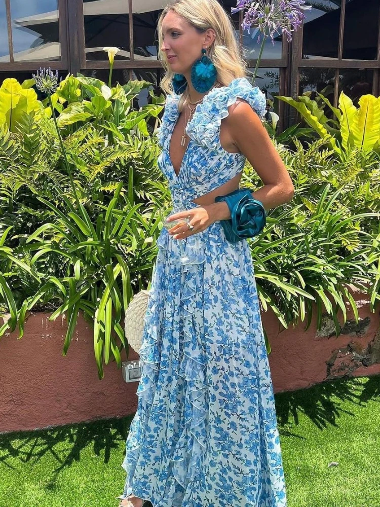 Fleepmart Sexy Printed Deep V Neck Hollow Out Women Sleeveless Ruffle Floral Split Long Dress Party Beach