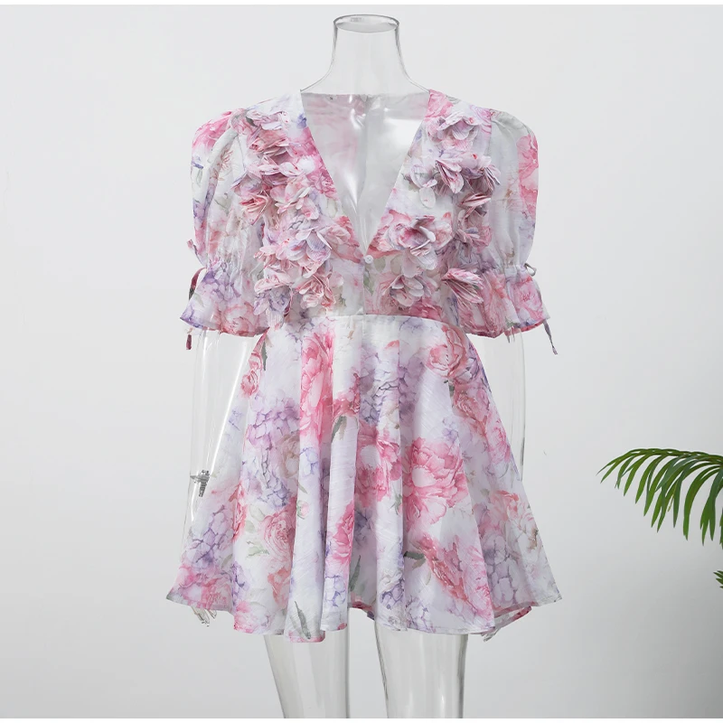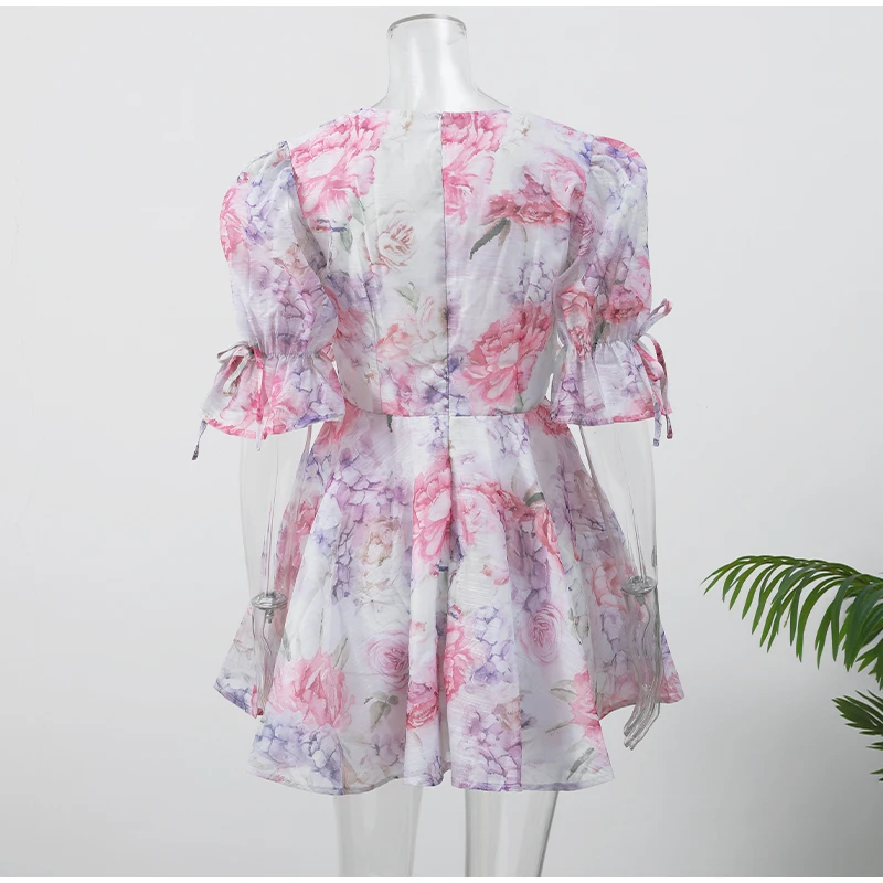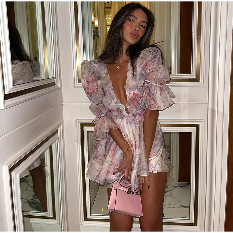 Fleepmart Sexy Printed Lotus Leaf Hem Short Dress Women Waist Cinched Deep V Bubble Sleeve Puffy Mini Dresses 2025 New Party Street Robe