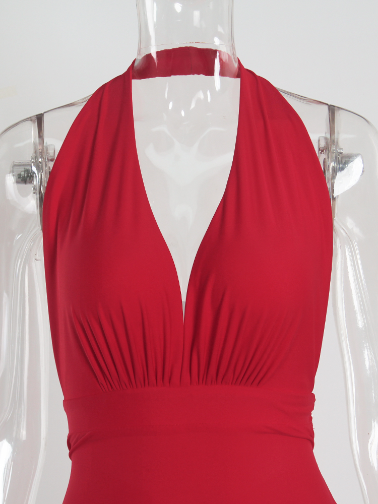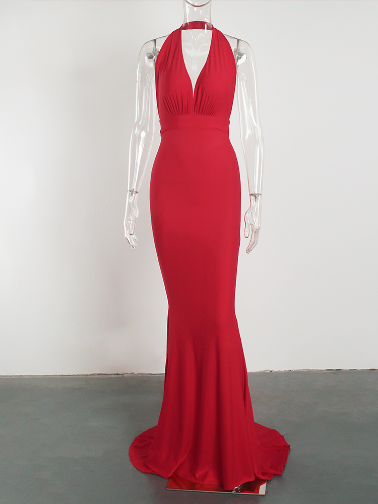 Fleepmart Sexy Red Summer Floor Length Evening Party Mermaid Dress Deep V Neck Halter Sleeveless BacklessRuched Hollow Out Stretch