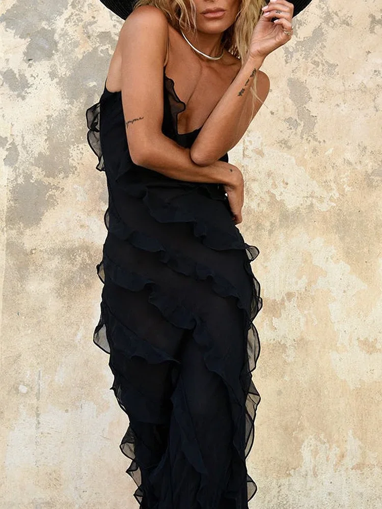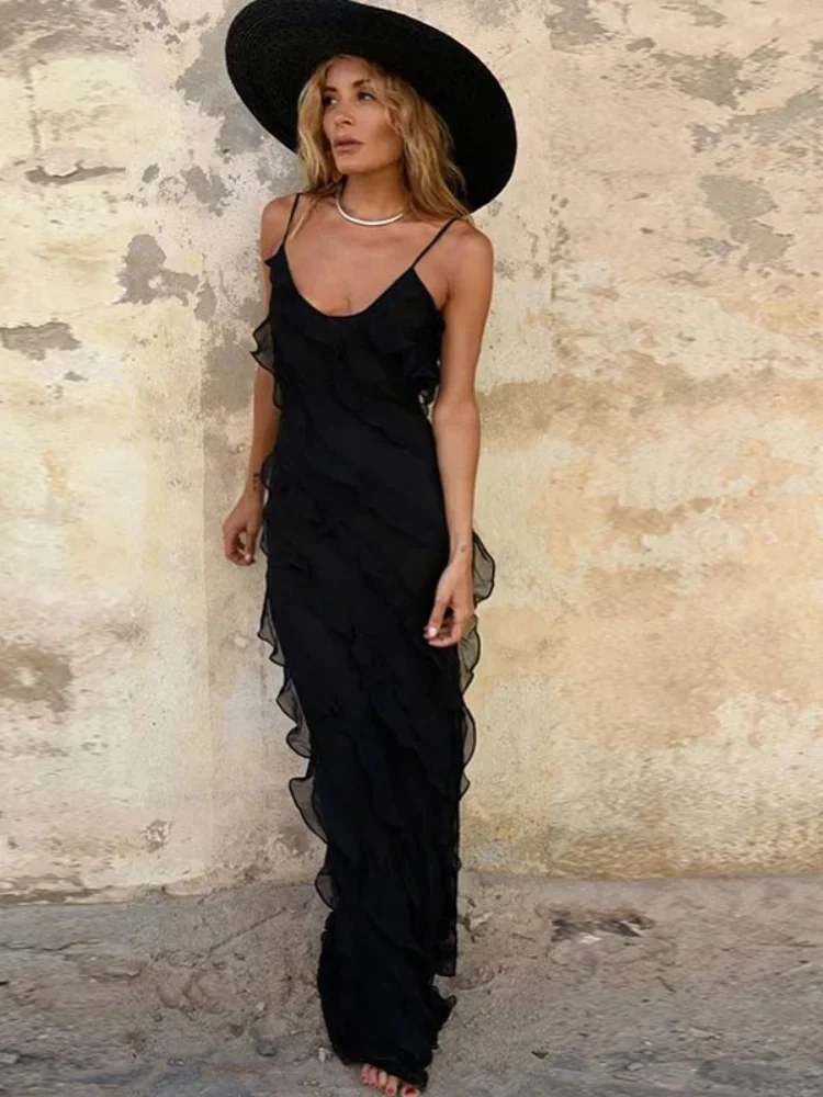Fleepmart Sexy Ruffles Maxi Robes Women Slim Fit Backless V Neck Long Dresses 2025 New Vacation Beach