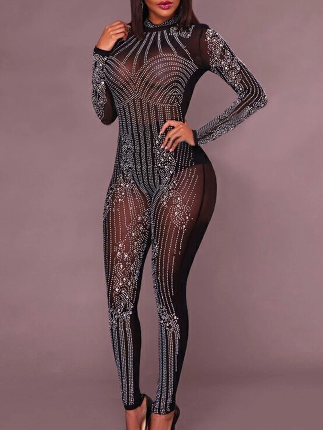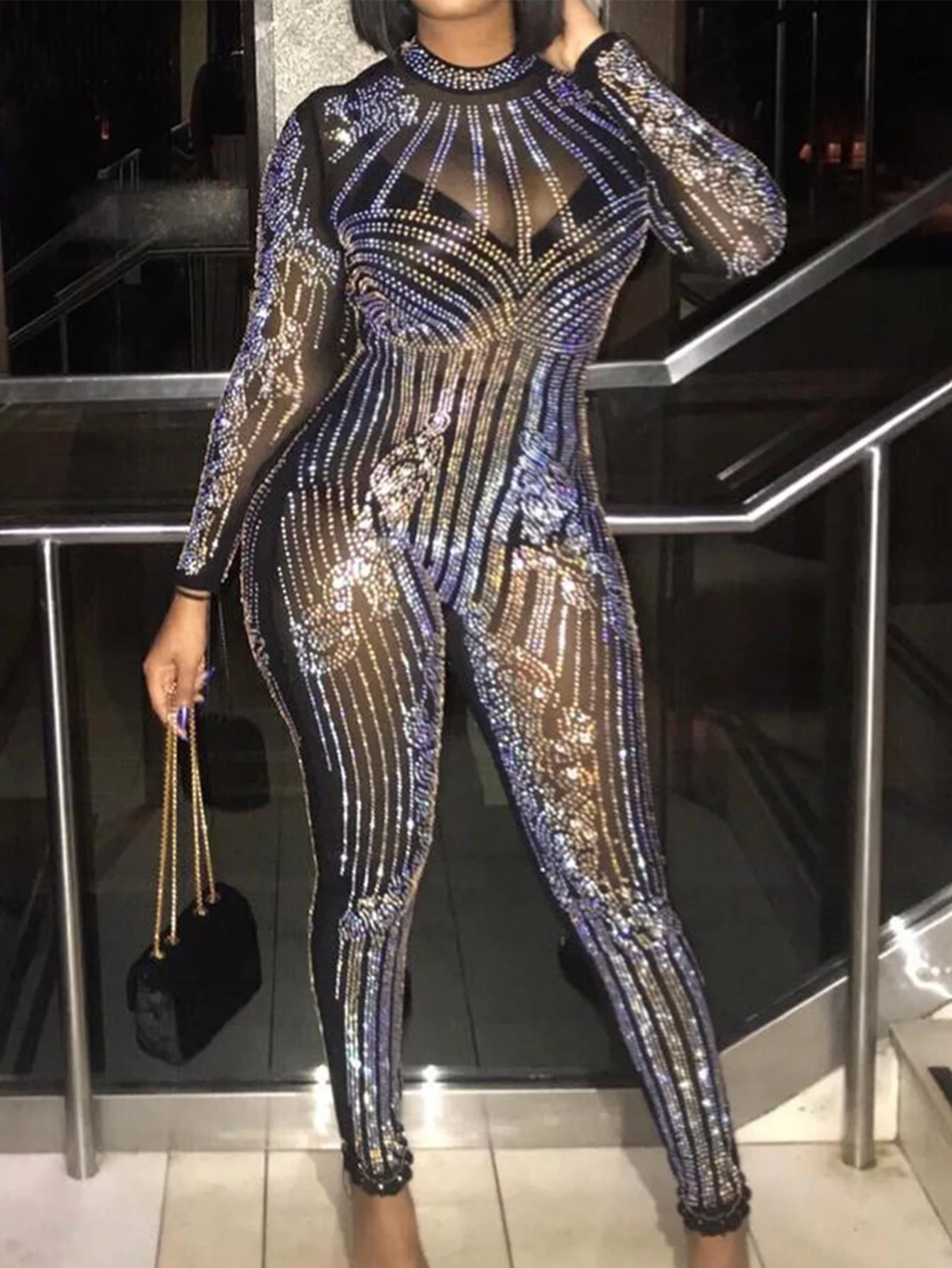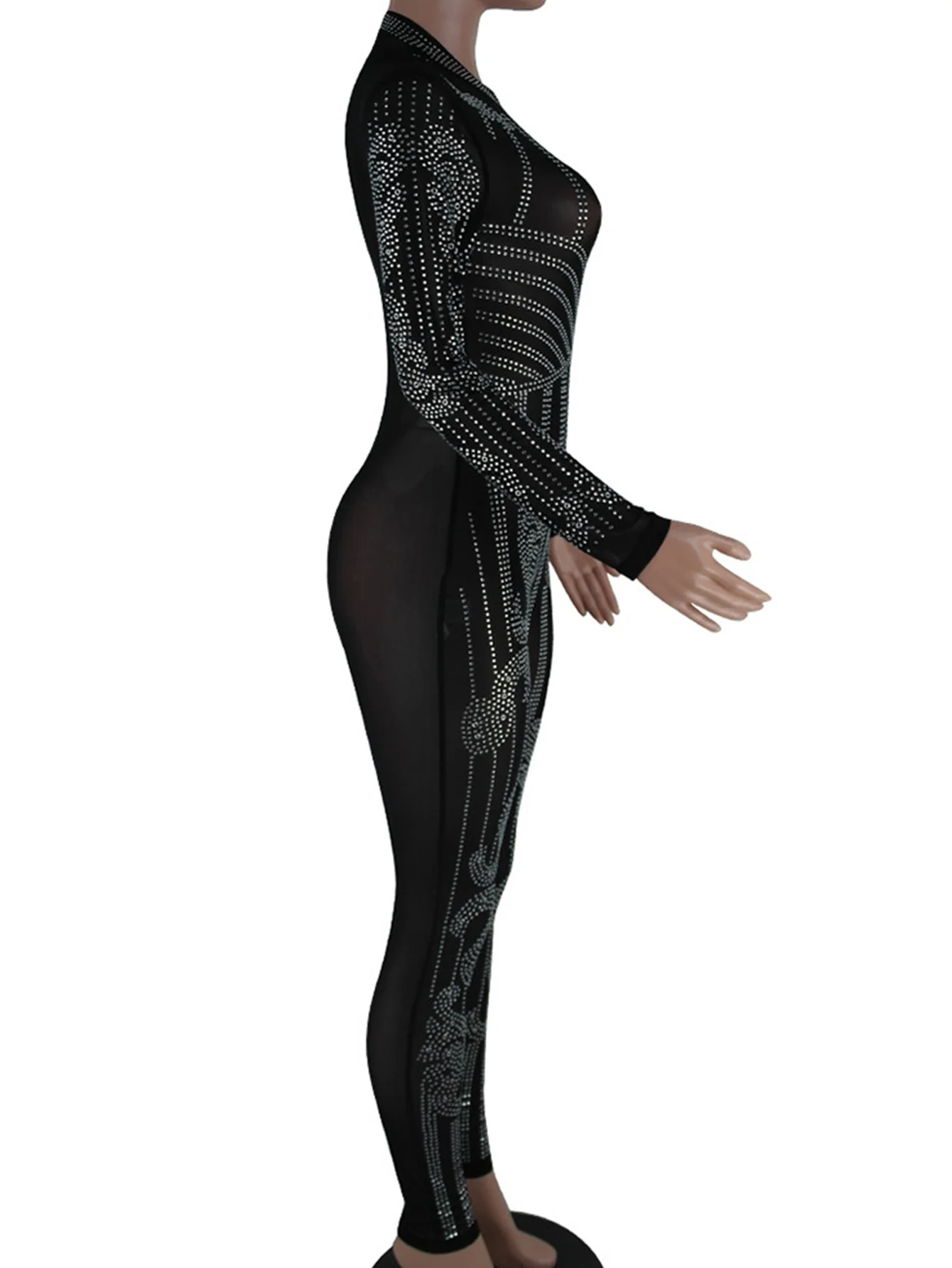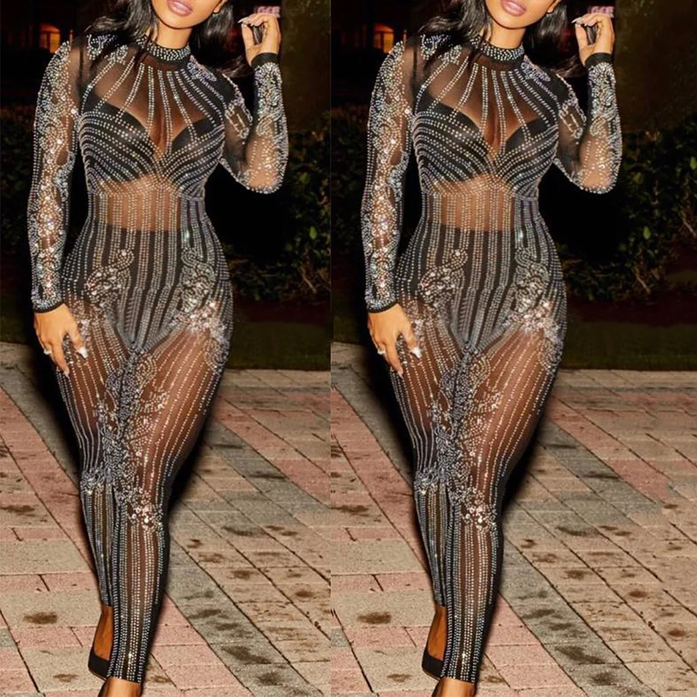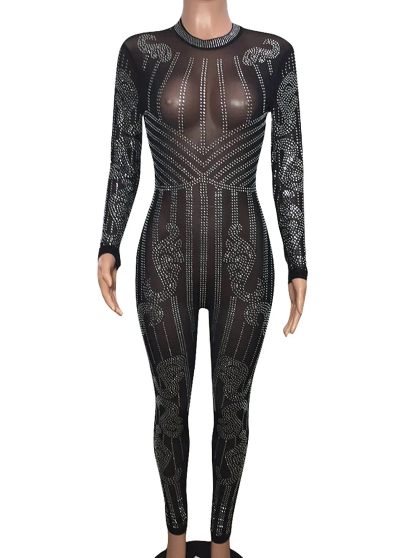 Fleepmart Sexy see through Black mesh Rhinestone jumpsuit women body birthday party jumpsuits one piece club rave outfit bodysuit overalls