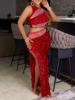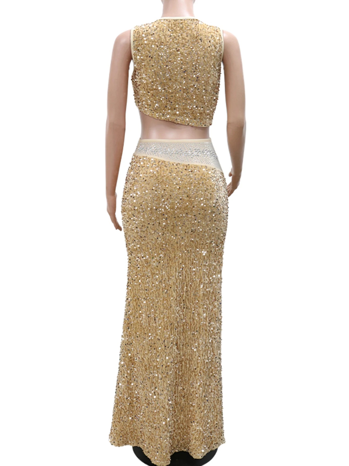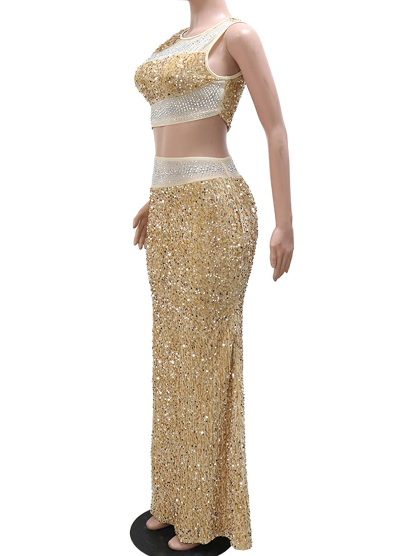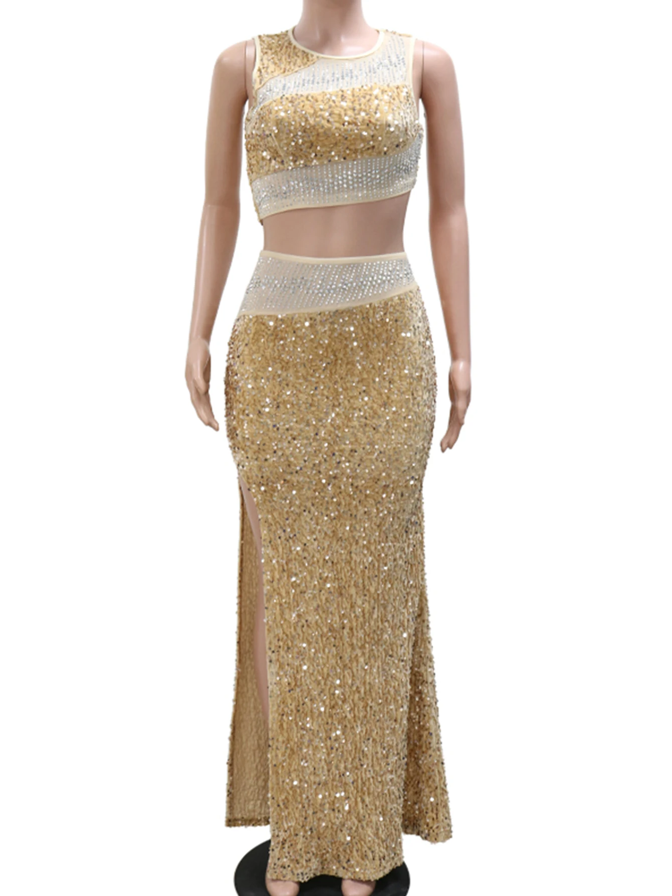 Fleepmart Sexy see through maxi sequin summer dress women elegant mesh rhinestone birthday party dress sets long evening dresses vestidos