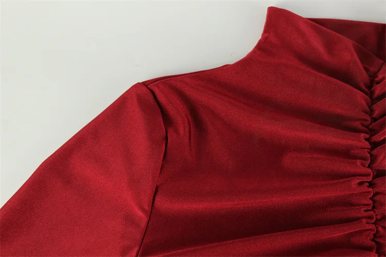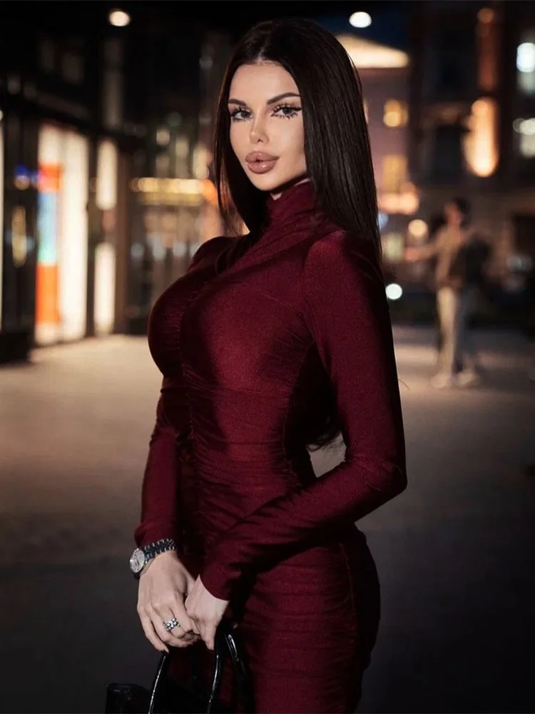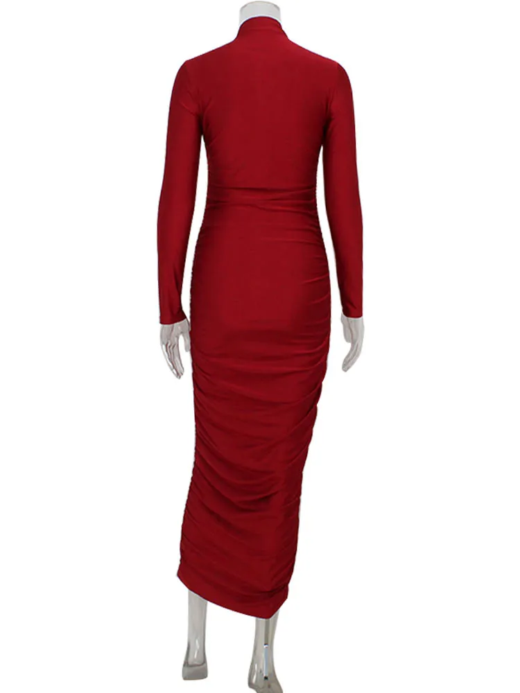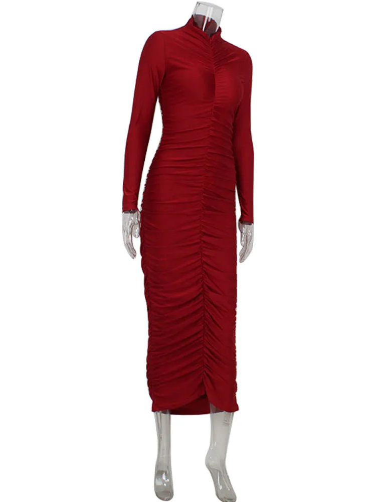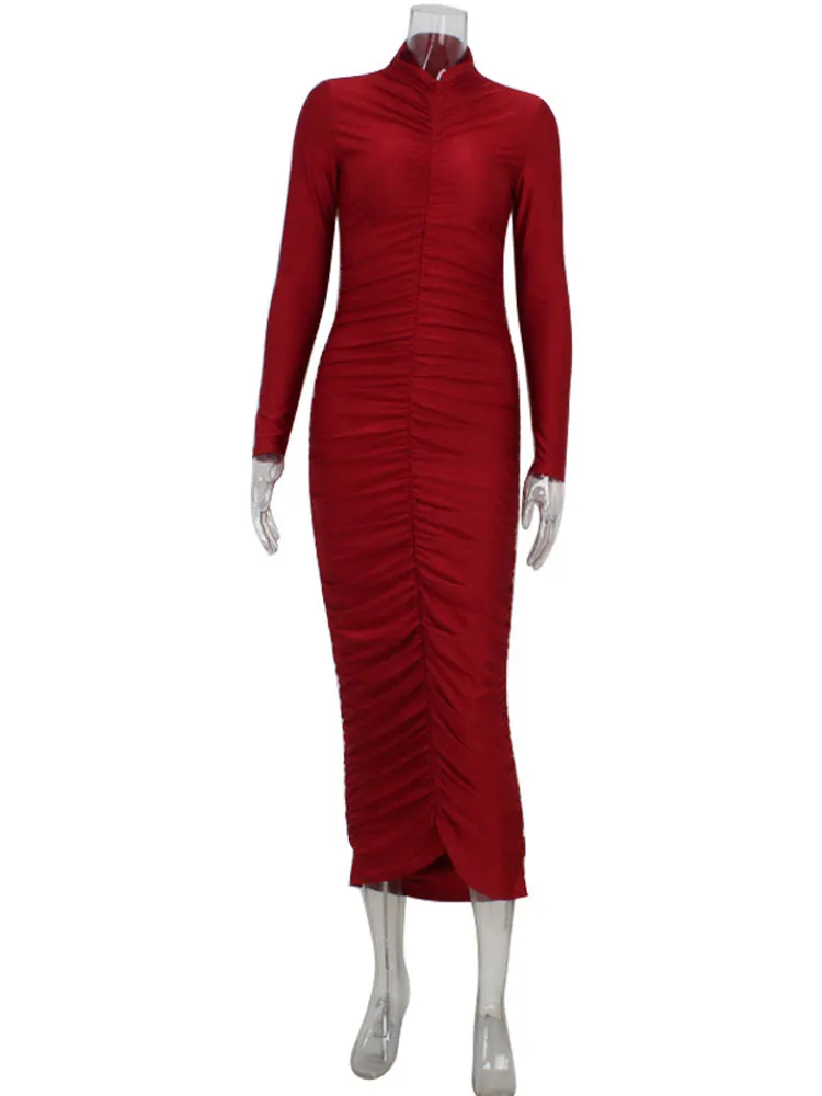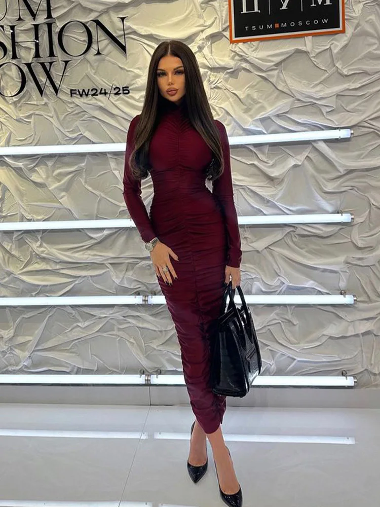 Fleepmart Sexy Sheath Women’s Maxi Dresses Solid Turtleneck Regular Long Sleeves Folds Slim Bodycon Party Female Vestidos Robes