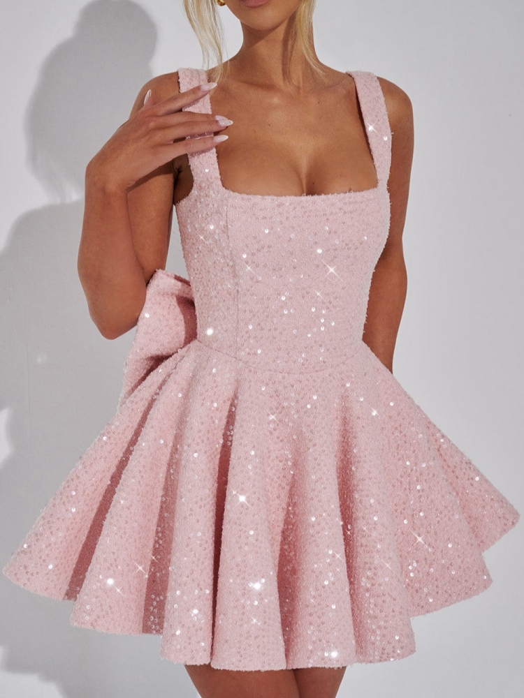 Fleepmart Sexy Sling Square Neck Bow Design Mini Women Pink White Sequins A-line Elegant Evening Cocktail Club