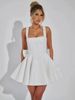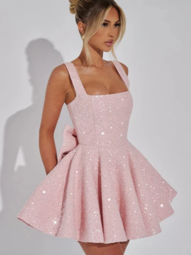 Fleepmart Sexy Sling Square Neck Bow Design Mini Women Pink White Sequins A-line Elegant Evening Cocktail Club