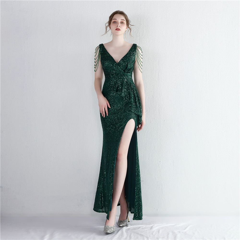 Fleepmart Sexy Slit Sequin Party Maxi Dress Women Long Prom Dress V Neck Beading Evening Dress
