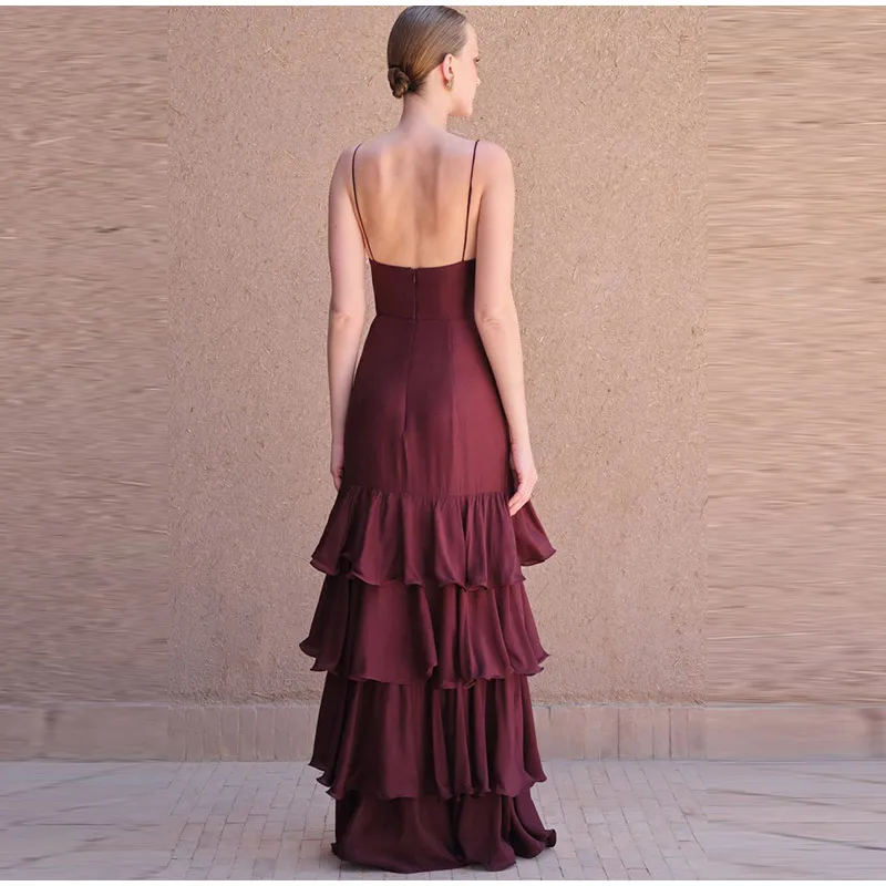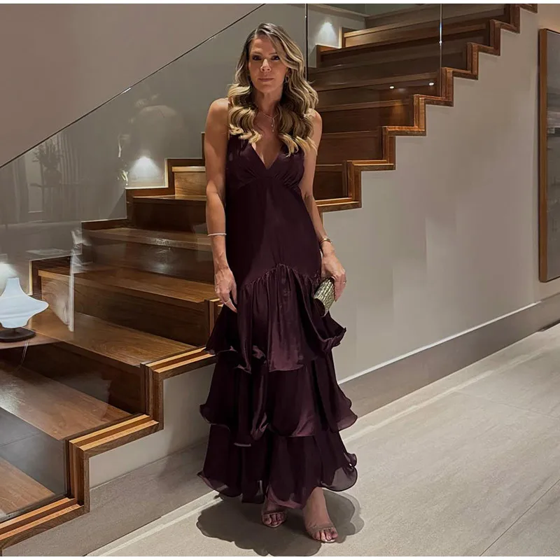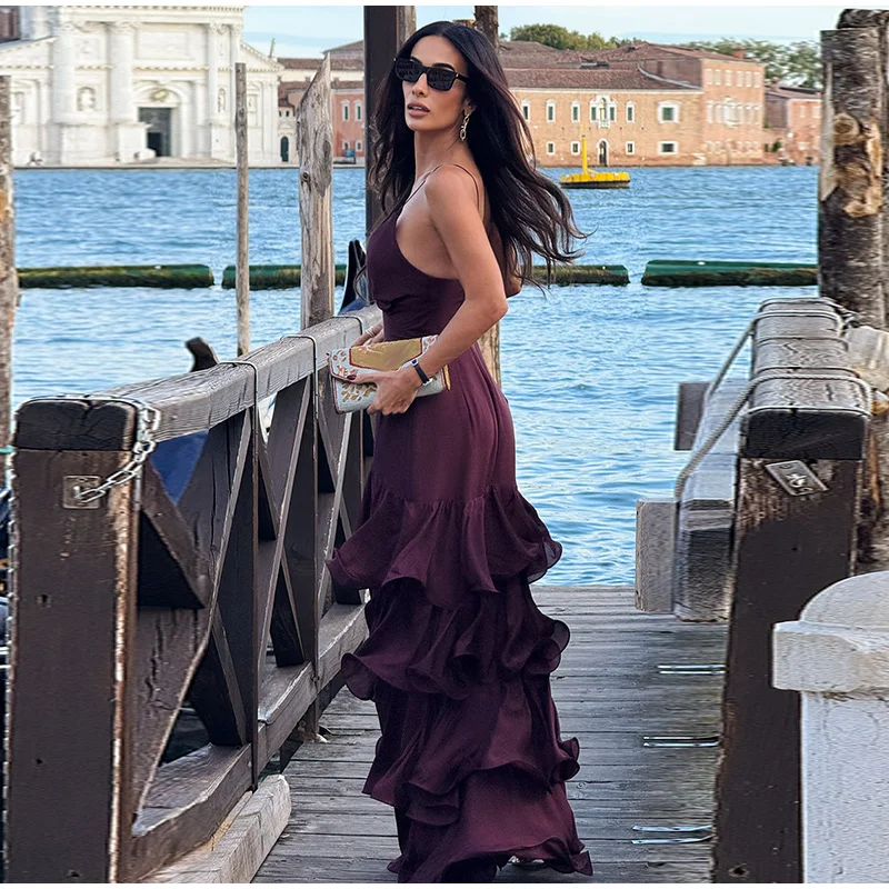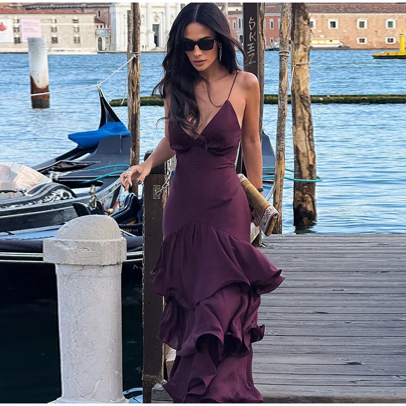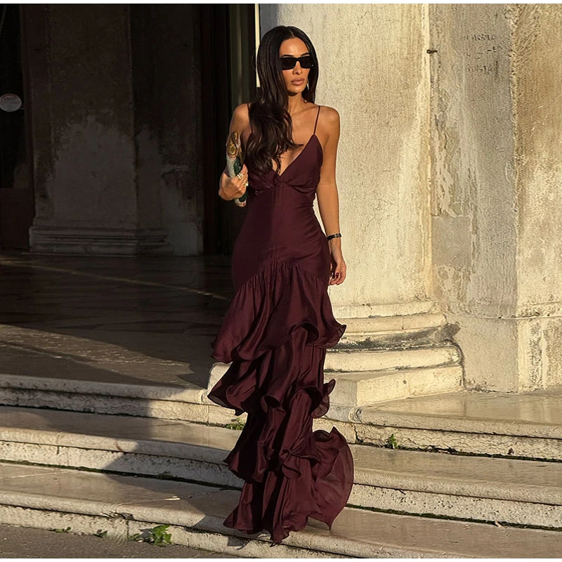 Fleepmart Sexy Solid Ruffles Sling Dress Women Sleeveless Backless Empire V-neck Long Party Dresses Female 2025 Autumn Lady A-line Robes