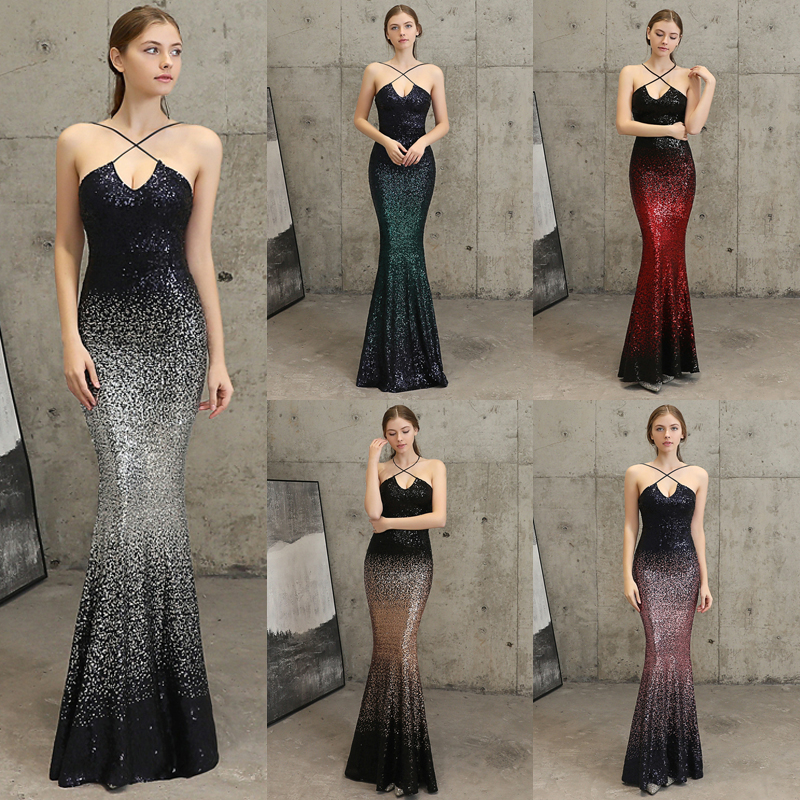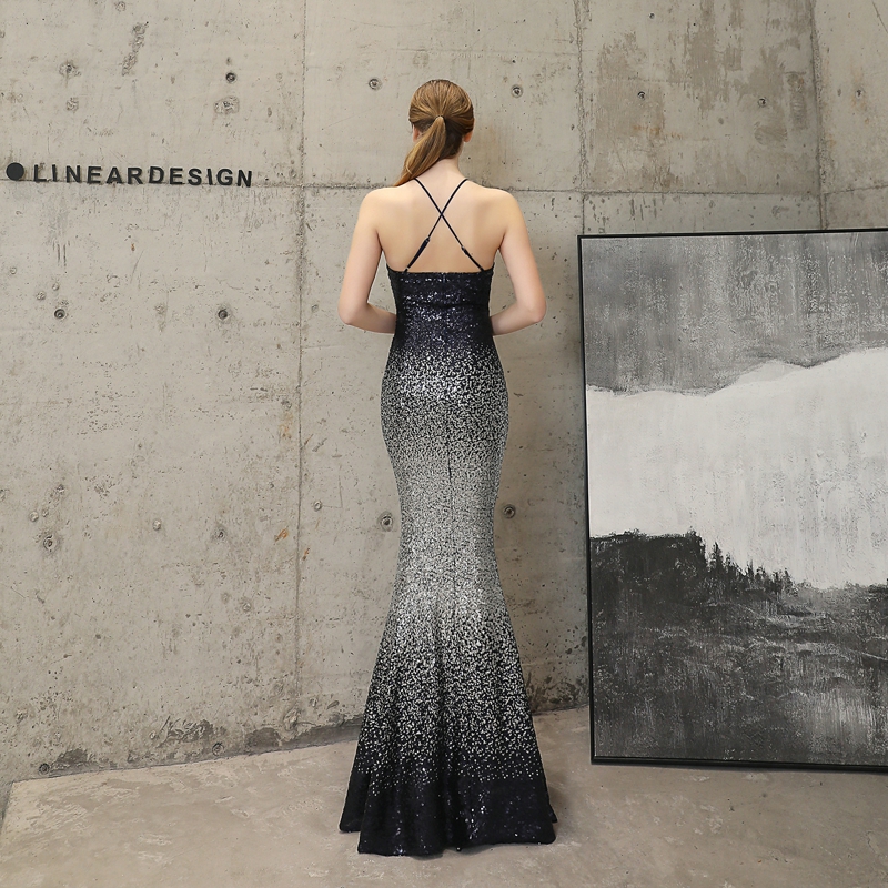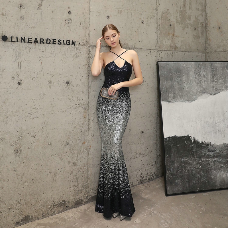 Fleepmart Sexy Strap Cross Back Sequins Evening Dress Backless Long Evening Party Dress