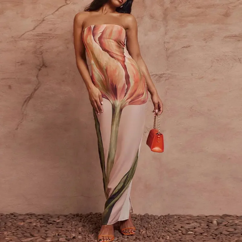 Fleepmart Sexy Strapless Backless Printed Long Dress Women Fashion Sleeveless Off Shoulder Vestidos 2025 Summer Lady Party Evening Robes