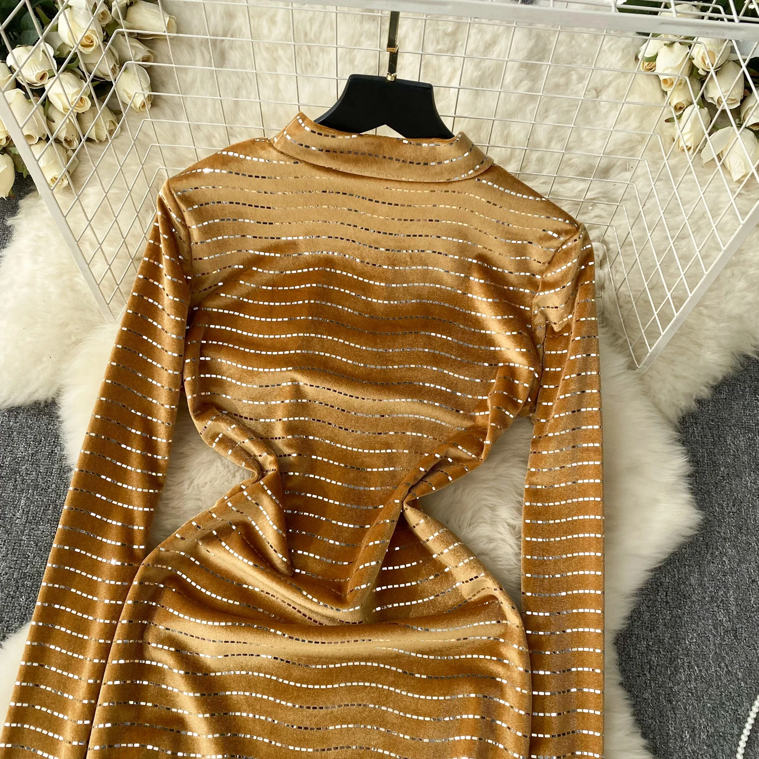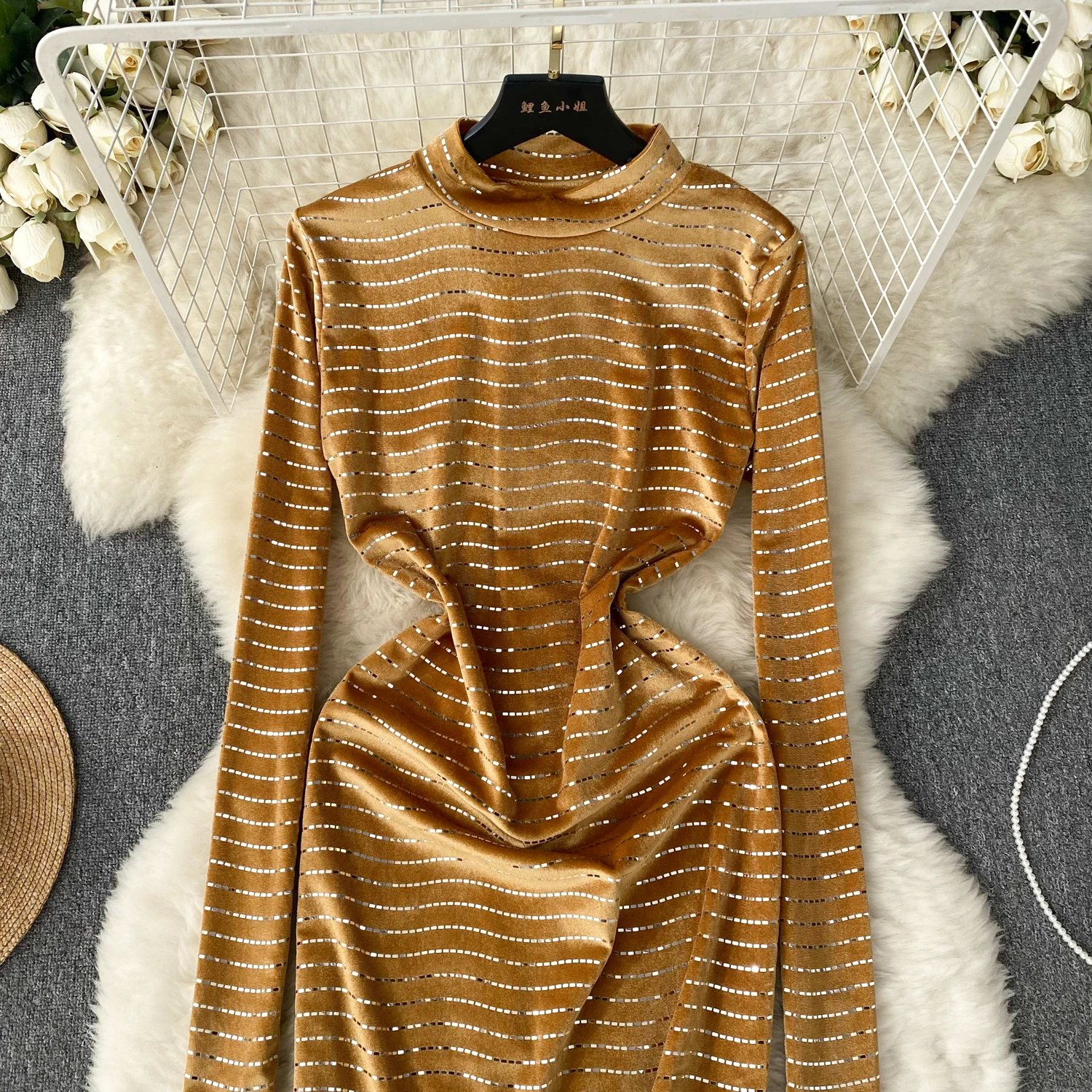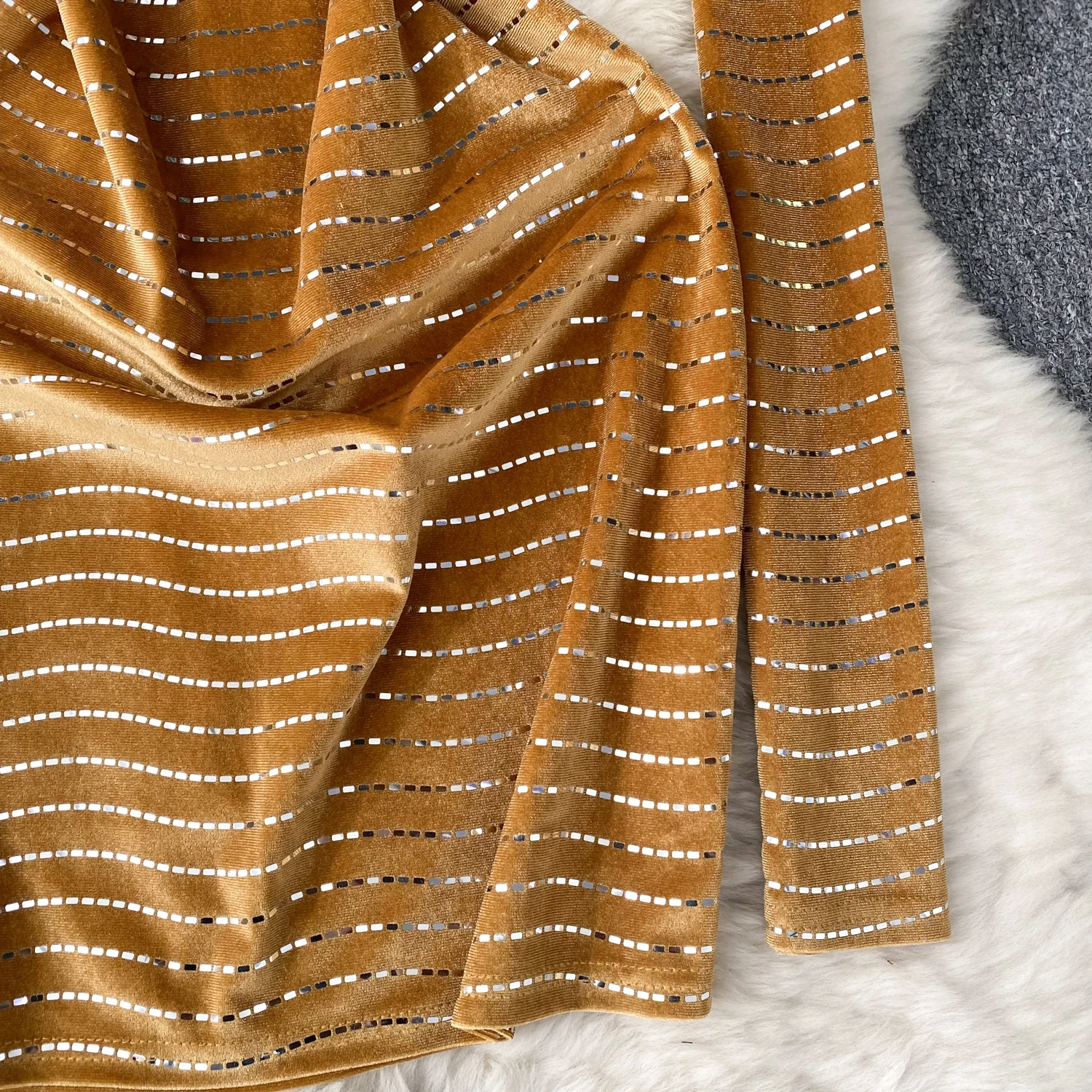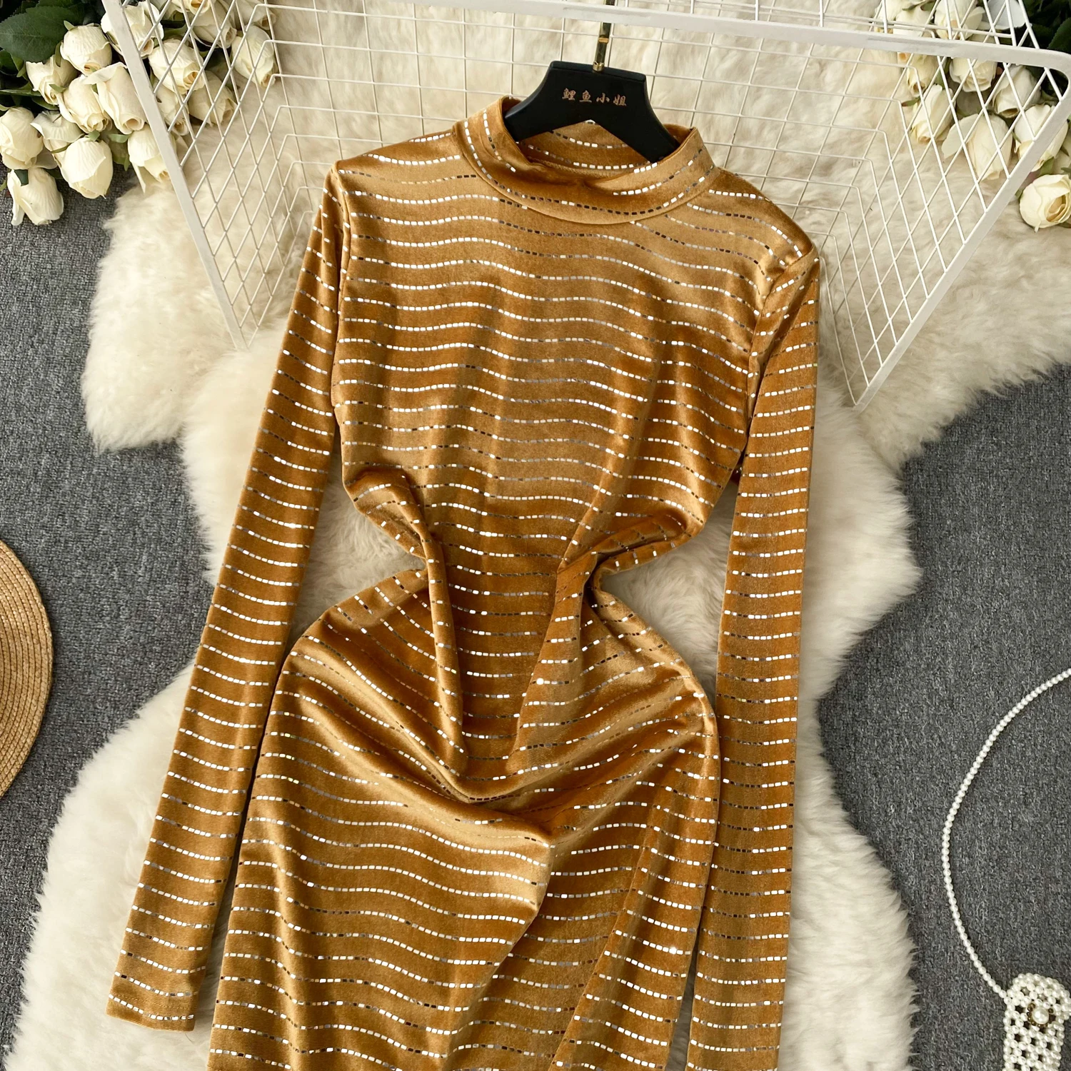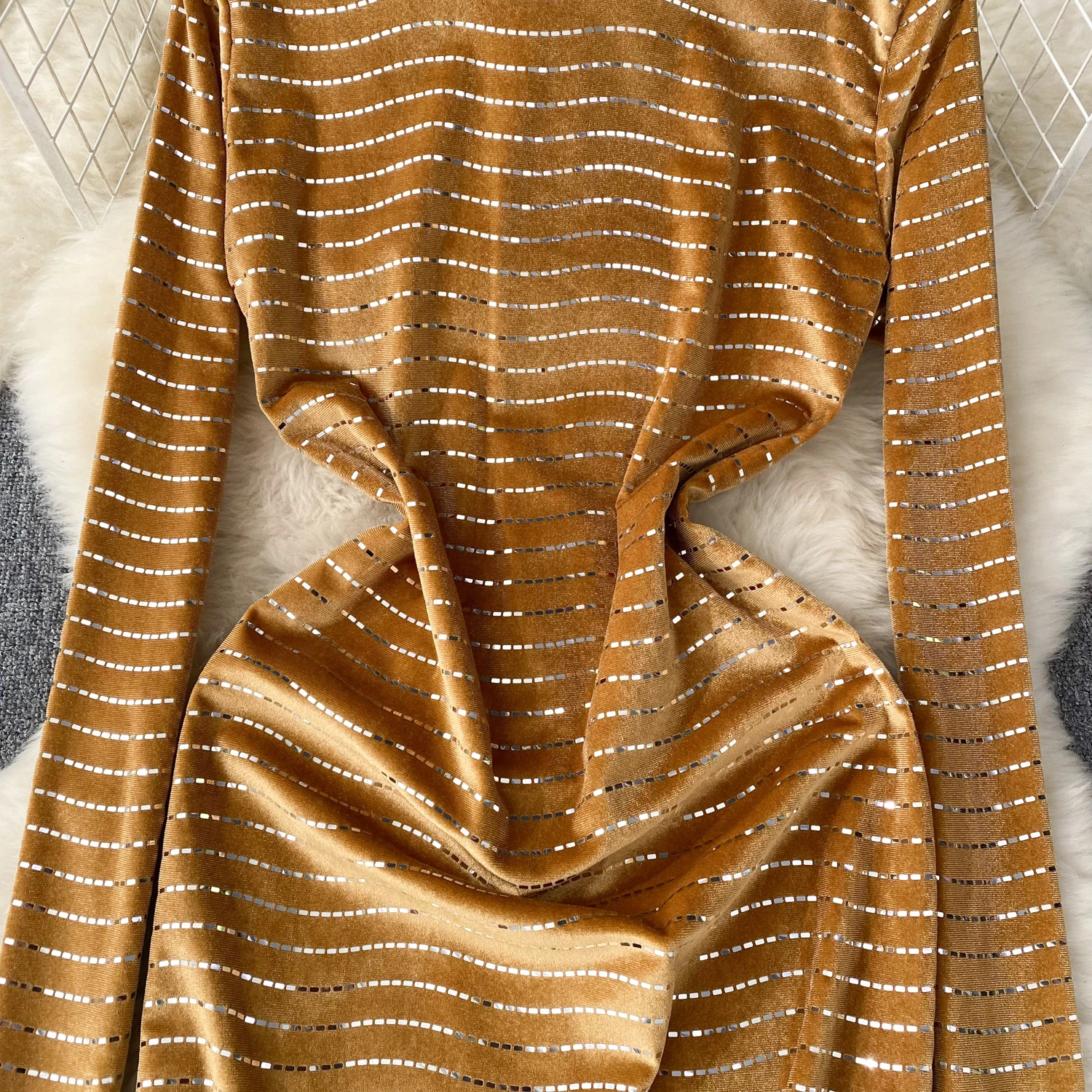 fleepmart Sexy Striped Sequin Velvet Long Sleeve Turtleneck Elastic Dress Spring 2024 Fashion Elegant Slim Bodycon Party Nightclub Dresses