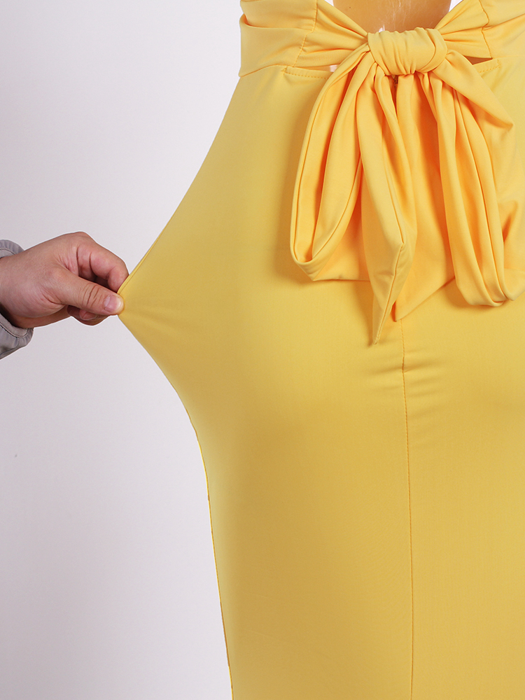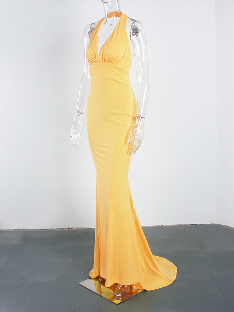Fleepmart Sexy Summer Evening Party Dress Deep V Neck Halter Sleeveless Backless Sash Stretch Orange Yellow Long Gown