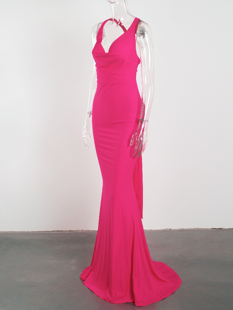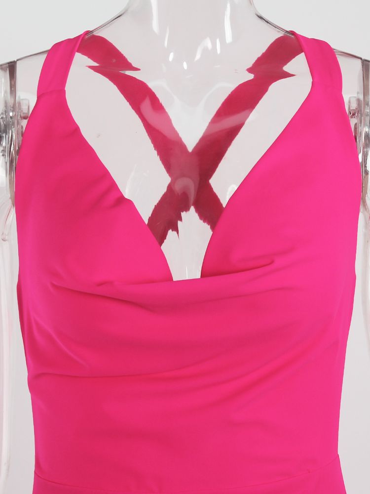 Fleepmart Sexy Summer Hot Pink Evening Party Mermaid Dress Deep Cowl Neck Cross Back Sleeveless Backless Sash Stretch Prom Gown