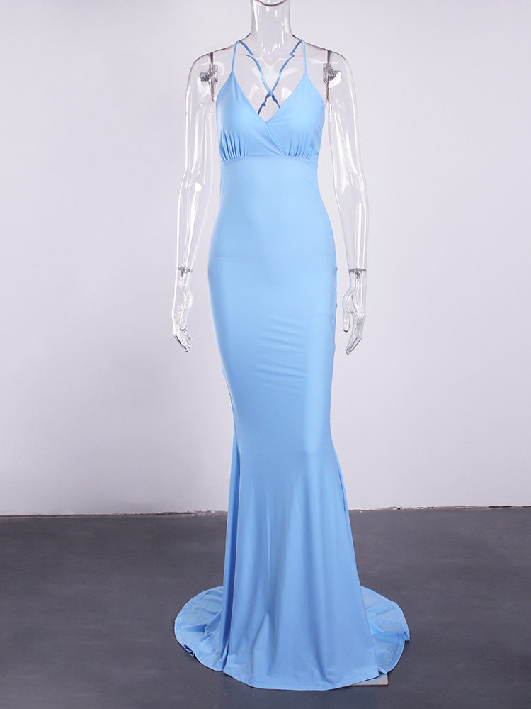 Fleepmart Sexy Summer Sky Blue Evening Party Mermaid Dress V Neck Lace Up Hollow Out Sleeveless Bodycon Stretch Prom Mermaid Gown