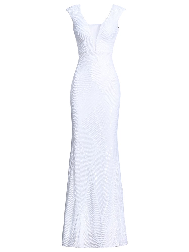 Fleepmart Sexy V Neck Backless Sequin Evening Dress 2021 New Women Party White Bodycon Maxi Dress