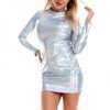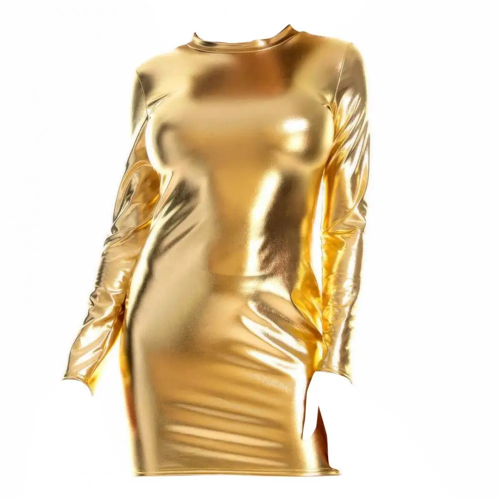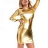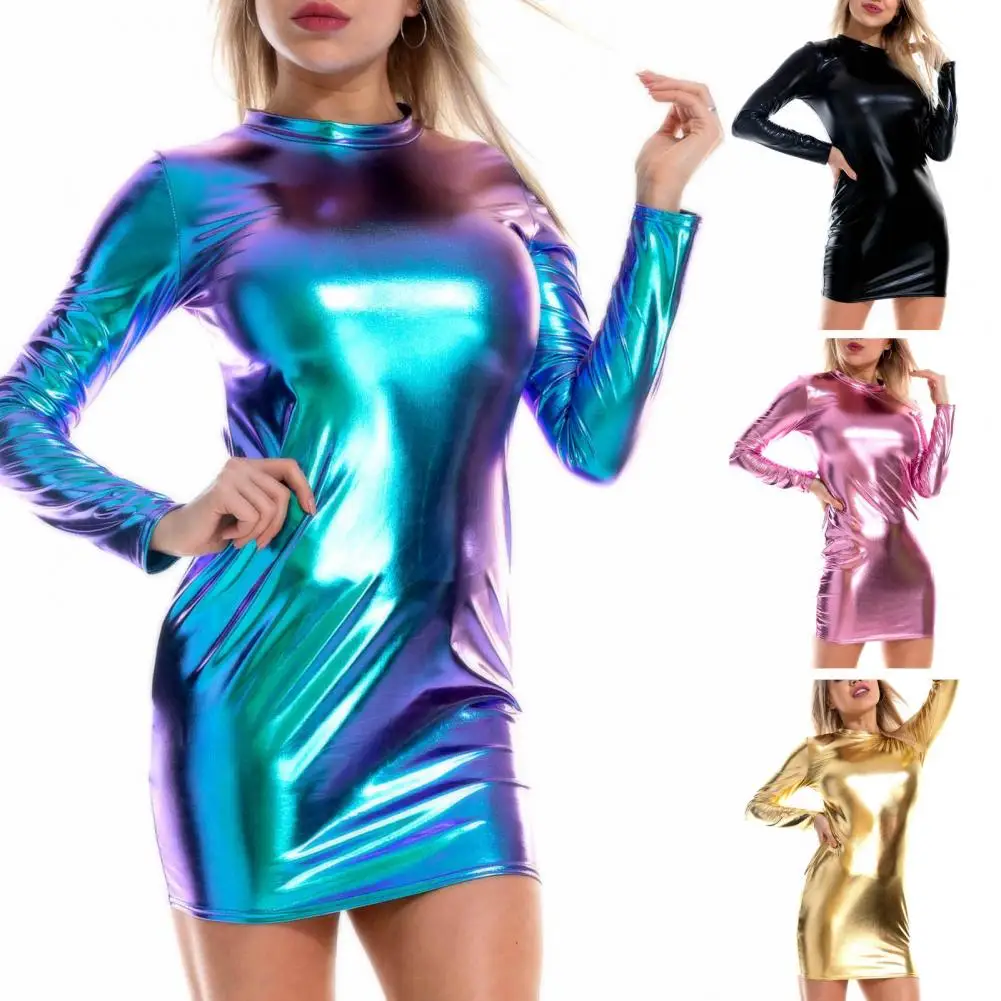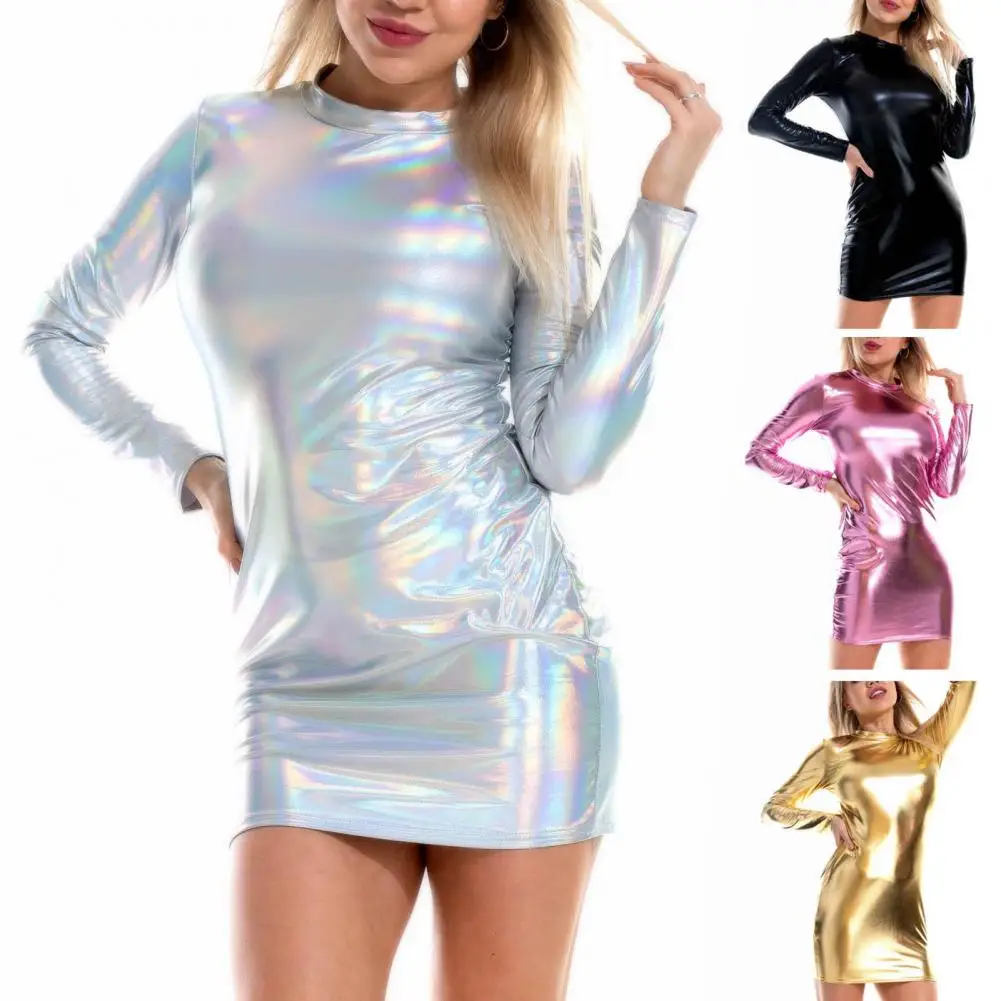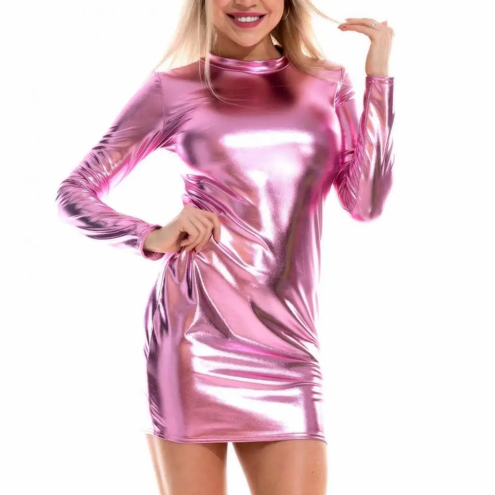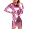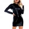 Fleepmart Smooth Faux Leather Women Sexy Sheath Glossy Skinny Long Sleeve Nightclub Party Mini Dress