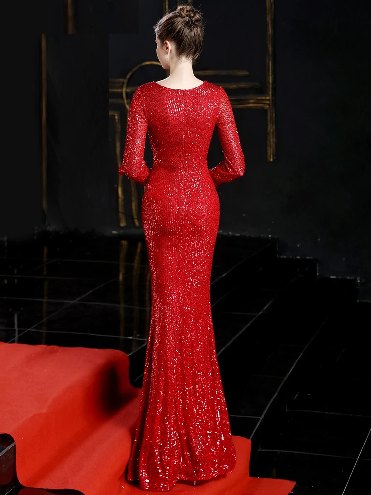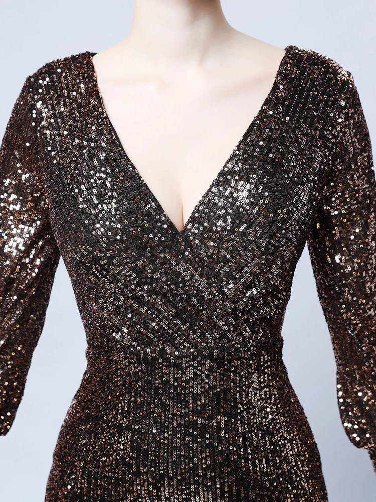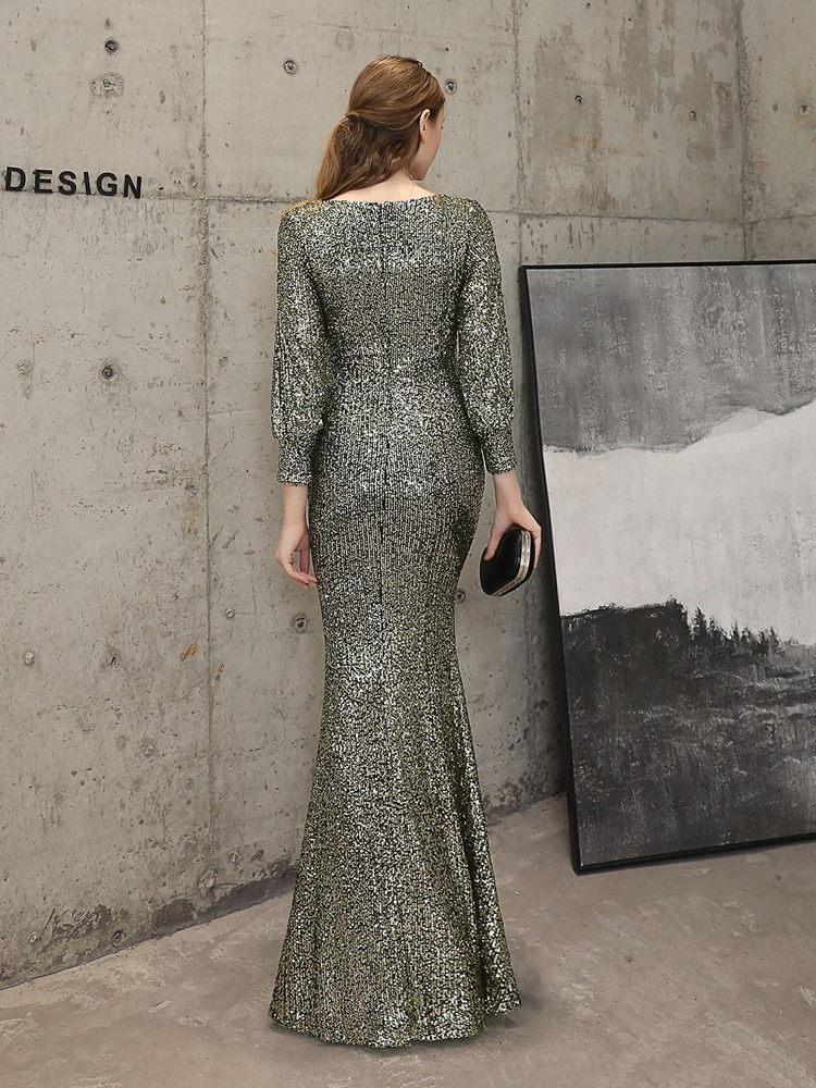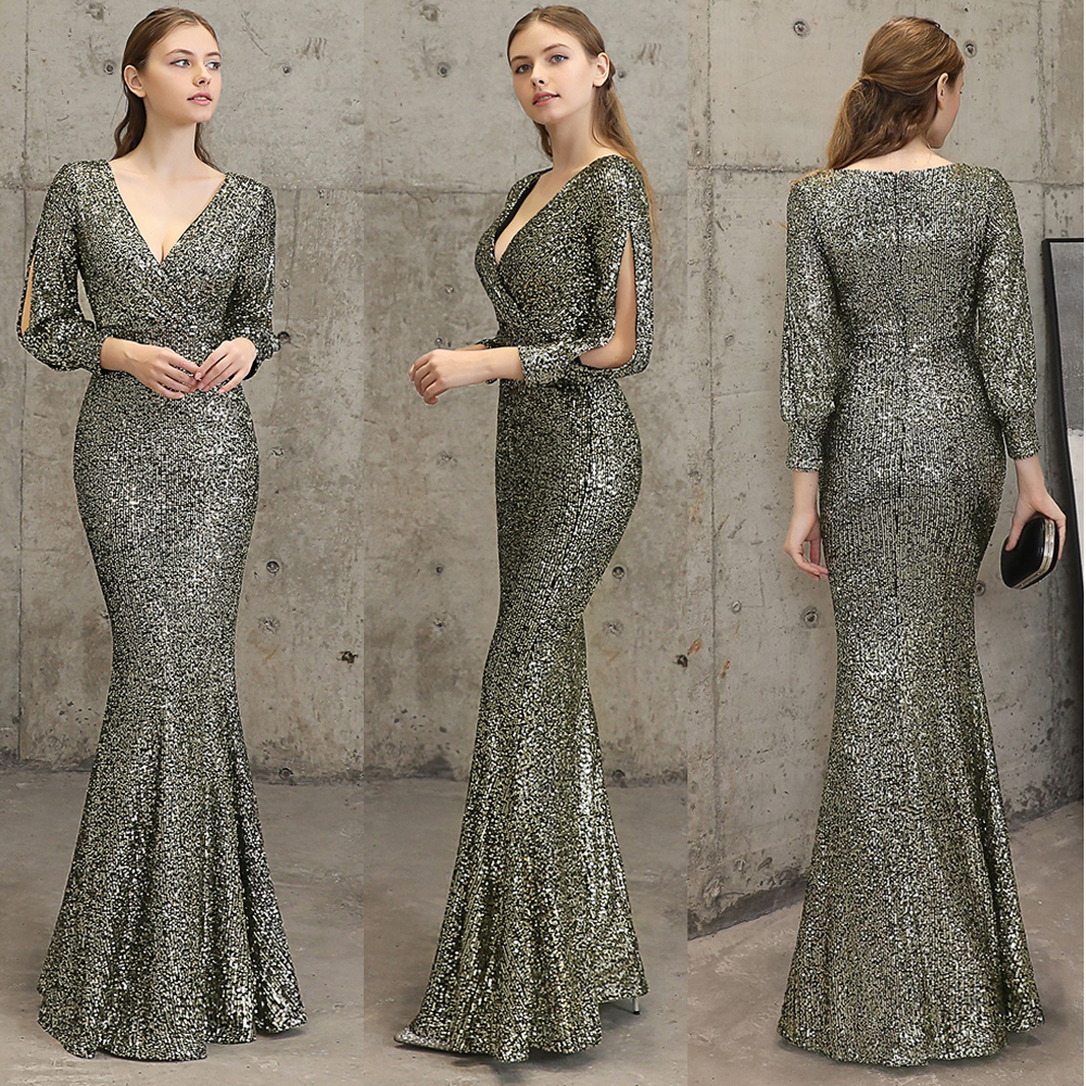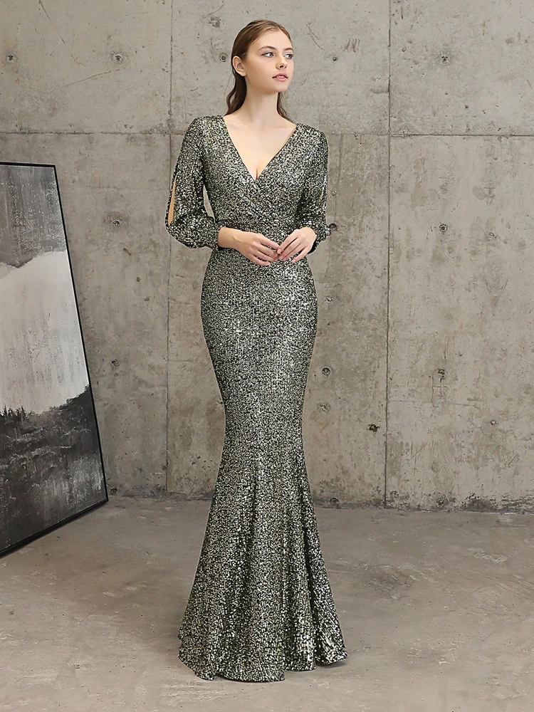 Fleepmart Sexy V Neck Mermaid Evening Dress Long Formal Prom Party Gown Full Sequin long Sleeve Galadress Vestidos Occassion Dress