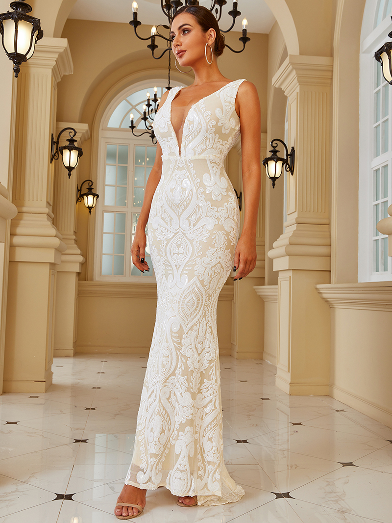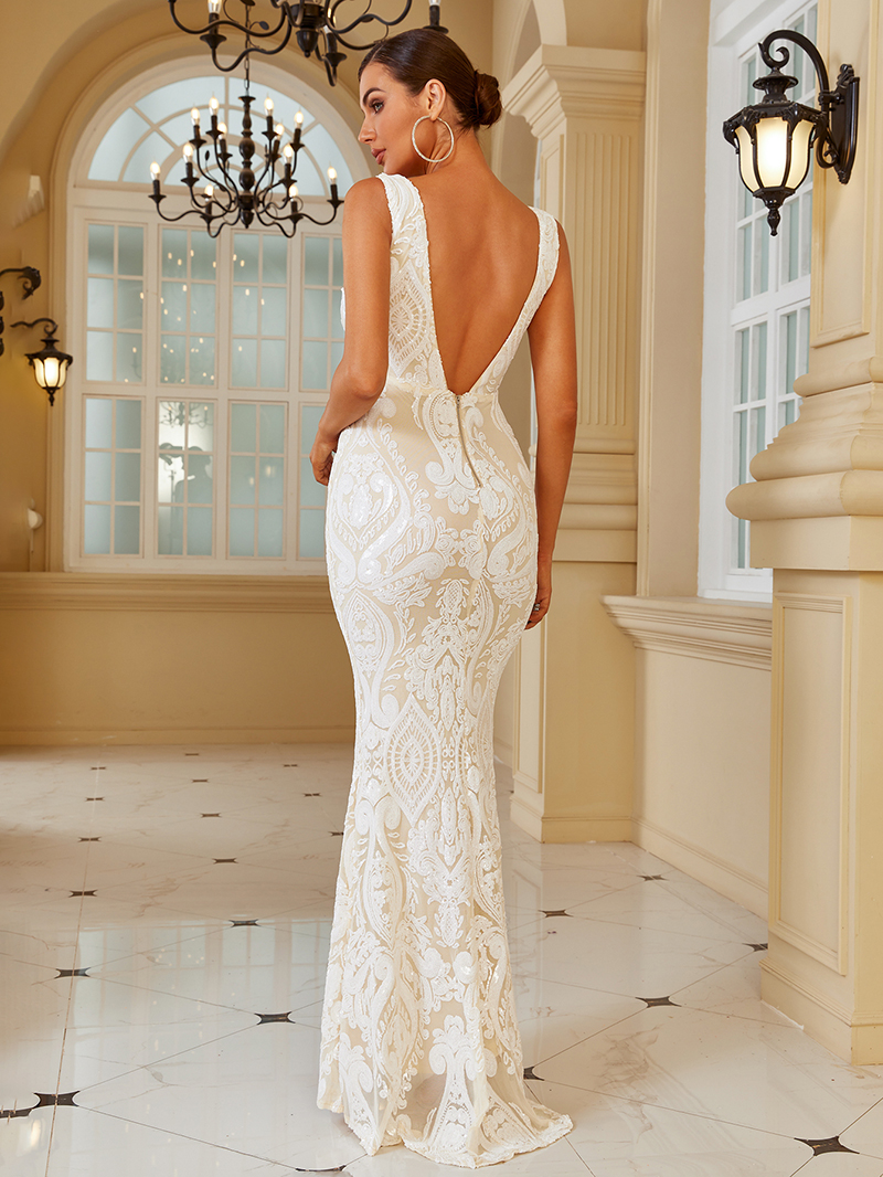Fleepmart Sexy V-neck Sleeveless Sequin Fish Tail Evening Party Maxi Dress